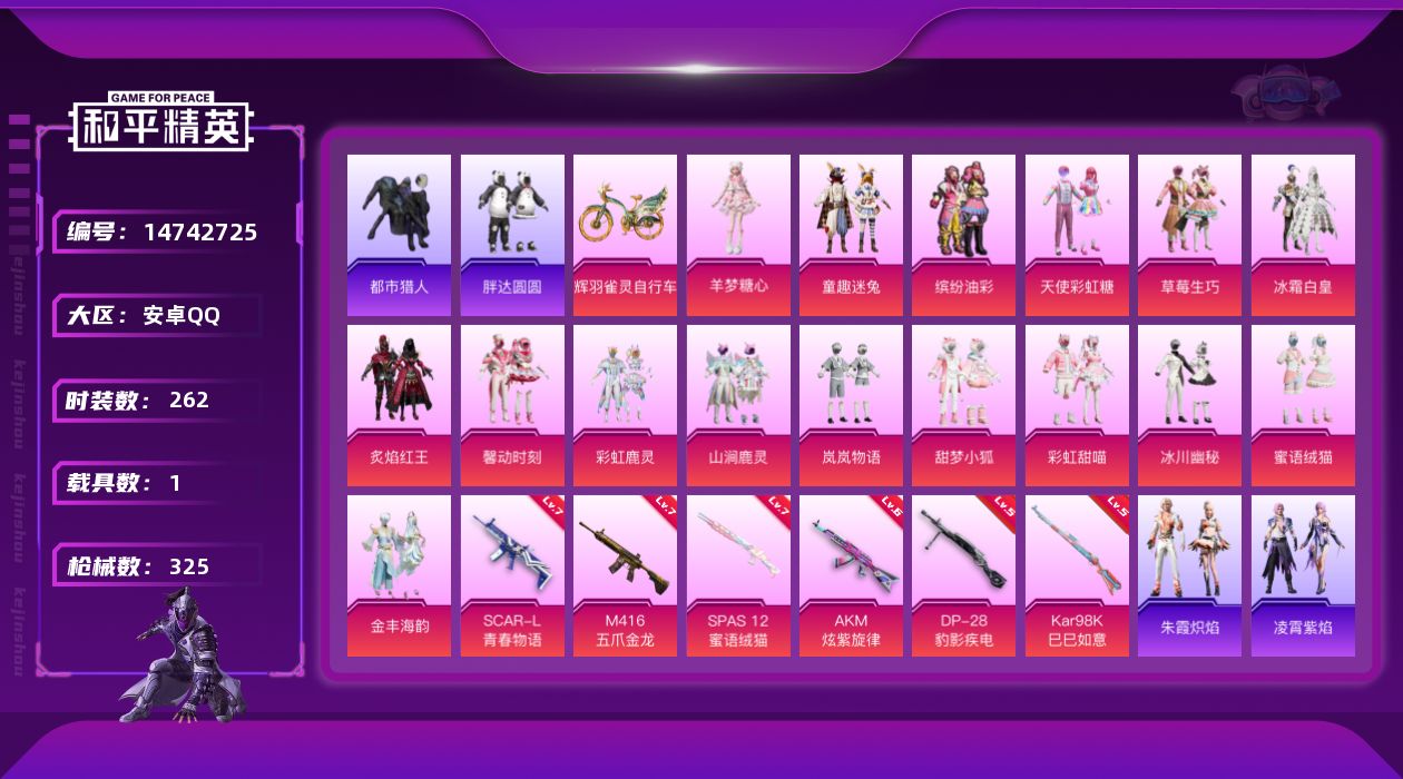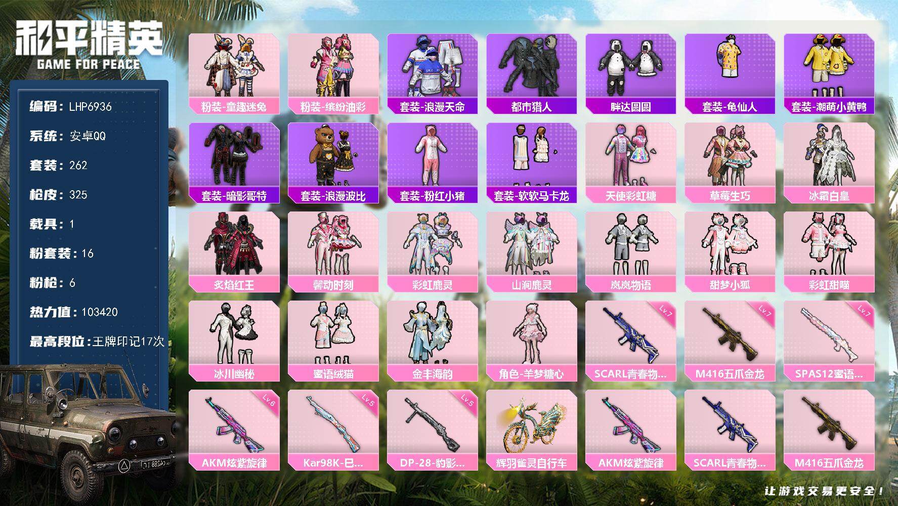 [14742725]可二次【店主推荐捡漏号!可直接换绑】/素材身法号 安卓 手Q-16粉装-6特效枪-1载具-2粉色飞行器-10.3w热力值-17王牌印记-262套装-325枪皮【热门品类】:粉装-童趣迷兔,粉装-缤纷油彩,套装-浪漫天命,套装-都市猎人,套装-胖达圆圆,套装-龟仙人,套装-潮萌小黄鸭,套装-暗影哥特,套装-浪漫波比,套装-粉红小猪,套装-软软马卡龙【粉色载具】:辉羽雀灵自行车【粉色套装】:粉装-天使彩虹糖,粉装-缤纷油彩,粉装-草莓生巧,粉装-冰霜白皇,粉装-童趣迷兔,粉装-炙焰红王,粉装-馨动时刻,粉装-彩虹鹿灵,粉装-山涧鹿灵,粉装-岚岚物语,粉装-甜梦小狐,粉装-彩虹甜喵,粉装-冰川幽秘,粉装-蜜语绒猫,粉装-金丰海韵,角色-羊梦糖心【粉色枪皮等级】:AKM-炫紫旋律(六级),SCAR-L-青春物语(七级),M416-五爪金龙(七级),Kar98K-巳巳如意(五级),SPAS-12-蜜语绒猫(七级),DP-28-豹影疾电(五级)【粉色飞行器】:星夜魔法师飞行翼,雀灵庇佑飞行器
