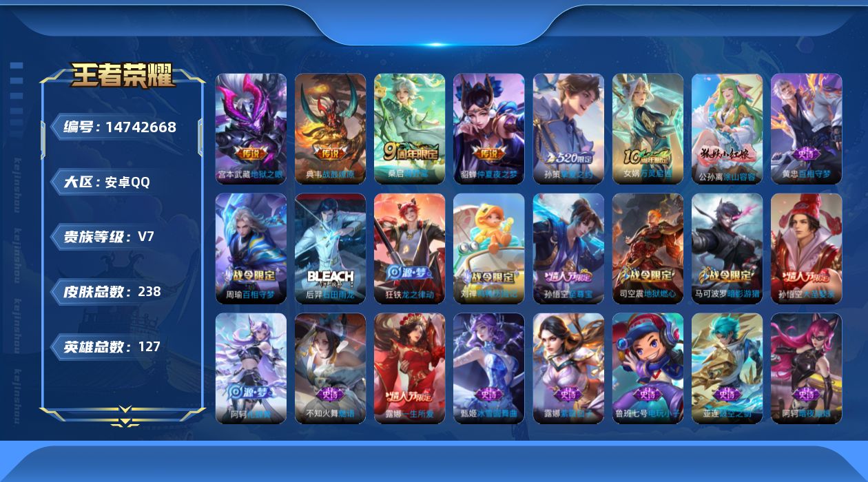 [14742668]可二次【店主推荐捡漏号!可直接换绑】安卓Q-V7-最强王者段位-127英雄-238皮肤-5传说-61史诗