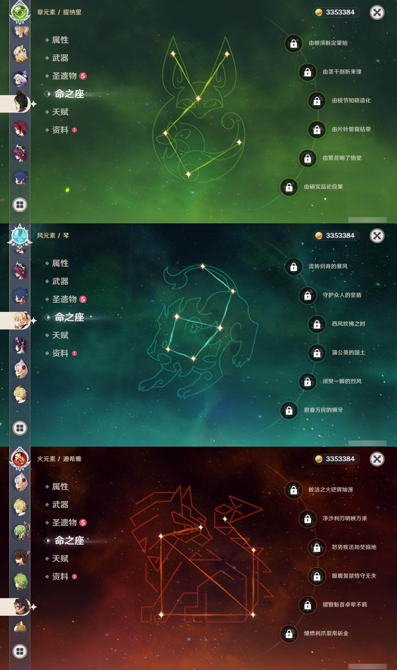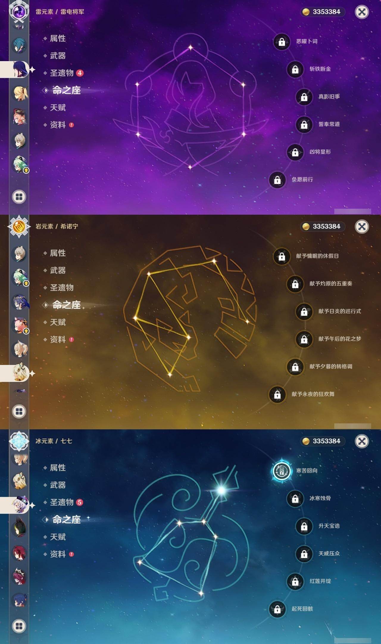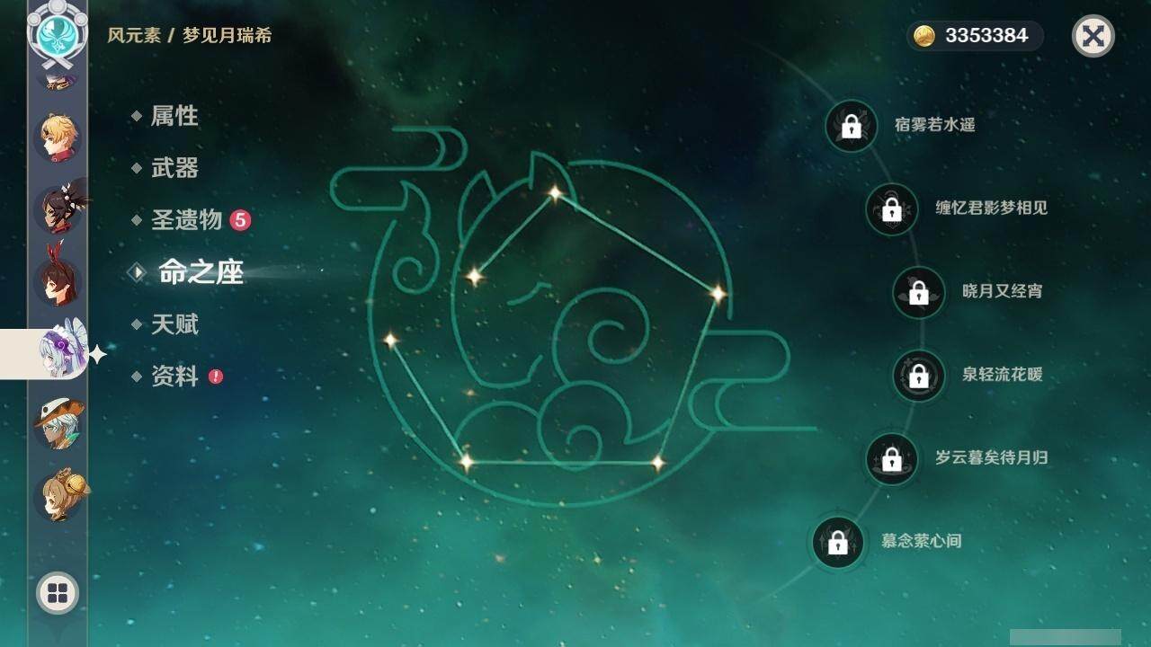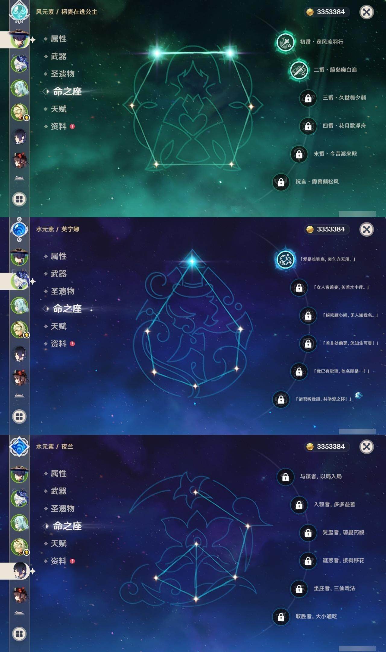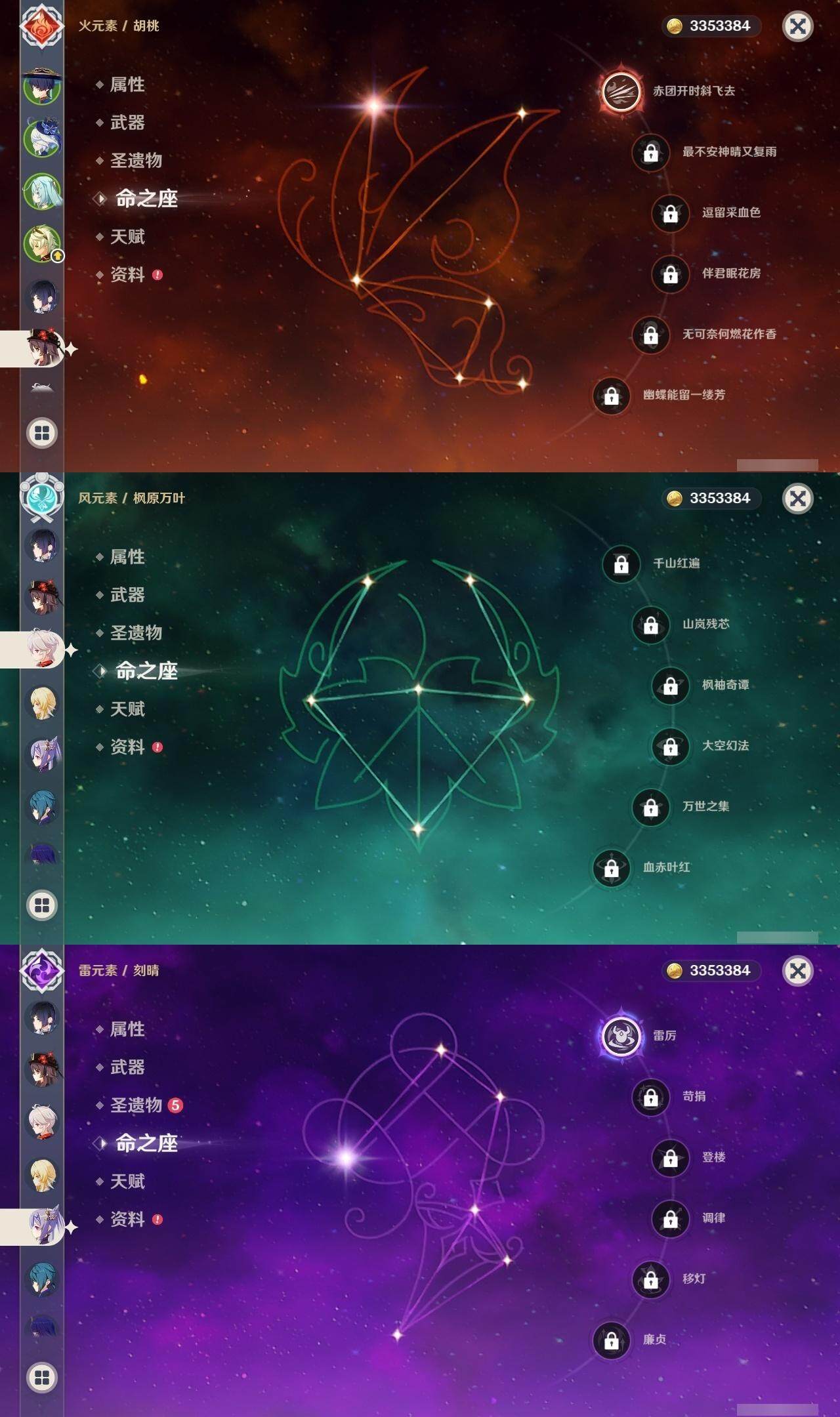 1命芙宁娜,0命迪希雅,2命流浪者,0命提纳里,0命夜兰,0命雷电将军,0命枫原万叶,1命胡桃,1命刻晴,1命七七,0命琴,0命希诺宁,0命梦见月瑞希,精1图莱杜拉的回忆,精1飞雷之弦振,精1天空之翼,精1天空之傲