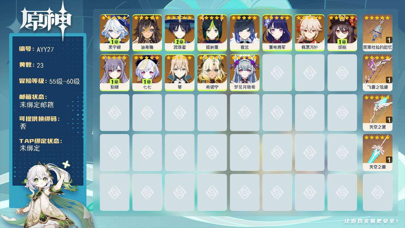 [14742778]57级/23黄/女主/13个五星角色/4个五星武器 1命芙宁娜,0命迪希雅,2命流浪者,0命提纳里,0命夜兰,0命雷电将军,0命枫原万叶,1命胡桃,1命刻晴,1命七七,0命琴,0命希诺宁,0命梦见月瑞希,精1图莱杜拉的回忆,精1飞雷之弦振,精1天空之翼,精1天空之傲