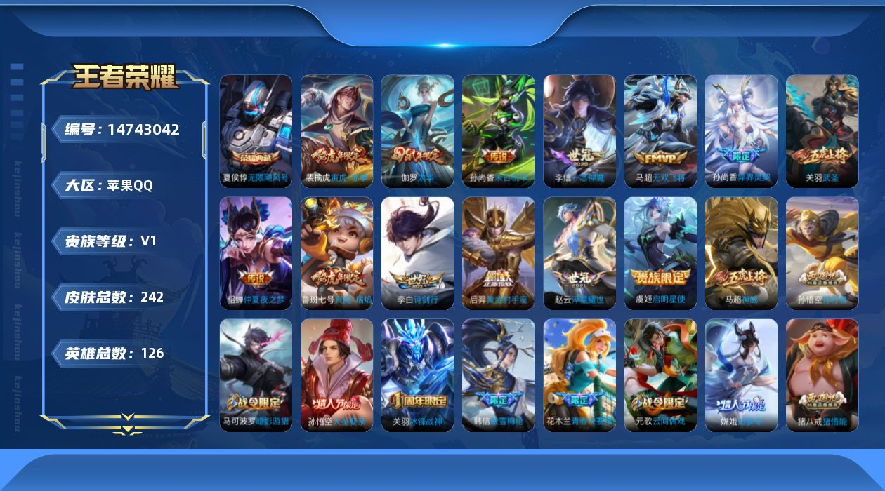 [14743042]苹果Q-V0-永恒钻石II段位-126英雄-242皮肤-1典藏皮肤-13传说-79史诗 【荣耀典藏】:夏侯惇无限飓风号 【传说皮肤】:李白诗剑行,马超无双飞将,裴擒虎寅虎赤拳,鲁班七号寅虎瑞焰,孙尚香异界灵契,赵云淬星耀世,虞姬启明星使,关羽武圣,李信一念神魔,伽罗太华,后羿黄金射手座,貂蝉仲夏夜之梦,孙尚香末日机甲 【限定皮肤】:白起狰,狄仁杰阴阳师,虞姬凯尔特女王,廉颇寅虎御盾,赵云皇家上将,墨子神迹守卫,妲己时之彼端,孙尚香异界灵契,鲁班七号狮舞东方,鲁班七号寅虎瑞焰,庄周高山流水,高渐离玩趣恶龙,阿轲迷踪丽影,钟无艳超时空战士,孙膑寅虎展翼,白起夜都怪侠,芈月重明,芈月幻夜卜梦,元歌云间偶戏,夏侯惇朔风刀,甄姬女儿国国王,甄姬落雪兰心,曹操烛龙,典韦穷奇,马可波罗暗影游猎,狄仁杰魔术师,狄仁杰万华元夜,达摩星际陆战队,达摩沙漠行僧,项羽海滩派对,老夫子醍醐杖,老夫子航海奇遇记,关羽冰锋战神,关羽武圣,程咬金演武夺筹,露娜一生所爱,刘邦夺宝奇兵,韩信傲雪梅枪,兰陵王金庭之子,花木兰青春决赛季,亚瑟潮玩骑士王,孙悟空大圣娶亲,孙悟空孙行者,牛魔御旌,后羿如梦令,后羿圣弓游侠,李元芳云中旅人,虞姬启明星使,钟馗神迹守卫,钟馗驱傩正仪,杨玉环遇见飞天,杨玉环寅虎心曲,干将莫邪真爱魔法,雅典娜黎明之约,太乙真人饕餮,鬼谷子原初探秘者,鬼谷子五谷丰年,黄忠火炮绅士,苏烈千军破阵,百里玄策原初追逐者,弈星混沌棋,梦奇顽趣,公孙离蜜橘之夏,沈梦溪大漠名商,明世隐疑决卦,明世隐吟游魔法,裴擒虎寅虎赤拳,裴擒虎擒涛扼浪,狂铁御狮,米莱狄御霄,米莱狄胡桃异想国,云中君时之祈愿,伽罗太华,伽罗天狼溯光者,盾山御銮,猪八戒猪悟能,上官婉儿梁祝,嫦娥如梦令,嫦娥拒霜思,鲁班大师探海日志,镜匿光追影者,桑启海盐诗旅,艾琳女武神,张良古海寻踪,蒙恬荣光圣徽,鬼谷子天穹祈灯,刘邦剑破天穹,周瑜熔金海岸 【年限皮肤】:裴擒虎寅虎赤拳,孙膑寅虎展翼,鲁班七号寅虎瑞焰,杨玉环寅虎心曲,廉颇寅虎御盾,伽罗太华,马超神威,关羽武圣 【赛季限定】:白起狰,芈月重明,夏侯惇朔风刀,曹操烛龙,典韦穷奇,狄仁杰万华元夜,达摩沙漠行僧,老夫子醍醐杖,程咬金演武夺筹,兰陵王金庭之子,张良古海寻踪,牛魔御旌,李元芳云中旅人,虞姬凯尔特女王,钟馗驱傩正仪,雅典娜黎明之约,太乙真人饕餮,鬼谷子原初探秘者,苏烈千军破阵