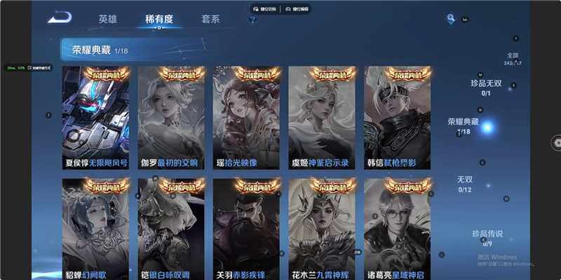 虞姬凯尔特女王,白起狰,太乙真人饕餮,曹操烛龙,芈月重明,典韦穷奇,狂铁御狮,米莱狄御霄,牛魔御旌,盾山御銮,夏侯惇朔风刀,明世隐疑决卦,老夫子醍醐杖,鬼谷子原初探秘者,狄仁杰万华元夜,程咬金演武夺筹,钟馗驱傩正仪,苏烈千军破阵,钟馗神迹守卫,鲁班七号狮舞东方,刘邦夺宝奇兵,马可波罗暗影游猎,元歌云间偶戏,弈星混沌棋,达摩沙漠行僧,兰陵王金庭之子,沈梦溪大漠名商,李元芳云中旅人,桑启海盐诗旅,裴擒虎擒涛扼浪,鲁班大师探海日志,张良古海寻踪