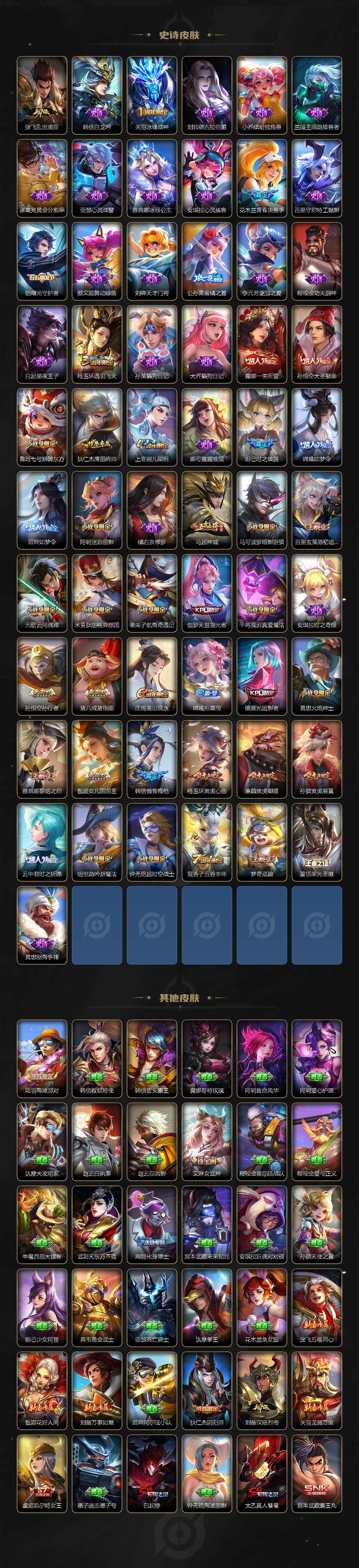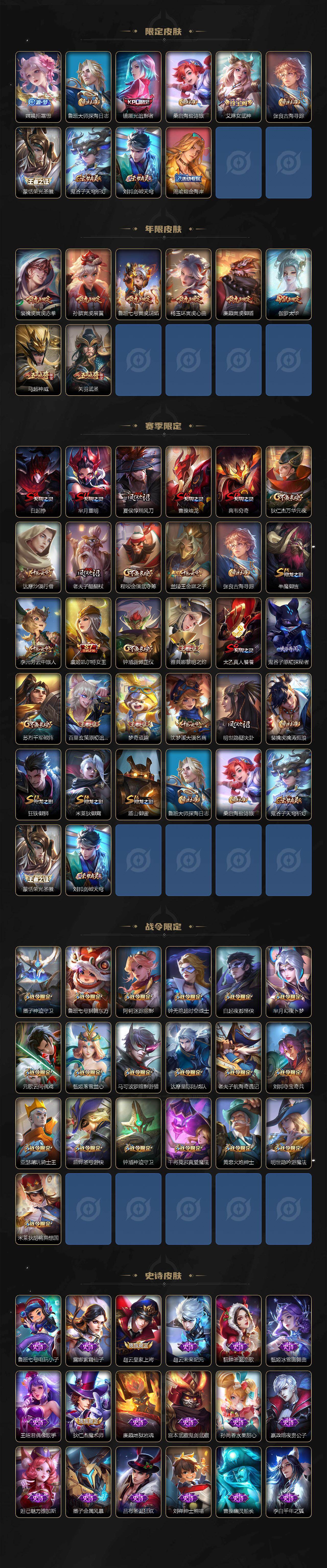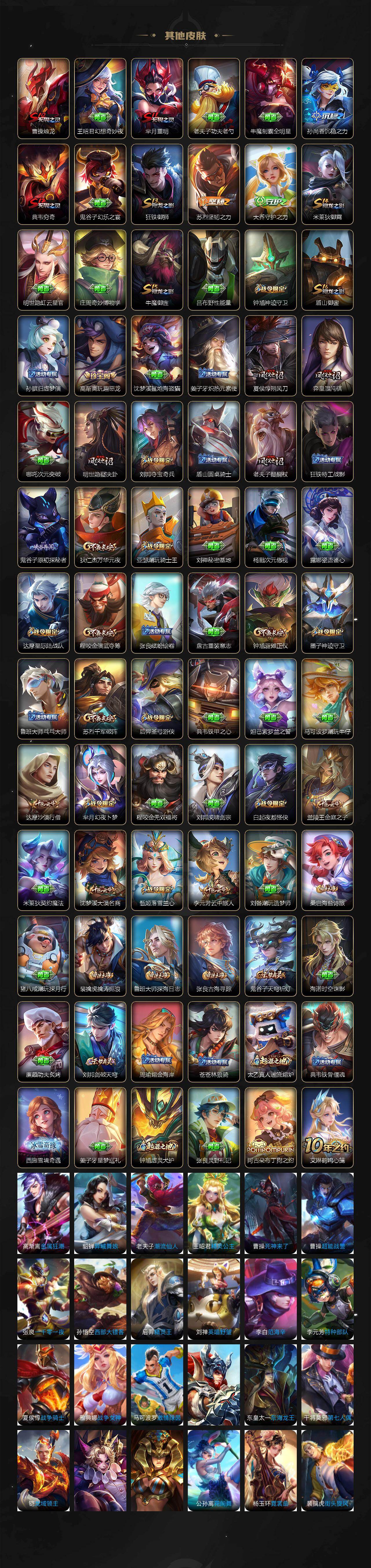 【限定皮肤】:白起狰,狄仁杰阴阳师,虞姬凯尔特女王,廉颇寅虎御盾,赵云皇家上将,墨子神迹守卫,妲己时之彼端,孙尚香异界灵契,鲁班七号狮舞东方,鲁班七号寅虎瑞焰,庄周高山流水,高渐离玩趣恶龙,阿轲迷踪丽影,钟无艳超时空战士,孙膑寅虎展翼,白起夜都怪侠,芈月重明,芈月幻夜卜梦,元歌云间偶戏,夏侯惇朔风刀,甄姬女儿国国王,甄姬落雪兰心,曹操烛龙,典韦穷奇,马可波罗暗影游猎,狄仁杰魔术师,狄仁杰万华元夜,达摩星际陆战队,达摩沙漠行僧,项羽海滩派对,老夫子醍醐杖,老夫子航海奇遇记,关羽冰锋战神,关羽武圣,程咬金演武夺筹,露娜一生所爱,刘邦夺宝奇兵,韩信傲雪梅枪,兰陵王金庭之子,花木兰青春决赛季,亚瑟潮玩骑士王,孙悟空大圣娶亲,孙悟空孙行者,牛魔御旌,后羿如梦令,后羿圣弓游侠,李元芳云中旅人,虞姬启明星使,钟馗神迹守卫,钟馗驱傩正仪,杨玉环遇见飞天,杨玉环寅虎心曲,干将莫邪真爱魔法,雅典娜黎明之约,太乙真人饕餮,鬼谷子原初探秘者,鬼谷子五谷丰年,黄忠火炮绅士,苏烈千军破阵,百里玄策原初追逐者,弈星混沌棋,梦奇顽趣,公孙离蜜橘之夏,沈梦溪大漠名商,明世隐疑决卦,明世隐吟游魔法,裴擒虎寅虎赤拳,裴擒虎擒涛扼浪,狂铁御狮,米莱狄御霄,米莱狄胡桃异想国,云中君时之祈愿,伽罗太华,伽罗天狼溯光者,盾山御銮,猪八戒猪悟能,上官婉儿梁祝,嫦娥如梦令,嫦娥拒霜思,鲁班大师探海日志,镜匿光追影者,桑启海盐诗旅,艾琳女武神,张良古海寻踪,蒙恬荣光圣徽,鬼谷子天穹祈灯,刘邦剑破天穹,周瑜熔金海岸