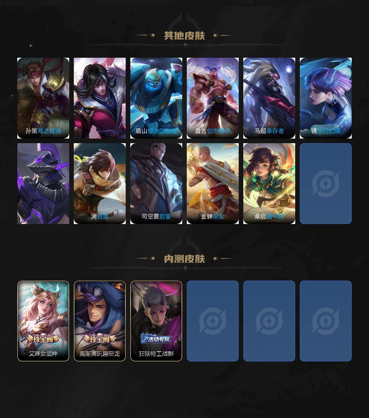 关羽冰锋战神,上官婉儿梁祝,关羽武圣,马超神威,伽罗太华,伽罗天狼溯光者,孙悟空大圣娶亲,露娜一生所爱,后羿如梦令,嫦娥如梦令,花木兰青春决赛季,妲己时之彼端,公孙离蜜橘之夏,猪八戒猪悟能,廉颇寅虎·御盾,孙尚香异界灵契,孙悟空孙行者,甄姬女儿国国王,镜匿光追影者,韩信傲雪梅枪,鲁班七号寅虎·瑞焰,孙膑寅虎·展翼,杨玉环寅虎·心曲,裴擒虎寅虎·赤拳,云中君时之祈愿,李白诗剑行