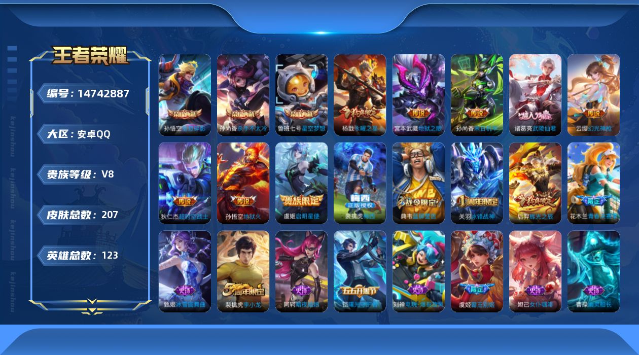 [14742887]【店主推荐捡漏号!可直接换绑】安卓Q-V8-至尊星耀III段位-123英雄-207皮肤-3典藏皮肤-9传说-40史诗 【英雄全皮】:影全皮 【荣耀典藏】:孙悟空全息碎影,孙尚香杀手不太冷,鲁班七号星空梦想 【传说皮肤】:后羿神树通天,云缨幻光神枪,虞姬启明星使,杨戬永曜之星,诸葛亮武陵仙君,孙尚香末日机甲,宫本武藏地狱之眼,孙悟空地狱火,狄仁杰超时空战士 【限定皮肤】:姜子牙天穹之誓,狄仁杰阴阳师,赵云皇家上将,孙尚香蔷薇恋人,高渐离死亡摇滚,芈月重明,夏侯惇朔风刀,曹操烛龙,典韦穷奇,典韦蓝屏警告,狄仁杰魔术师,狄仁杰万华元夜,达摩沙漠行僧,项羽海滩派对,老夫子醍醐杖,关羽冰锋战神,程咬金演武夺筹,兰陵王金庭之子,花木兰青春决赛季,牛魔御旌,后羿辉光之辰,李元芳云中旅人,虞姬霸王别姬,虞姬启明星使,钟馗驱傩正仪,杨玉环遇见飞天,杨戬永曜之星,女娲朔望之晖,蔡文姬繁星吟游,鬼谷子原初探秘者,诸葛亮武陵仙君,苏烈千军破阵,弈星混沌棋,沈梦溪大漠名商,明世隐疑决卦,裴擒虎李小龙,裴擒虎擒涛扼浪,狂铁御狮,米莱狄御霄,盾山御銮,上官婉儿梁祝,鲁班大师探海日志,桑启海盐诗旅,张良古海寻踪,裴擒虎梅西,鬼谷子天穹祈灯,刘邦剑破天穹 【年限皮肤】:杨戬永曜之星,后羿辉光之辰 【赛季限定】:芈月重明,夏侯惇朔风刀,曹操烛龙,典韦穷奇,狄仁杰万华元夜,达摩沙漠行僧,老夫子醍醐杖,程咬金演武夺筹,兰陵王金庭之子,张良古海寻踪,牛魔御旌,李元芳云中旅人,钟馗驱傩正仪,鬼谷子原初探秘者,苏烈千军破阵,弈星混沌棋,沈梦溪大漠名商,明世隐疑决卦,裴擒虎擒涛扼浪,狂铁御狮,米莱狄御霄,盾山御銮,鲁班大师探海日志,桑启海盐诗旅,鬼谷子天穹祈灯,刘邦剑破天穹,姜子牙天穹之誓 【战令限定】:典韦蓝屏警告,女娲朔望之晖 【史诗皮肤】:阿轲暗夜猫娘,赵云皇家上将,貂蝉圣诞恋歌,甄姬冰雪圆舞曲,王昭君偶像歌手,狄仁杰魔术师,宫本武藏鬼剑武藏,孙尚香蔷薇恋人,孙尚香水果甜心,嬴政摇滚巨星,妲己魅力维加斯,妲己女仆咖啡,墨子龙骑士,墨子金属风暴,吕布圣诞狂欢,曹操幽灵船长,李白千年之狐,张飞乱世虎臣,虞姬霸王别姬,关羽冰锋战神,刘邦德古拉伯爵,小乔缤纷独角兽,兰陵王暗隐猎兽者,诸葛亮黄金分割率,雅典娜冰冠公主,后羿辉光之辰,花木兰青春决赛季,铠曙光守护者,裴擒虎梅西,白起星夜王子,杨玉环遇见飞天,大乔猫狗日