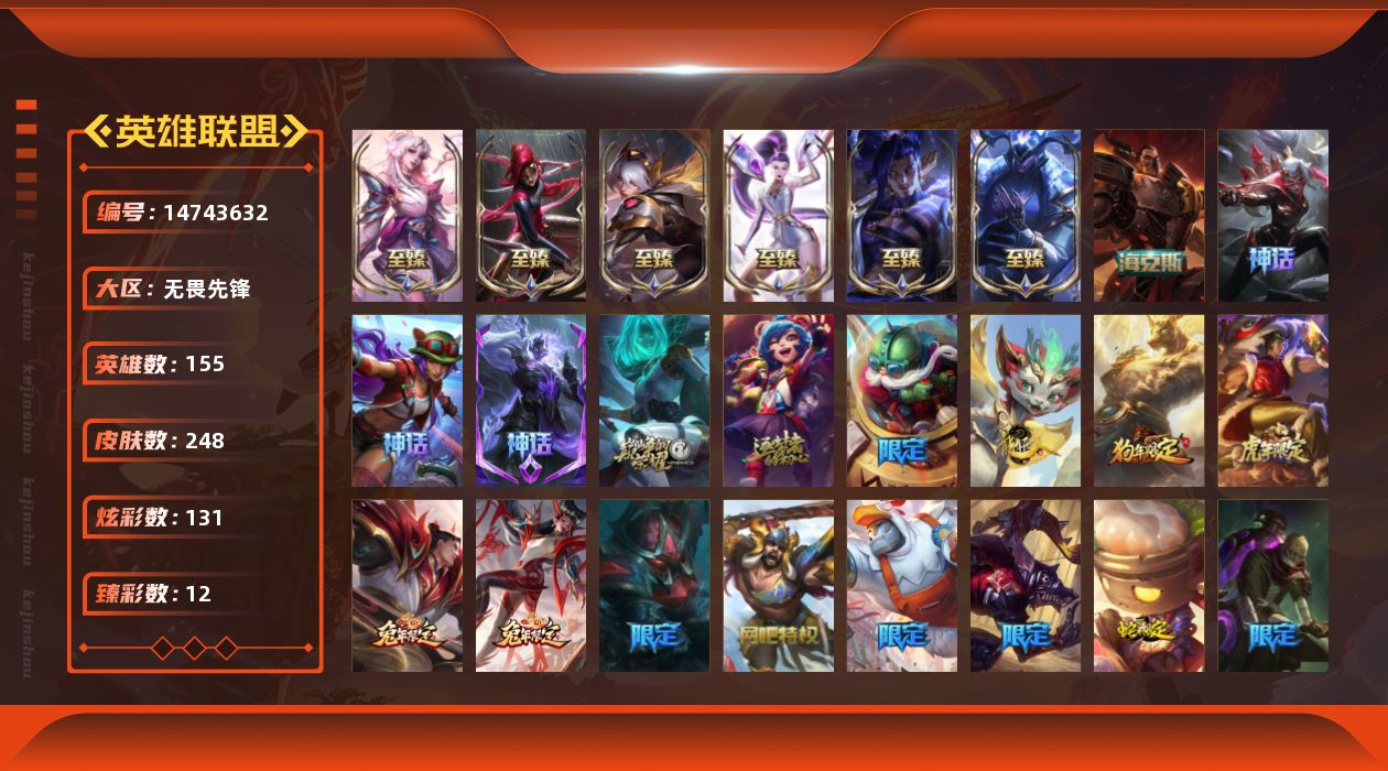 [14743632]铂金段位-155英雄-248皮肤-131炫彩-0终极-14神话-31限定-27传说-40史诗