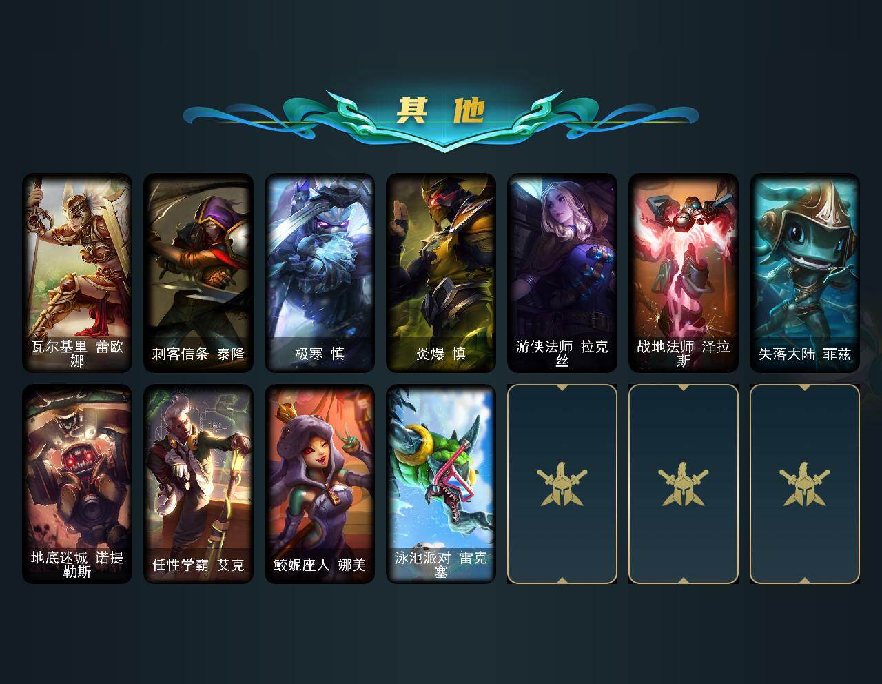 【其他皮肤1】:风执事加里奥,深渊巨蟹厄加特,社会名流乐芙兰,学生会长弗拉基米尔,部落精神瑞兹,宗师级法师训练师瑞兹,游击队员崔丝塔娜,北风冻原图奇,横行霸道图奇,重甲猎鹰艾尼维亚,虚空前世卡萨丁,樱花乱舞卡尔玛,里尔击球手特朗德尔,荒野治安官凯特琳,珊瑚礁墨菲特,烈焰古树茂凯,传统僧侣李青,独眼海盗兰博,沙暴巨蝎斯卡纳,武力全开乌迪尔,乡村农夫古拉加斯,美酒节特使古拉加斯,英仙座珀尔修斯潘森,冒险精神伊泽瑞尔,五杀摇滚贝斯手约里克,蜂刺阿卡丽,银色闪电凯南,医学博士凯南,瓦尔基里蕾欧娜,刺客信条泰隆,极寒慎,炎爆慎,游侠法师拉克丝,战地法师泽拉斯,失落大陆菲兹,地底迷城诺提勒斯,任性学霸艾克,鲛妮座人娜美,泳池派对雷克塞
