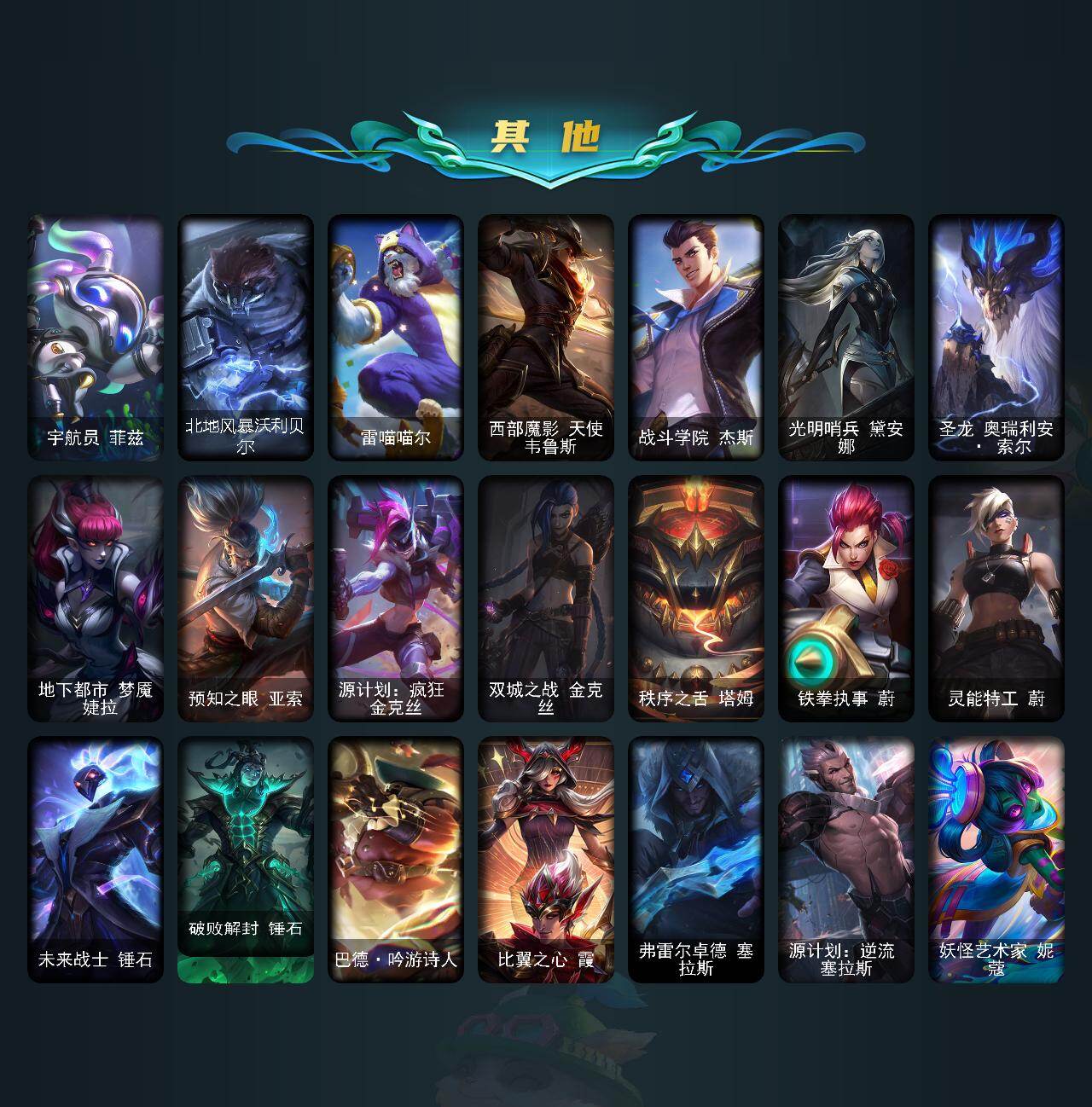 【其他皮肤1】:牛扒狂战奥拉夫,龙族卫士加里奥,未来战士崔斯特,奥德赛崔斯特,哞利斯塔,灵魂莲华索拉卡,太空律动舞林双子努努和威朗普,特工狂花厄运小姐,神龙尊者苍龙艾希,光明骑士贾克斯,五杀摇滚III遗失的章节卡尔萨斯,永恒之森卡尔萨斯,千纸凤凰艾尼维亚,神龙尊者星界之龙卡萨丁,玉剑传说风仙子,光明骑士卡尔玛,暮色枪骑布里茨,星河战队雷克顿,鳄霸雷克顿,黯晶巨鳄雷克顿,黑色玫瑰假面舞会伊莉丝,战场BOSS布兰德,神龙尊者魔龙布兰德,灵魂莲华卡西奥佩娅,魔女卡西奥佩娅,失落的世界伊泽瑞尔,光执事伊泽瑞尔,地狱火莫德凯撒,暗星莫德凯撒,海上霸主盖伦,虚空执事玛尔扎哈,小蜜蜂克格莫,战斗教授格雷福斯,苔原猎手菲兹,兔宝宝菲兹,宇航员菲兹,北地风暴沃利贝尔,雷喵喵尔,西部魔影天使韦鲁斯,战斗学院杰斯,光明哨兵黛安娜,圣龙奥瑞利安索尔,地下都市梦魇婕拉,预知之眼亚索,源计划疯狂金克丝,双城之战金克丝,秩序之舌塔姆,铁拳执事蔚,灵能特工蔚,未来战士锤石,破败解封锤石,巴德吟游诗人,比翼之心霞,弗雷尔卓德塞拉斯,源计划逆流塞拉斯,妖怪艺术家妮蔻