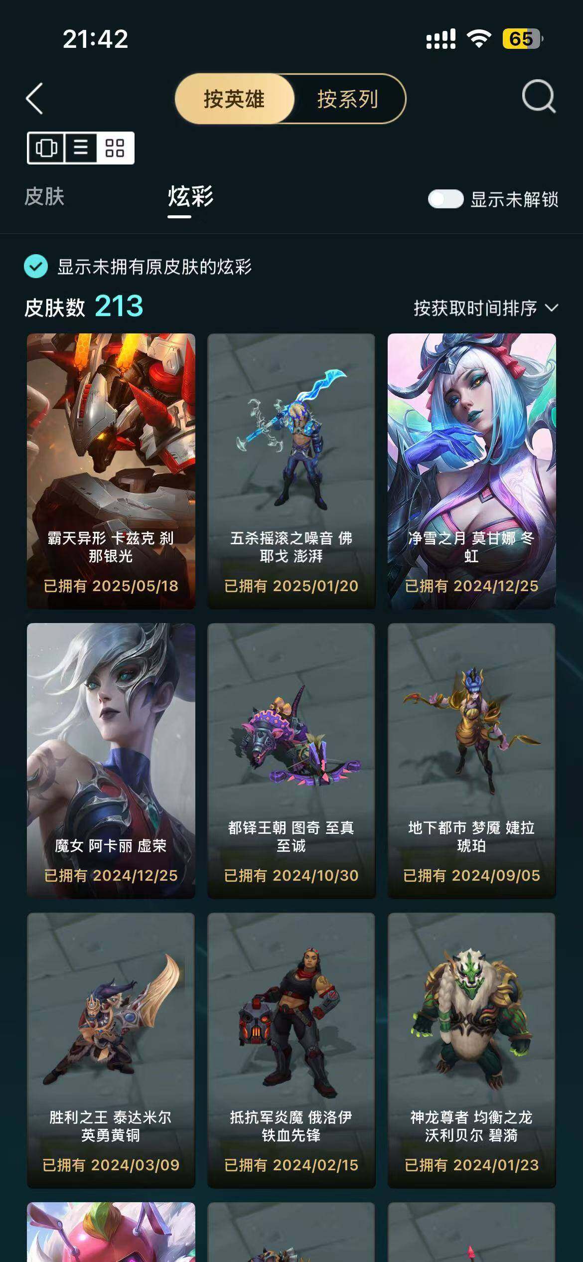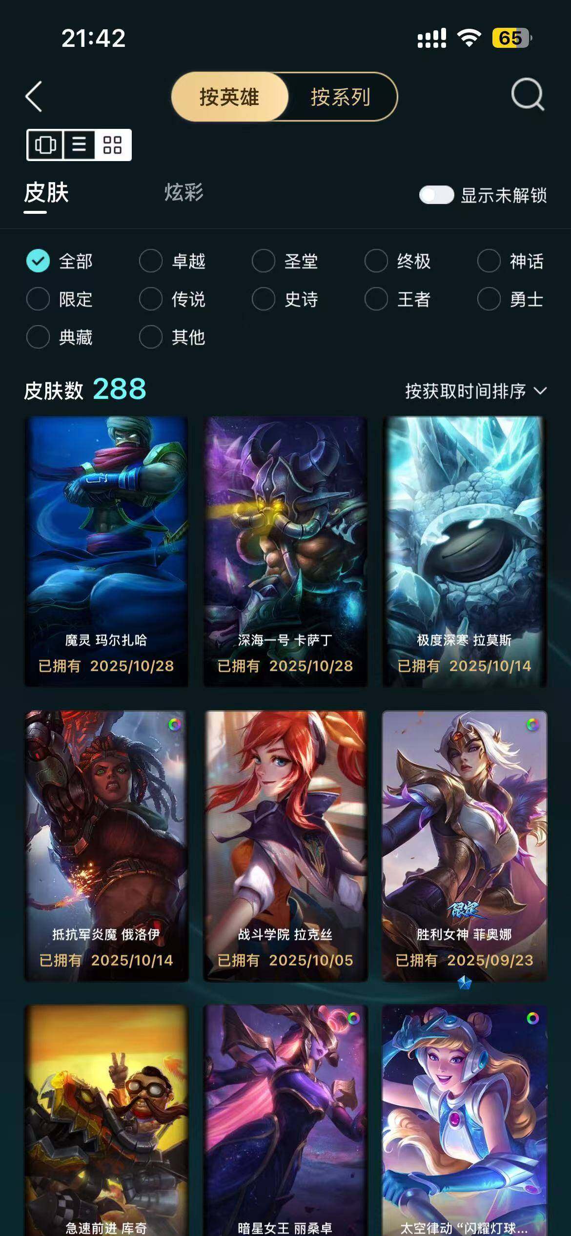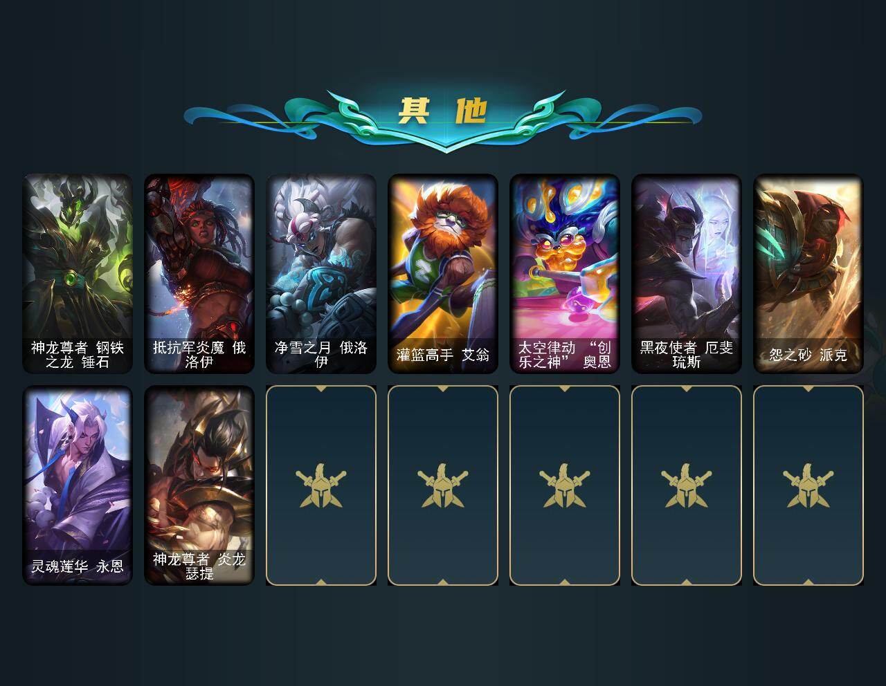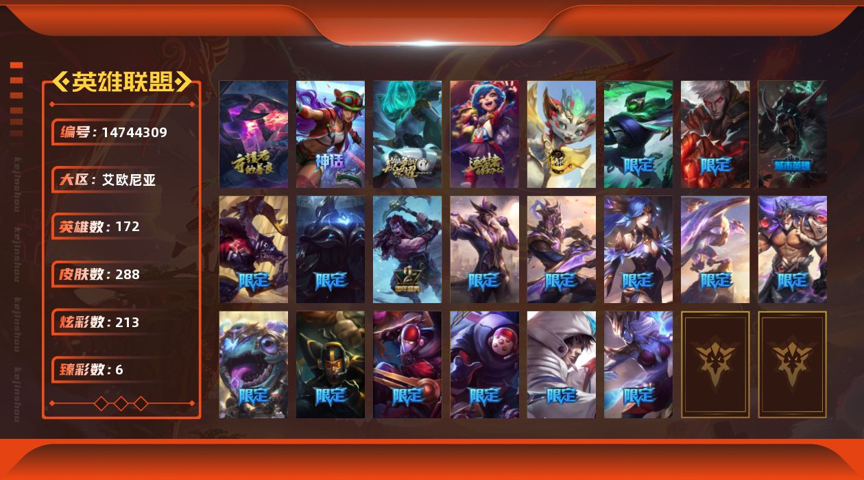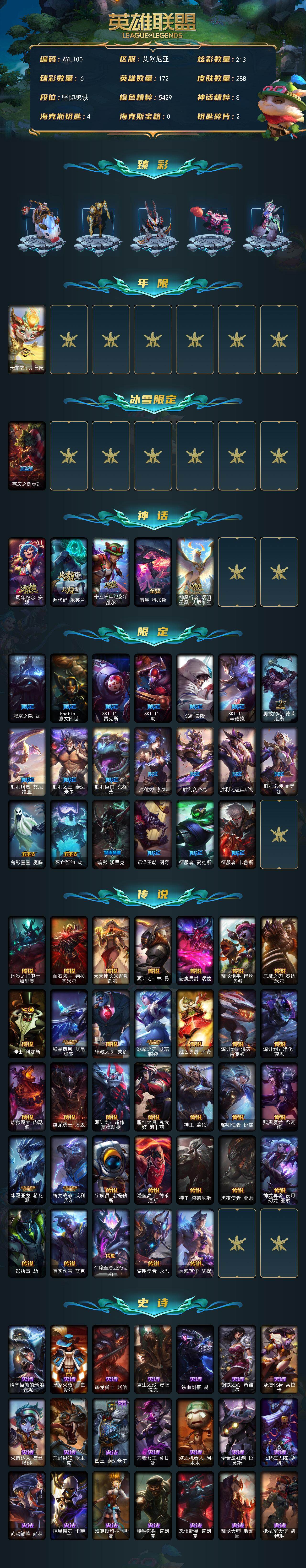黑铁段位-172英雄-288皮肤-213炫彩-0终极-5神话-22限定-33传说-74史诗