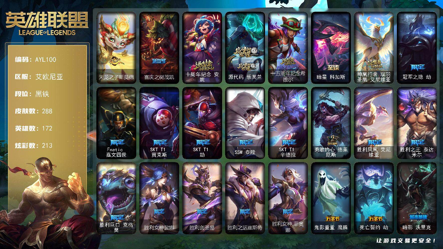 [14744309]可二次【店主推荐捡漏号!可直接换绑】 黑铁段位-172英雄-288皮肤-213炫彩-0终极-5神话-22限定-33传说-74史诗 【臻彩皮肤】:无畏骑士瑟庄妮赤子初心,冠军之隐劫凯旋圣装,霸天异形卡兹克刹那银光,可爱可爱粉红红布里茨,魔女阿卡丽虚荣,净雪之月莫甘娜冬虹 【年限皮肤】:天龙之子斯莫德 【冰雪限定】:喜庆之树茂凯 【神话皮肤】:十周年纪念安妮,源代码乐芙兰,十五周年纪念希维尔,暗星科加斯,神凰行者瑞羽圣凰艾尼维亚 【限定皮肤】:冠军之隐劫,Fnatic嘉文四世,SKTT1贾克斯,SKTT1劫,SSW泰隆,SKTT1辛德拉,勇敢的心德莱厄斯,胜利凤凰艾尼维亚,胜利之王泰达米尔,胜利巨口克格莫,胜利女神娑娜,胜利剑圣易,胜利之运崔斯特,胜利女神菲奥娜,鬼影重重魔腾,死亡誓约劫,暗影沃里克,都铎王朝图奇,征服者贾克斯,征服者韦鲁斯 【传说皮肤】:地狱之门卫士加里奥,血石领主弗拉基米尔,大天使长米迦勒凯尔,源计划林易,恶魔男爵瑞兹,驯龙炮手崔丝塔娜,恶魔之刃泰达米尔,绅士科加斯,黯晶凤凰艾尼维亚,律政大亨蒙多,冰霜之刃艾瑞莉娅,红色男爵库奇,源计划泯灭雷克顿,源计划净化薇恩,炼狱魔犬内瑟斯,屠龙勇士潘森,源计划超体莫德凯撒,腥红之月鬼武姬阿卡丽,神王盖伦,黎明使者锐雯,黯黑魔龙希瓦娜,冰霜亚龙希瓦娜,符文战熊沃利贝尔,宇航员诺提勒斯,灌篮高手德莱厄斯,神王德莱厄斯,黑夜使者亚索,神龙尊者夜月幻龙亚索,影执事劫,真实伤害艾克,海魔至尊亚托克斯,黎明使者永恩,灵魂莲华瑟提 【史诗皮肤】:科学怪熊的新娘安妮,皇家火枪手崔斯特,屠龙勇士赵信,重生之沙费德提克,铁血剑豪易,钢铁之心希维尔,圣洁化身索拉卡,火箭达人崔丝塔娜,荒野豺狼沃里克,国王泰达米尔,刀锋女王莫甘娜,殇之机器人阿木木,全金属狂潮拉莫斯,飞越疯人院萨科,武动巅峰萨科,掠星魔刃卡萨丁,海克斯科技迦娜,特种部队普朗克,恐惧新星普朗克,驯龙大师斯维因,抵抗军天使凯特琳,无畏号墨菲特,前线指挥官卡特琳娜,蓝焰梦魔魔腾,符文战神雷克顿,枯萎之壤雷克顿,龙骑统帅嘉文四世,凯旋英雄嘉文四世,暗星嘉文四世,死亡绽放伊莉丝,暗星奥莉安娜,冰晶之核布兰德,至高之拳李青,法老王朝内瑟斯,艳后奈德丽,大夏武士潘森,实习护士阿卡丽,银色之牙阿卡丽,铁甲雄心盖伦,至高君王玛尔扎哈,腥红之月泰隆,深海怪鱼克格莫,腥红之月鬼武者慎,战