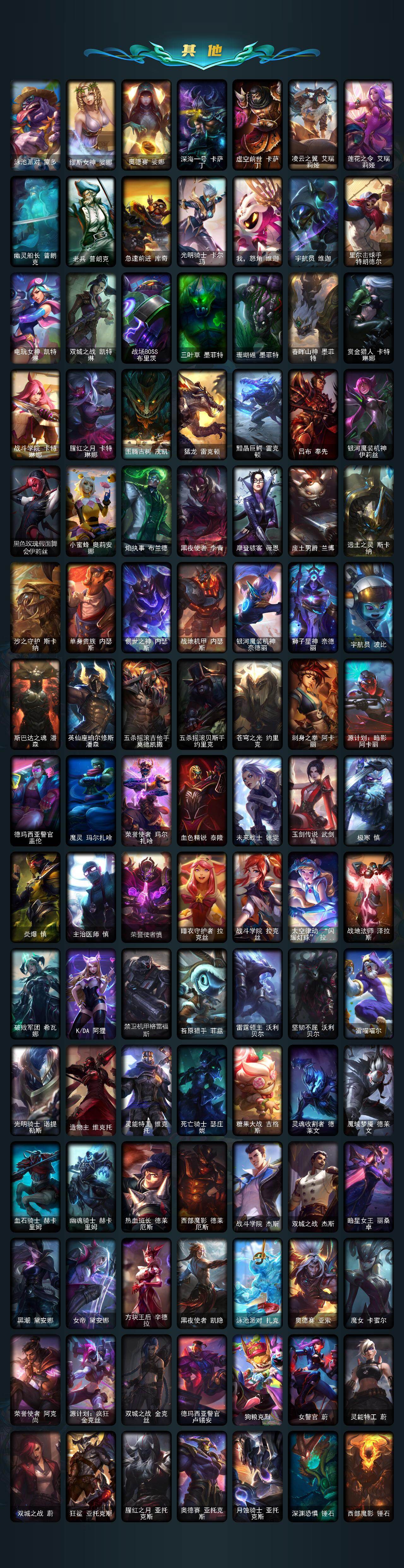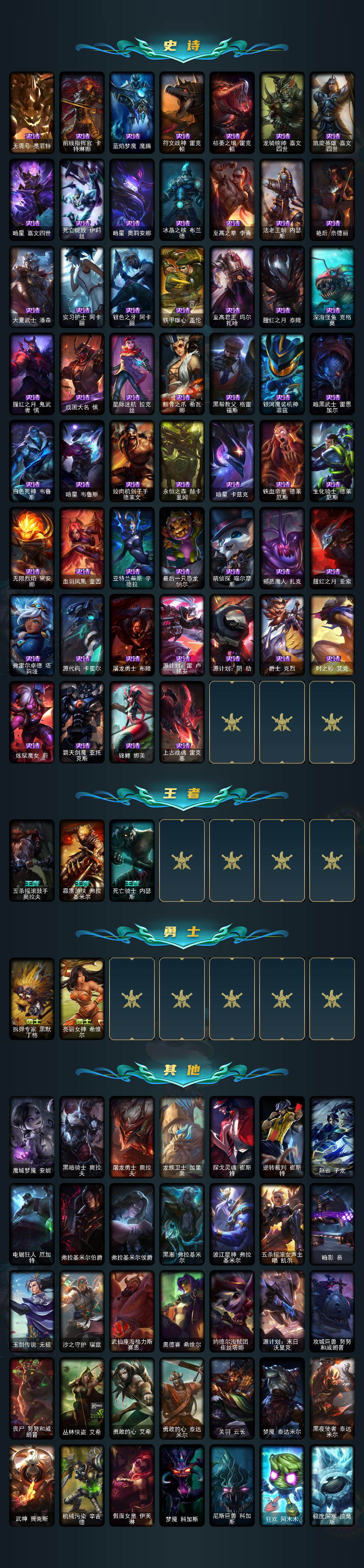 【史诗皮肤】:科学怪熊的新娘安妮,皇家火枪手崔斯特,屠龙勇士赵信,重生之沙费德提克,铁血剑豪易,钢铁之心希维尔,圣洁化身索拉卡,火箭达人崔丝塔娜,荒野豺狼沃里克,国王泰达米尔,刀锋女王莫甘娜,殇之机器人阿木木,全金属狂潮拉莫斯,飞越疯人院萨科,武动巅峰萨科,掠星魔刃卡萨丁,海克斯科技迦娜,特种部队普朗克,恐惧新星普朗克,驯龙大师斯维因,抵抗军天使凯特琳,无畏号墨菲特,前线指挥官卡特琳娜,蓝焰梦魔魔腾,符文战神雷克顿,枯萎之壤雷克顿,龙骑统帅嘉文四世,凯旋英雄嘉文四世,暗星嘉文四世,死亡绽放伊莉丝,暗星奥莉安娜,冰晶之核布兰德,至高之拳李青,法老王朝内瑟斯,艳后奈德丽,大夏武士潘森,实习护士阿卡丽,银色之牙阿卡丽,铁甲雄心盖伦,至高君王玛尔扎哈,腥红之月泰隆,深海怪鱼克格莫,腥红之月鬼武者慎,战