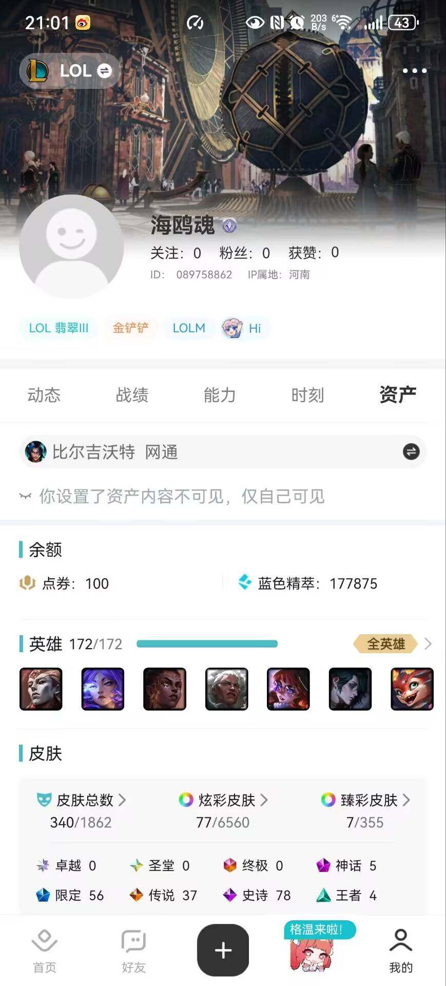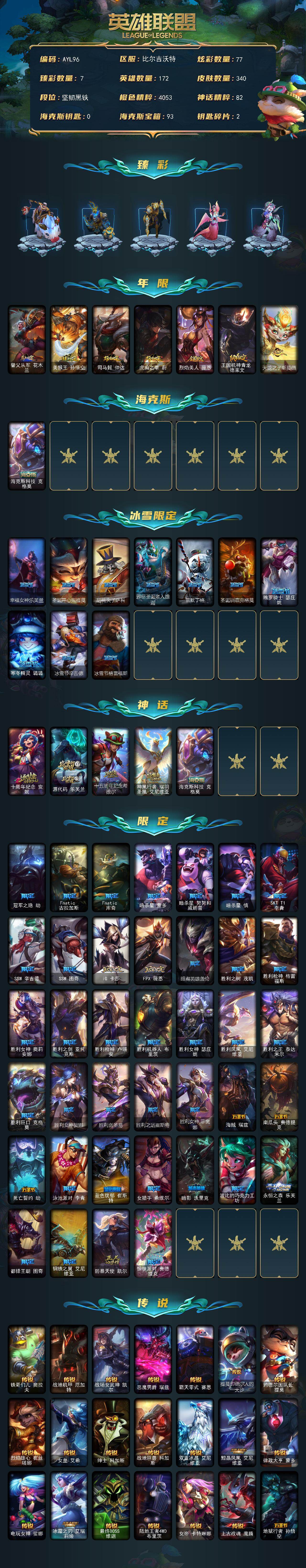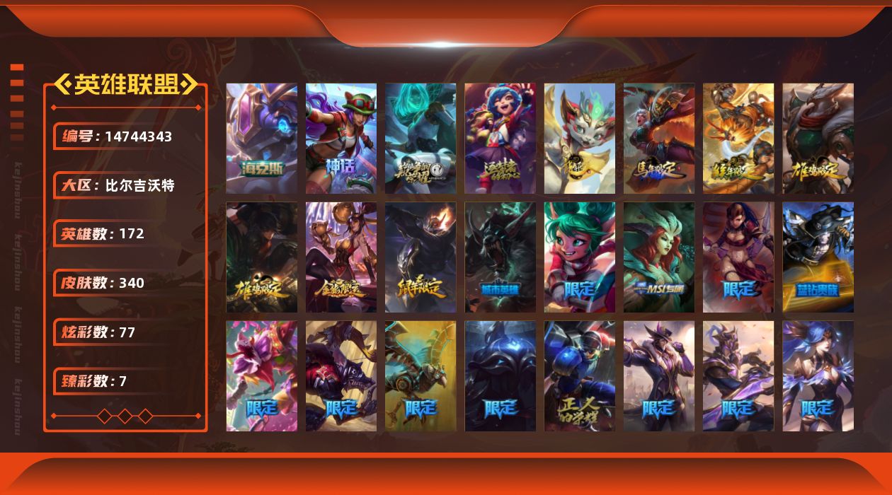 [14744343]未定级段位-172英雄-340皮肤-77炫彩-0终极-5神话-56限定-37传说-78史诗