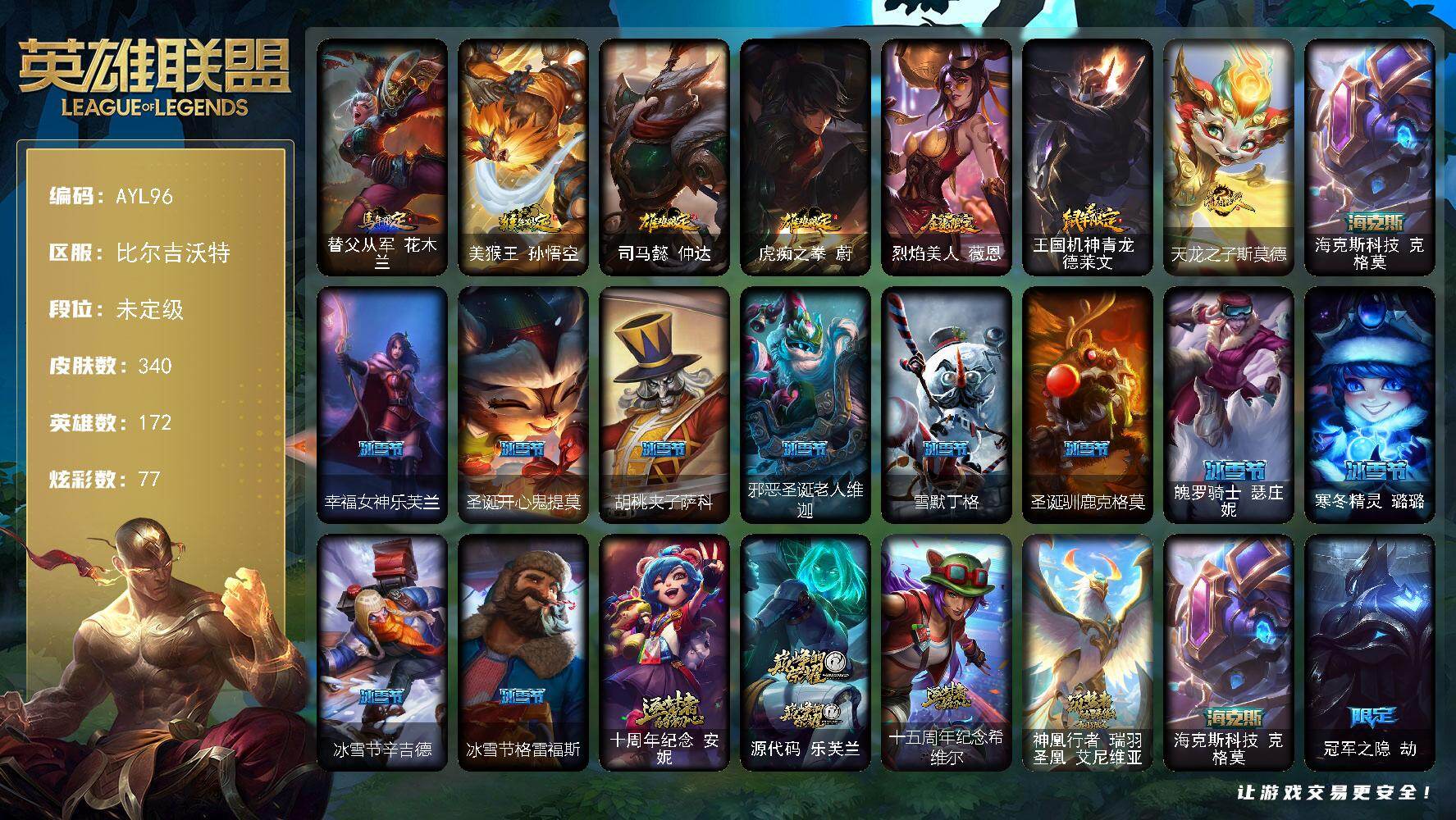 [14744343]未定级段位-172英雄-340皮肤-77炫彩-0终极-5神话-56限定-37传说-78史诗 【臻彩皮肤】:天龙之子卡莎飞龙乘云,无畏骑士瑟庄妮赤子初心,冠军典狱长锤石凯旋圣装,冠军之隐劫凯旋圣装,玉剑传说苍鸾丁香,魔女阿卡丽虚荣,净雪之月莫甘娜冬虹 【年限皮肤】:替父从军花木兰,美猴王孙悟空,司马懿仲达,虎痴之拳蔚,烈焰美人薇恩,王国机神青龙德莱文,天龙之子斯莫德 【海克斯皮肤】:海克斯科技克格莫 【冰雪限定】:幸福女神乐芙兰,圣诞开心鬼提莫,胡桃夹子萨科,邪恶圣诞老人维迦,雪默丁格,圣诞驯鹿克格莫,魄罗骑士瑟庄妮,寒冬精灵璐璐,冰雪节辛吉德,冰雪节格雷福斯 【神话皮肤】:十周年纪念安妮,源代码乐芙兰,十五周年纪念希维尔,神凰行者瑞羽圣凰艾尼维亚,海克斯科技克格莫 【限定皮肤】:冠军之隐劫,Fnatic古拉加斯,Fnatic库奇,暗杀星蒙多,暗杀星努努和威朗普,暗杀星慎,SKTT1李青,SSW辛吉德,SSW图奇,iG卡莎,FPX薇恩,暗裔英雄盖伦,胜利之树茂凯,胜利枪神格雷福斯,胜利女神奥莉安娜,胜利之剑亚托克斯,胜利枪神卢锡安,胜利机器人布里茨,胜利女神瑟庄妮,胜利凤凰艾尼维亚,胜利之王泰达米尔,胜利巨口克格莫,胜利女神娑娜,胜利剑圣易,胜利之运崔斯特,胜利女神菲奥娜,海贼瑞兹,南瓜头费德提克,死亡誓约劫,泳池派对李青,蓝色忧郁崔斯特,女猎手希维尔,暗影沃里克,波比的巧克力工坊,永恒之森乐芙兰,都铎王朝图奇,钢铁之翼艾尼维亚,防暴天使凯尔,惊悚派对费德提克 【传说皮肤】:铁哥们儿奥拉夫,战地机甲厄加特,战场女武神凯尔,恶魔男爵瑞兹,霸天零式赛恩,提莫约德尔人的一大步,约德尔国队长提莫,烈焰雄心崔丝塔娜,女皇艾希,绅士科加斯,战地巨兽科加斯,双重冰晶艾尼维亚,黯晶凤凰艾尼维亚,律政大亨蒙多,电玩女神娑娜,冰霜之刃艾瑞莉娅,最终BOSS维迦,陆地王者4WD布里茨,女帝卡特琳娜,上古战魂魔腾,地狱行者孙悟空,神拳李青,神龙尊者圣龙李青,第三类接触黑默丁格,青花瓷伊泽瑞尔,黯黑魔龙希瓦娜,冰霜亚龙希瓦娜,偶像歌手阿狸,苍穹之光韦鲁斯,宇航员诺提勒斯,女校长菲奥娜,泳池派对吉格斯,金牌主播德莱文,霸天异形卡兹克,灌篮高手德莱厄斯,星之守护者金克丝,星之守护者霞 【史诗皮肤】:冰霜烈焰安妮,安伯斯与提妮,科学怪熊的新娘安妮,皇家火枪手崔斯特,绞肉机角斗士赵信,铁钩船长费德提
