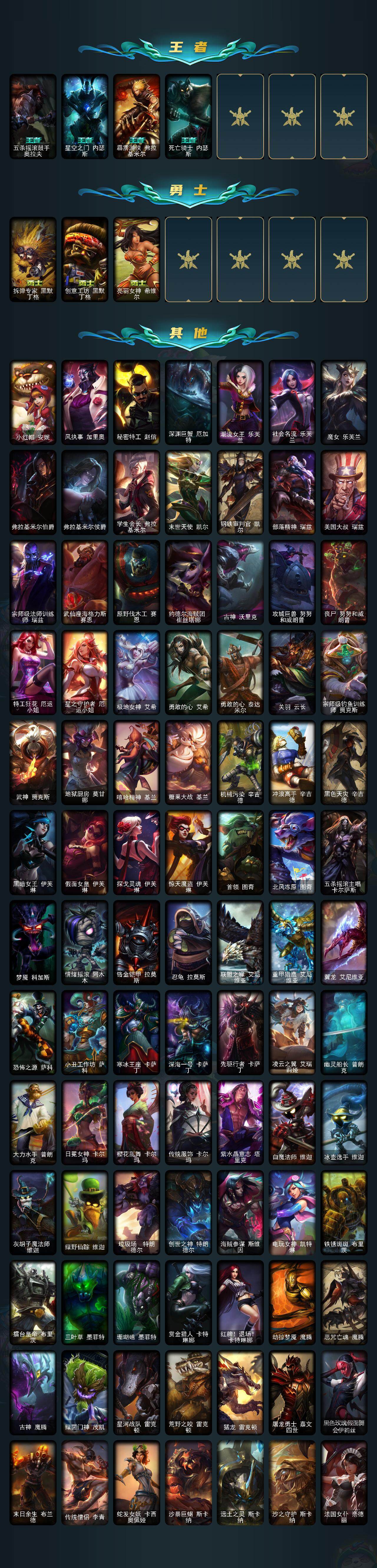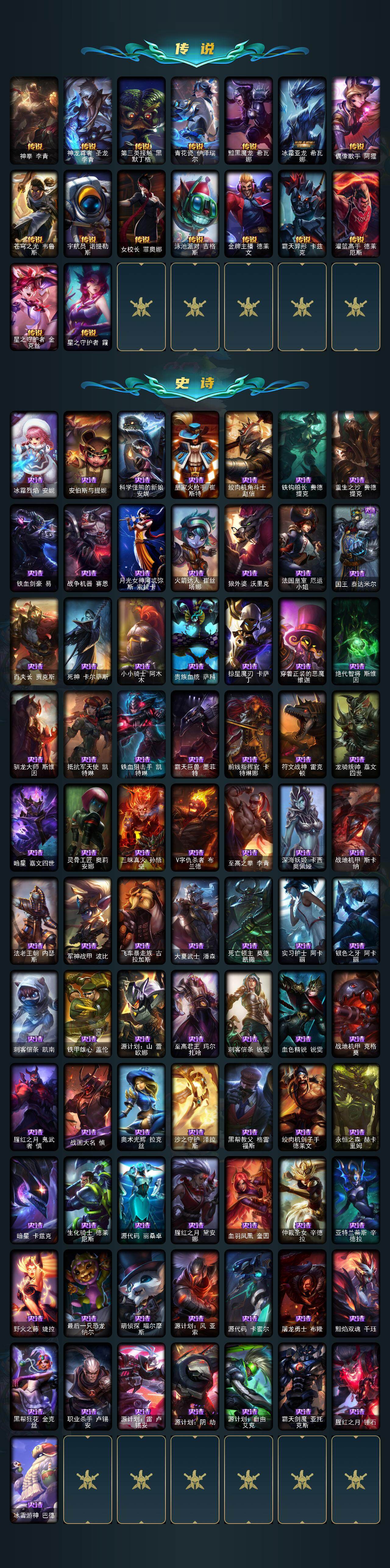 【传说皮肤】:铁哥们儿奥拉夫,战地机甲厄加特,战场女武神凯尔,恶魔男爵瑞兹,霸天零式赛恩,提莫约德尔人的一大步,约德尔国队长提莫,烈焰雄心崔丝塔娜,女皇艾希,绅士科加斯,战地巨兽科加斯,双重冰晶艾尼维亚,黯晶凤凰艾尼维亚,律政大亨蒙多,电玩女神娑娜,冰霜之刃艾瑞莉娅,最终BOSS维迦,陆地王者4WD布里茨,女帝卡特琳娜,上古战魂魔腾,地狱行者孙悟空,神拳李青,神龙尊者圣龙李青,第三类接触黑默丁格,青花瓷伊泽瑞尔,黯黑魔龙希瓦娜,冰霜亚龙希瓦娜,偶像歌手阿狸,苍穹之光韦鲁斯,宇航员诺提勒斯,女校长菲奥娜,泳池派对吉格斯,金牌主播德莱文,霸天异形卡兹克,灌篮高手德莱厄斯,星之守护者金克丝,星之守护者霞