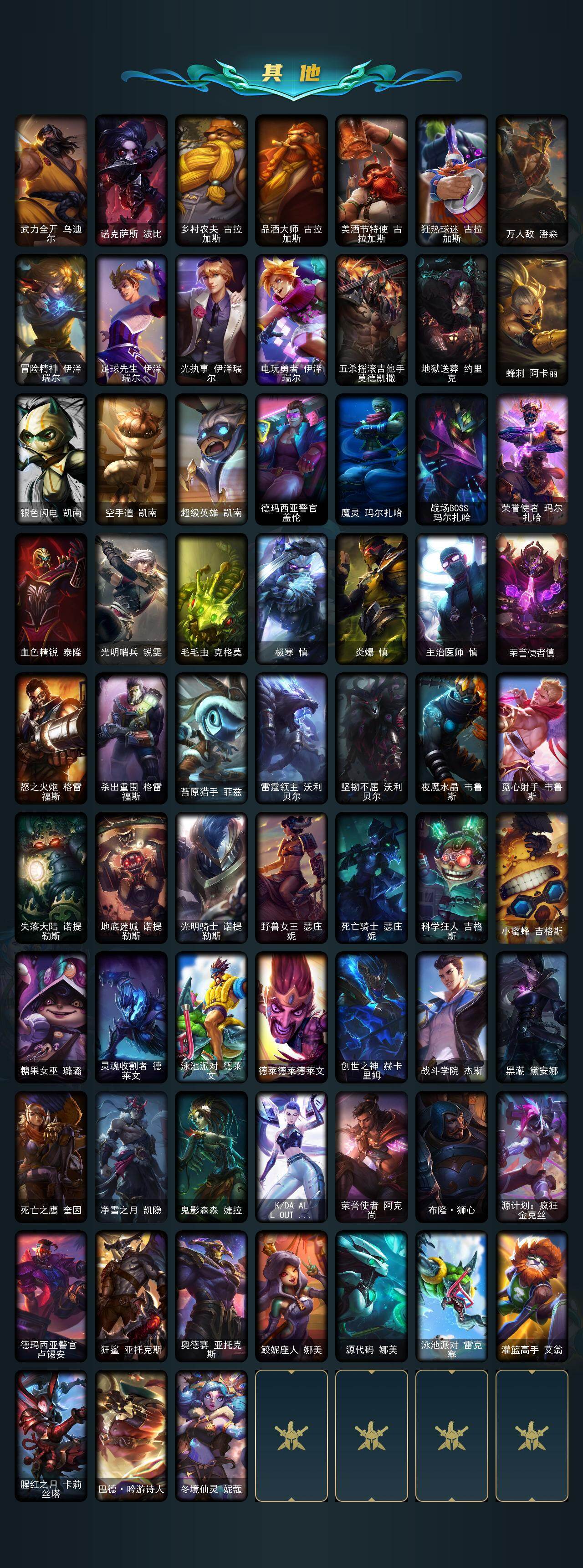 【冰雪限定】:幸福女神乐芙兰,圣诞开心鬼提莫,胡桃夹子萨科,邪恶圣诞老人维迦,雪默丁格,圣诞驯鹿克格莫,魄罗骑士瑟庄妮,寒冬精灵璐璐,冰雪节辛吉德,冰雪节格雷福斯