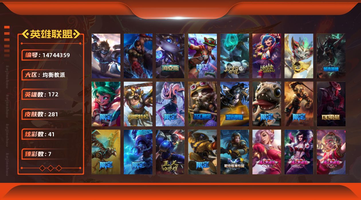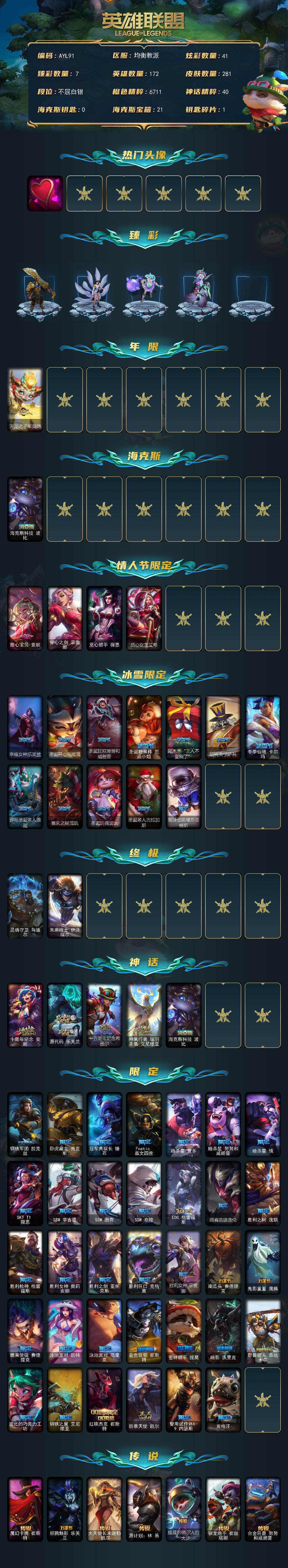 [14744359]【店主推荐捡漏号】白银段位-172英雄-281皮肤-41炫彩-2终极-5神话-51限定-30传说-64史诗
