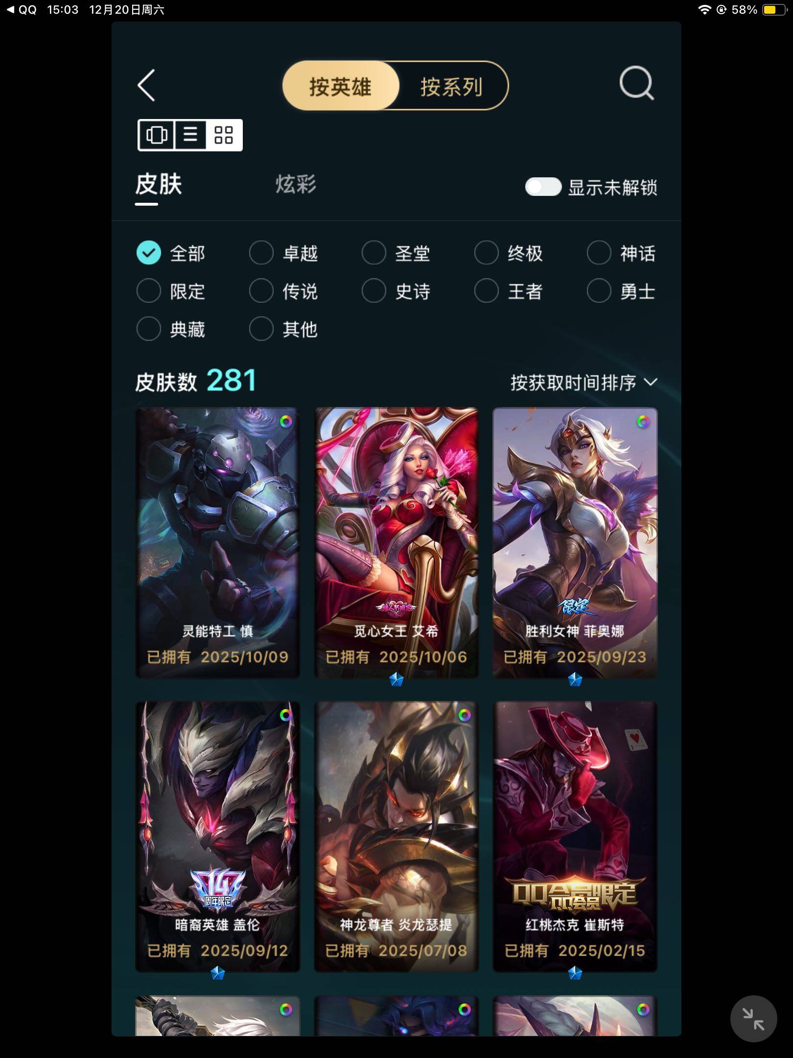- [11546728]V8 1典藏 19传说 124英雄 298皮肤 可修改实名 优质装备:鸣剑·曳影,黄金狮子座,云鹰飞将(小将军),久胜战神,炽阳神光,一念神魔,末日机甲-孙尚香(绿蚂蚱),地狱火,地狱之眼,无双飞将,燃星之曲,遇见神鼓 传说皮:落雪白狼,幻光神枪 珍宝阁皮:女武神,玩趣恶龙 限定皮:愿照·九州拓(澜年限),愿照·岁时盈(虞姬年限),愿照·众生和(妲己年限),凤求凰(白切鸡),傲雪梅枪,时之彼端,白晶晶,遇见飞天,高山流水,齐天大圣,五谷丰年,梁祝,天狼绘梦者,李小龙,辉光之辰,霸王别姬-虞姬,圣诞老人,真爱至上,纯白花嫁,大圣娶亲,寅虎·御盾(廉颇年限) 史诗皮:鸭鸭历险记-刘禅,苍鳞隐世,器灵·浮梦炉,糖绘人间,化蝶舞,星界战将,龙之律动,藏狐·褐绒,百相守梦-黄忠,紫霞仙子,白龙吟,黄金分割率,特工魅影,千年之狐,永昼,江河有灵,偶像歌手,暗夜猫娘,晚萤,冰冠公主,猫狗日记-孙策,猫狗日记-大乔,乱世虎臣,修罗,女仆咖啡,摇滚巨星,水果甜心,天才门将,星夜王子,心灵骇客,功夫厨神,德古拉伯爵,暗隐猎兽者,幽灵船长,鬼剑武藏,心灵战警,天秀·启明,地狱岩魂,纤云弄巧,繁星吟游(呼啦呼啦),缤纷独角兽,乘风破浪,水晶猎龙者,曙光守护者,箭羽风息,金属风暴,原初追逐者,圣诞狂欢,圣诞恋歌,鹰眼统帅,王者之锤,暗夜贵公子,魅力维加斯,黎明之约,寅虎·御盾,无心,未来纪元-赵云