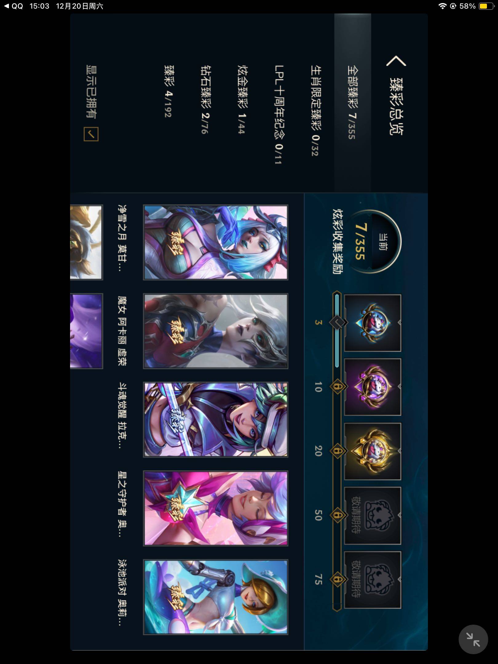 【臻彩皮肤】:张辽文远炫金将军,偶像歌手阿狸极地雪莲,斗魂觉醒拉克丝无限斗志,星之守护者奥莉安娜未来之光,泳池派对奥莉安娜优雅珠光鲸,魔女阿卡丽虚荣,净雪之月莫甘娜冬虹