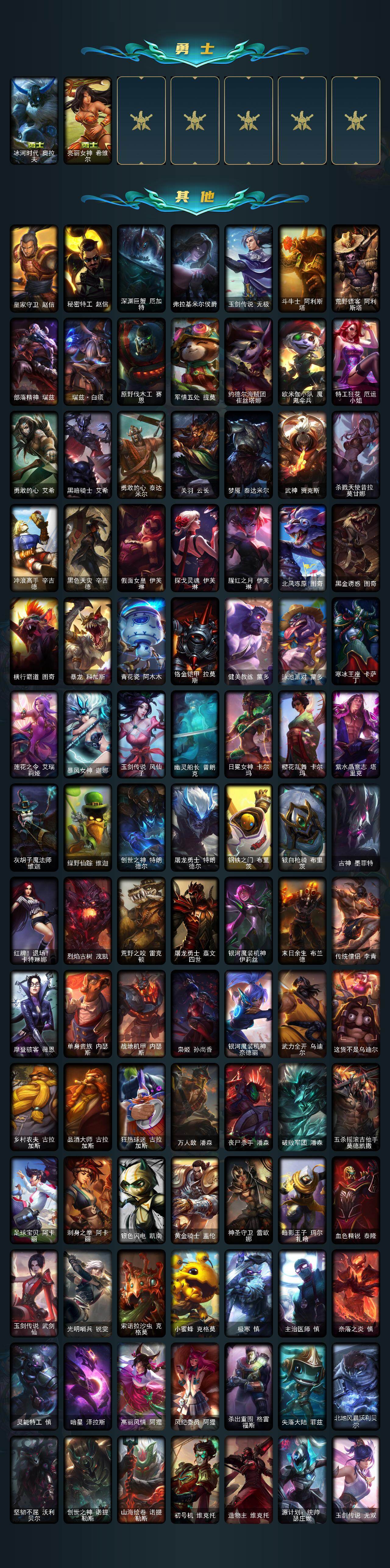 【传说皮肤】:魔幻卡牌崔斯特,邪鸦魅影乐芙兰,大天使长米迦勒凯尔,源计划林易,提莫约德尔人的一大步,驯龙炮手崔丝塔娜,合金巨兽努努和威朗普,女皇艾希,恶魔之刃泰达米尔,绅士科加斯,双重冰晶艾尼维亚,黯晶凤凰艾尼维亚,律政大亨蒙多,电玩女神娑娜,女主播迦娜,红色男爵库奇,丧尸布兰德,源计划净化薇恩,银河魔装机神兰博,炼狱魔犬内瑟斯,死亡骑士盖伦,枯萎之壤泽拉斯,冰霜亚龙希瓦娜,偶像歌手阿狸,符文战熊沃利贝尔,泳池派对吉格斯,灌篮高手德莱厄斯,黑夜使者亚索,星之守护者金克丝,暗星锤石