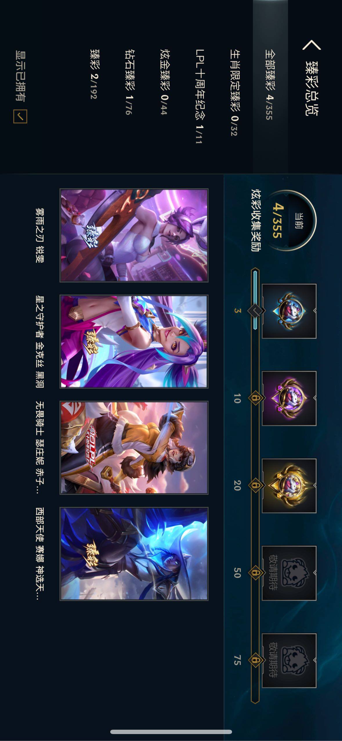 【臻彩皮肤】:无畏骑士瑟庄妮赤子初心,雾雨之刃锐雯,西部天使赛娜神选天使长,星之守护者金克丝黑洞