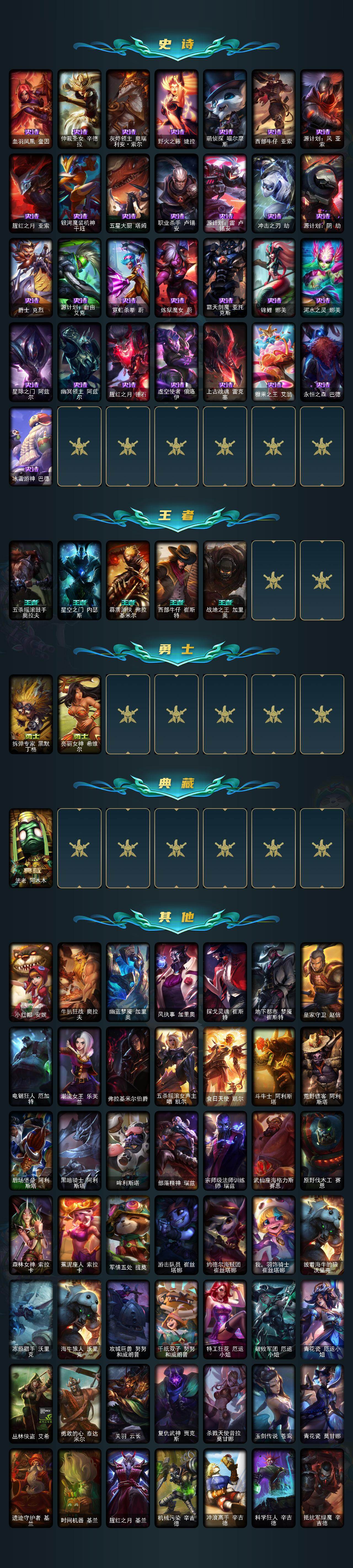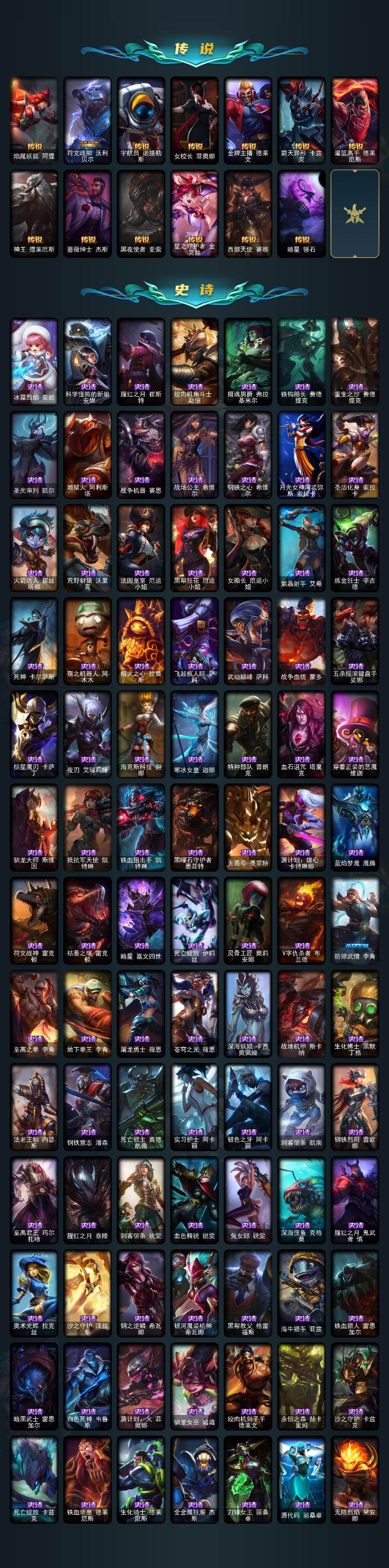 【神话皮肤】:十周年纪念安妮,源代码乐芙兰,水晶圣骑艾希,新卧虎藏龙贾克斯,神凰行者瑞羽圣凰艾尼维亚,灰烬守护者慎,水晶掠夺者卡兹克,水晶圣骑塔莉娅,海克斯科技阿利斯塔,海克斯科技安妮,海克斯科技嘉文四世,海克斯科技雷克顿,海克斯科技斯维因,零之枪骑赫卡里姆,摄魂使者薇恩,至臻真实伤害奇亚娜,至臻真实伤害赛娜,至臻至高天奎桑提,至臻天龙之子伊泽瑞尔,至臻暗星墨菲特,至臻北极星钢影卡蜜尔,至臻海珀利安小队X09星环灵风迦娜,至臻黑夜使者凯隐,至臻魂蔷薇烈娜塔,至臻KDA卡莎,至臻灵能特工伊泽瑞尔,至臻魅惑女巫厄运小姐,至臻神龙尊者均衡之龙沃利贝尔,至臻太空律动节奏幻师璐璐,至臻太空律动魔音海妖娜美,至臻星之守护者辛德拉