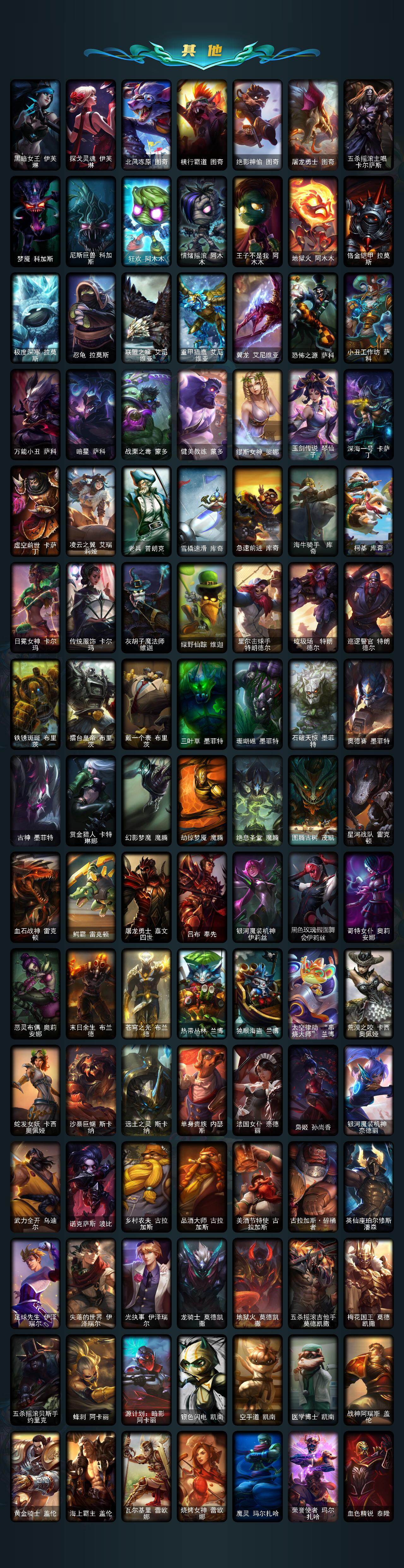 【限定皮肤】:钢铁军团拉克丝,卧虎藏龙贾克斯,诺斯费拉图弗拉基米尔,冠军典狱长锤石,冠军之刃锐雯2016,冠军之隐劫,暗杀星奥莉安娜,暗杀星蒙多,暗杀星努努和威朗普,暗杀星慎,SK