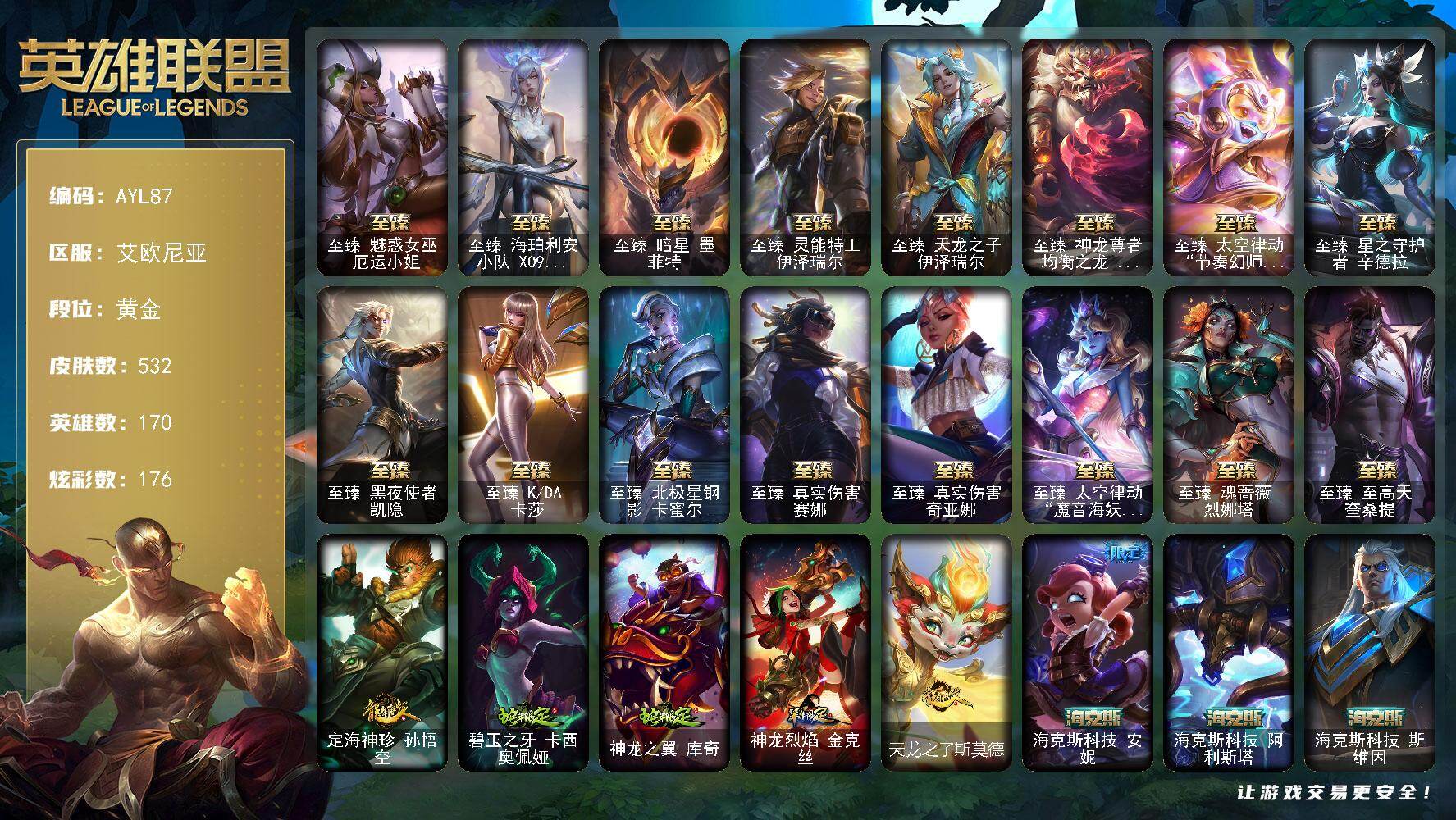 [14744403]可二次【店主推荐捡漏号!可直接换绑】黄金段位-170英雄-532皮肤-176炫彩-2终极-31神话-75限定-62传说-120史诗 【至臻皮肤】:至臻魅惑女巫厄运小姐,至臻海珀利安小队X09星环灵风迦娜,至臻暗星墨菲特,至臻灵能特工伊泽瑞尔,至臻天龙之子伊泽瑞尔,至臻神龙尊者均衡之龙沃利贝尔,至臻太空律动节奏幻师璐璐,至臻星之守护者辛德拉,至臻黑夜使者凯隐,至臻KDA卡莎,至臻北极星钢影卡蜜尔,至臻真实伤害赛娜,至臻真实伤害奇亚娜,至臻太空律动魔音海妖娜美,至臻魂蔷薇烈娜塔,至臻至高天奎桑提 【臻彩皮肤】:无畏骑士瑟庄妮赤子初心,雾雨之刃锐雯,西部天使赛娜神选天使长,星之守护者金克丝黑洞 【年限皮肤】:定海神珍孙悟空,碧玉之牙卡西奥佩娅,神龙之翼库奇,神龙烈焰金克丝,天龙之子斯莫德 【海克斯皮肤】:海克斯科技安妮,海克斯科技阿利斯塔,海克斯科技斯维因,海克斯科技雷克顿,海克斯科技嘉文四世,摄魂使者薇恩,零之枪骑赫卡里姆 【冰雪限定】:冰雪风暴希维尔,圣诞开心鬼提莫,圣诞精灵崔丝塔娜,圣诞狂欢努努和威朗普,圣诞狂欢基兰,阿木木“主人不要我了”,胡桃夹子萨科,平安夜女神娑娜,英勇玩具兵普朗克,冬季仙境卡尔玛,夺命美人卡特琳娜,冬季仙境奥莉安娜,雪默丁格,圣诞玩偶波比,圣诞老人古拉加斯,圣诞驯鹿克格莫,魄罗骑士瑟庄妮,寒冬精灵璐璐 【终极皮肤】:灵魂守卫乌迪尔,武装战姬厄运小姐 【神话皮肤】:十周年纪念安妮,源代码乐芙兰,水晶圣骑艾希,新卧虎藏龙贾克斯,神凰行者瑞羽圣凰艾尼维亚,灰烬守护者慎,水晶掠夺者卡兹克,水晶圣骑塔莉娅,海克斯科技阿利斯塔,海克斯科技安妮,海克斯科技嘉文四世,海克斯科技雷克顿,海克斯科技斯维因,零之枪骑赫卡里姆,摄魂使者薇恩,至臻真实伤害奇亚娜,至臻真实伤害赛娜,至臻至高天奎桑提,至臻天龙之子伊泽瑞尔,至臻暗星墨菲特,至臻北极星钢影卡蜜尔,至臻海珀利安小队X09星环灵风迦娜,至臻黑夜使者凯隐,至臻魂蔷薇烈娜塔,至臻KDA卡莎,至臻灵能特工伊泽瑞尔,至臻魅惑女巫厄运小姐,至臻神龙尊者均衡之龙沃利贝尔,至臻太空律动节奏幻师璐璐,至臻太空律动魔音海妖娜美,至臻星之守护者辛德拉 【限定皮肤】:钢铁军团拉克丝,卧虎藏龙贾克斯,诺斯费拉图弗拉基米尔,冠军典狱长锤石,冠军之刃锐雯2016,冠军之隐劫,暗杀星奥莉安娜,暗杀星蒙多,暗杀星努努和威朗普,暗杀星慎,SK