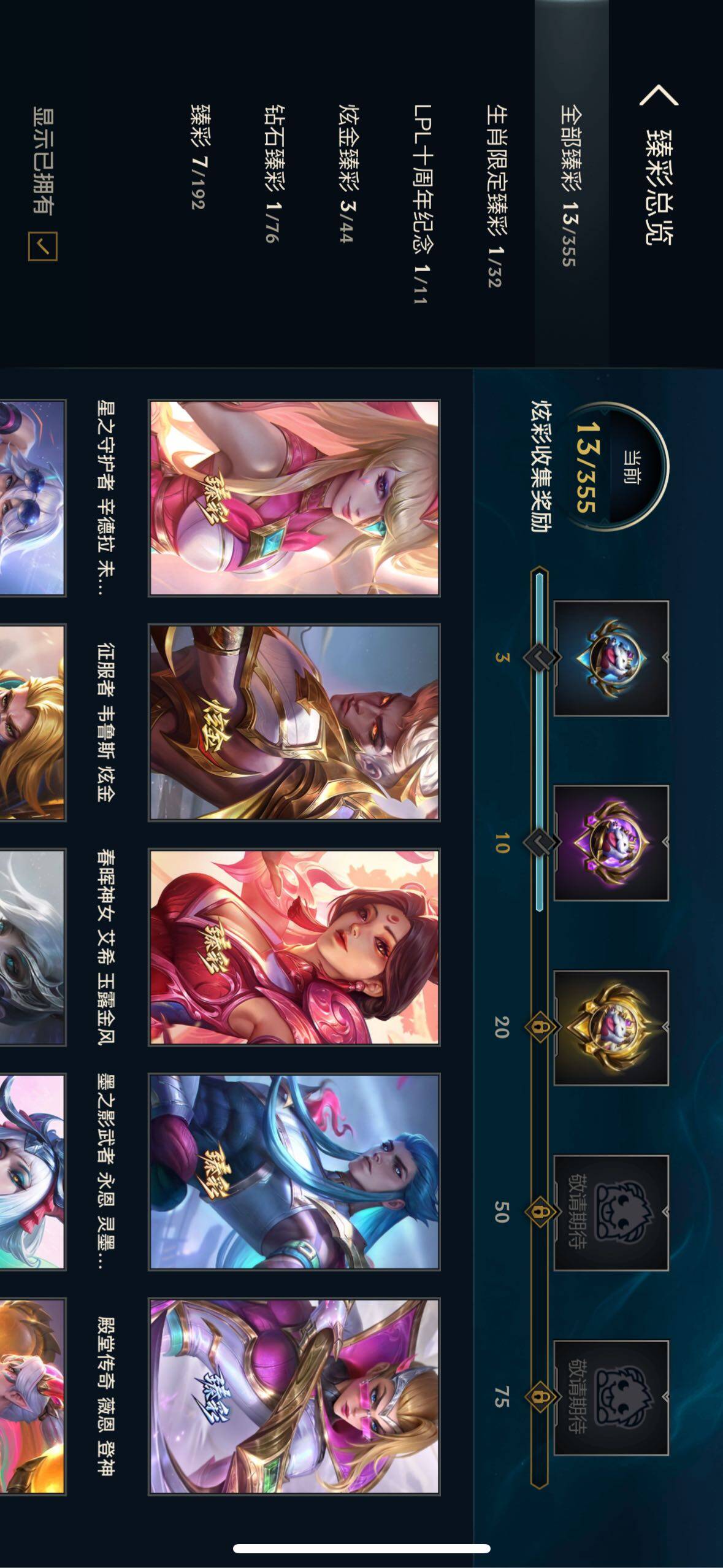 【臻彩皮肤】:天龙之子卡莎飞龙乘云,无畏骑士瑟庄妮赤子初心,冰雪节格雷福斯炫金,墨之影武者亚索金墨耀影,征服者韦鲁斯炫金,星之守护者辛德拉未来之光,殿堂传奇乐芙兰登神,春晖神女艾希玉露金风,魔女阿卡丽虚荣,净雪之月莫甘娜冬虹,墨之影武者永恩灵墨刻影,心之钢伊泽瑞尔天纵才华