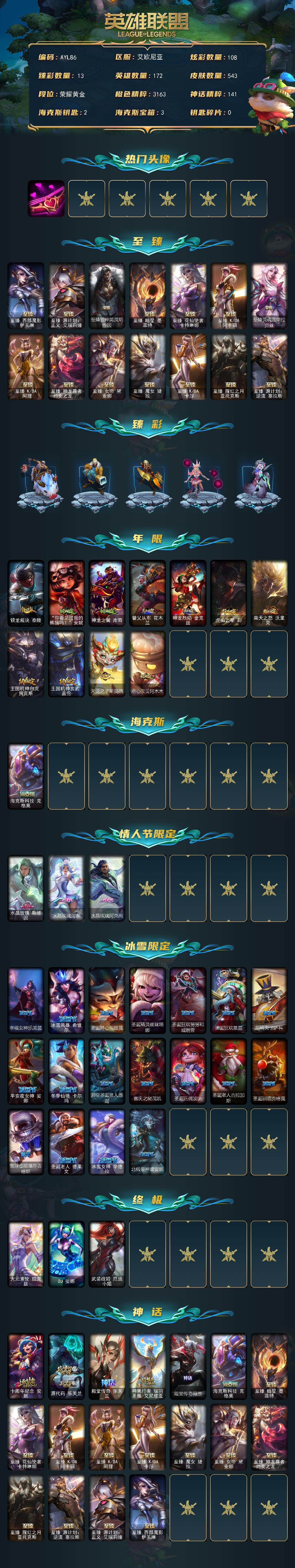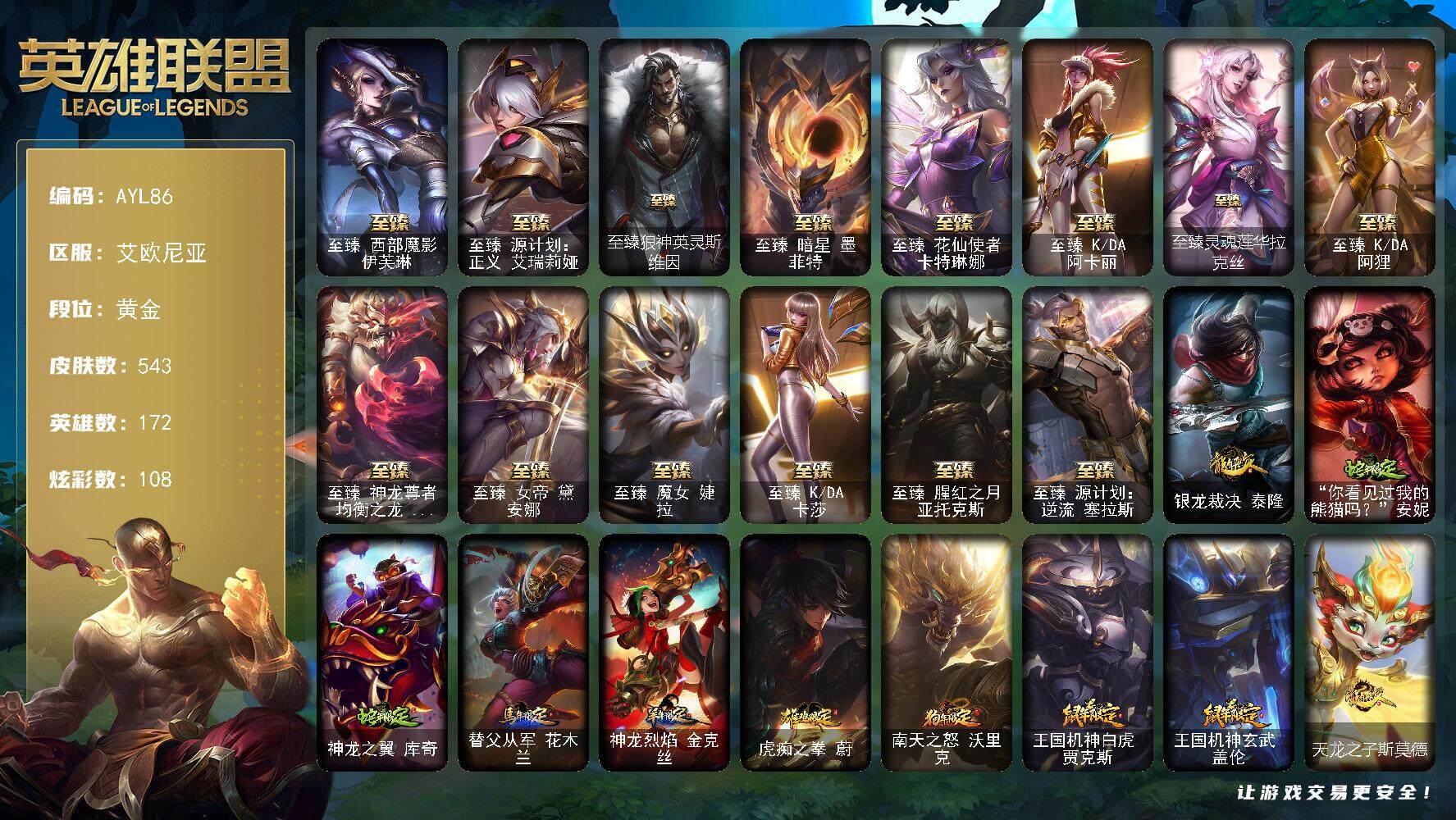 [14744408]可二次【店主推荐捡漏号!可直接换绑】黄金段位-172英雄-543皮肤-108炫彩-3终极-20神话-88限定-46传说-114史诗 【热门头像】:爱情之歌头像 【至臻皮肤】:至臻西部魔影伊芙琳,至臻源计划正义艾瑞莉娅,至臻狼神英灵斯维因,至臻暗星墨菲特,至臻花仙使者卡特琳娜,至臻KDA阿卡丽,至臻灵魂莲华拉克丝,至臻KDA阿狸,至臻神龙尊者均衡之龙沃利贝尔,至臻女帝黛安娜,至臻魔女婕拉,至臻KDA卡莎,至臻腥红之月亚托克斯,至臻源计划逆流塞拉斯 【臻彩皮肤】:天龙之子卡莎飞龙乘云,无畏骑士瑟庄妮赤子初心,冰雪节格雷福斯炫金,墨之影武者亚索金墨耀影,征服者韦鲁斯炫金,星之守护者辛德拉未来之光,殿堂传奇乐芙兰登神,春晖神女艾希玉露金风,魔女阿卡丽虚荣,净雪之月莫甘娜冬虹,墨之影武者永恩灵墨刻影,心之钢伊泽瑞尔天纵才华 【年限皮肤】:银龙裁决泰隆,你看见过我的熊猫吗安妮,神龙之翼库奇,替父从军花木兰,神龙烈焰金克丝,虎痴之拳蔚,南天之怒沃里克,王国机神白虎贾克斯,王国机神玄武盖伦,天龙之子斯莫德,点心宝贝阿木木 【海克斯皮肤】:海克斯科技克格莫 【情人节限定】:水晶玫瑰斯维因,水晶玫瑰迦娜,水晶玫瑰阿克尚 【冰雪限定】:幸福女神乐芙兰,冰雪风暴希维尔,圣诞开心鬼提莫,圣诞精灵崔丝塔娜,圣诞狂欢努努和威朗普,圣诞狂欢基兰,胡桃夹子萨科,平安夜女神娑娜,冬季仙境卡尔玛,邪恶圣诞老人维迦,喜庆之树茂凯,圣诞玩偶波比,圣诞老人古拉加斯,圣诞驯鹿克格莫,雪球也能爆炸吉格斯,圣诞老人德莱文,冰雪女神辛德拉,北极星神黛安娜 【终极皮肤】:大元素使拉克丝,DJ娑娜,武装战姬厄运小姐 【神话皮肤】:十周年纪念安妮,源代码乐芙兰,殿堂传奇乐芙兰,神凰行者瑞羽圣凰艾尼维亚,殿堂传奇薇恩,海克斯科技克格莫,至臻西部魔影伊芙琳,至臻暗星墨菲特,至臻花仙使者卡特琳娜,至臻KDA阿卡丽,至臻KDA阿狸,至臻KDA卡莎,至臻魔女婕拉,至臻女帝黛安娜,至臻神龙尊者均衡之龙沃利贝尔,至臻腥红之月亚托克斯,至臻源计划逆流塞拉斯,至臻源计划正义艾瑞莉娅 【限定皮肤】:诺斯费拉图弗拉基米尔,养蜂人辛吉德,送披萨的小姐姐希维尔,地底世界崔斯特,冠军之矛卡莉丝塔,冠军之隐劫,冠军之志瑞兹,Fnatic卡尔萨斯,暗杀星蒙多,暗杀星努努和威朗普,暗杀星慎,SKTT1贾克斯,SKTT1劫,SKTT1李青,SSW辛吉德,S
