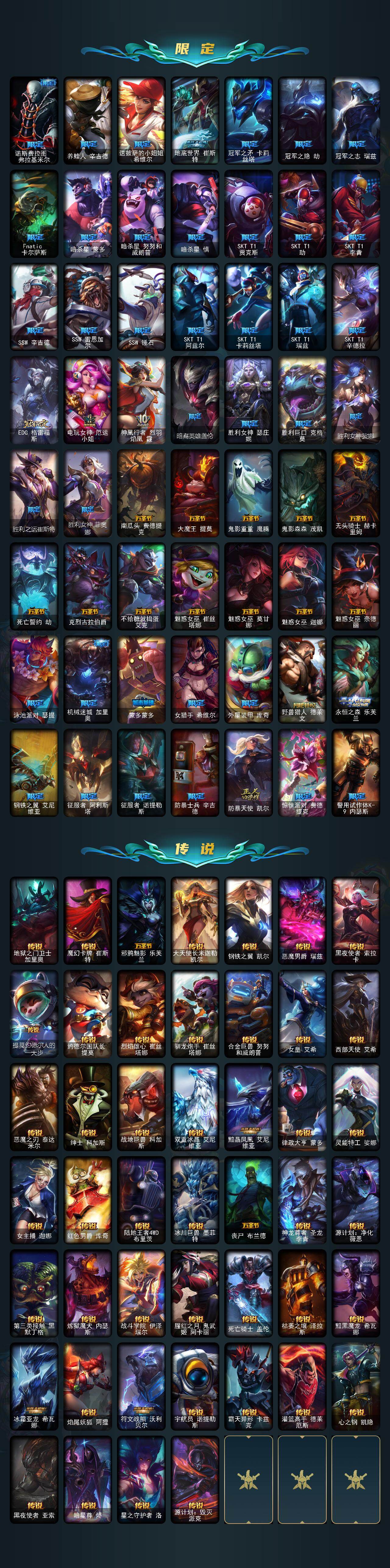 【限定皮肤】:诺斯费拉图弗拉基米尔,养蜂人辛吉德,送披萨的小姐姐希维尔,地底世界崔斯特,冠军之矛卡莉丝塔,冠军之隐劫,冠军之志瑞兹,Fnatic卡尔萨斯,暗杀星蒙多,暗杀星努努和威朗普,暗杀星慎,SKTT1贾克斯,SKTT1劫,SKTT1李青,SSW辛吉德,S