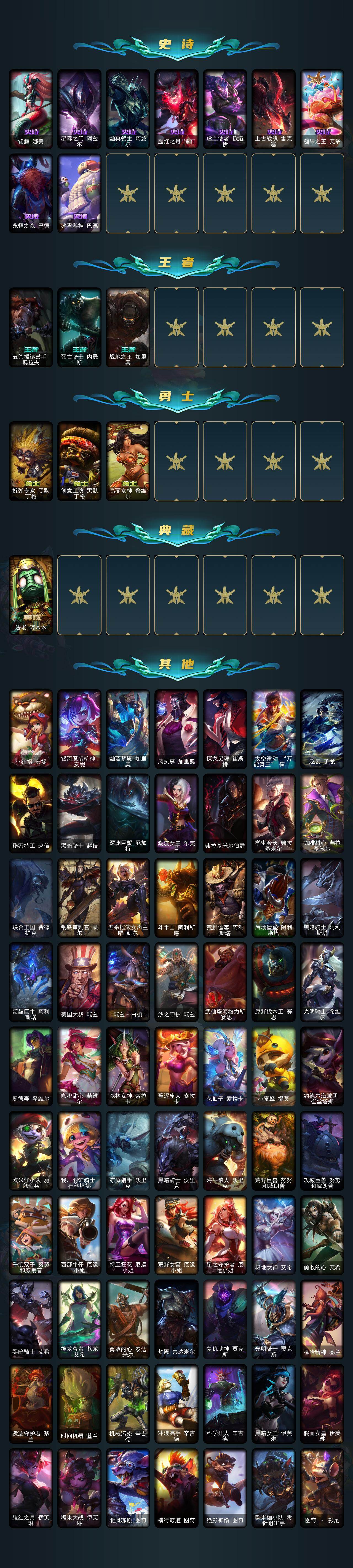 - [15284357]可二次【店主推荐捡漏号!可直接换绑】 未定级段位-147英雄-135皮肤-13炫彩-0终极-3神话-22限定-17传说-37史诗 【海克斯皮肤】:海克斯科技嘉文四世 【冰雪限定】:幸福女神乐芙兰,冰雪风暴希维尔,圣诞精灵崔丝塔娜,邪恶圣诞老人维迦,圣诞玩偶波比,圣诞老人古拉加斯,圣诞驯鹿克格莫,魄罗骑士瑟庄妮,冰雪节玛尔扎哈 【神话皮肤】:十周年纪念安妮,源代码乐芙兰,海克斯科技嘉文四世 【限定皮肤】:Fnatic嘉文四世,SKTT1婕拉,SSW图奇,胜利枪神格雷福斯,胜利之剑亚托克斯,无头骑士赫卡里姆,女猎手希维尔,暗影沃里克,勇者奈德丽,都铎王朝图奇,钢铁之翼艾尼维亚,防暴士兵格雷福斯,防暴天使凯尔 【传说皮肤】:地狱之门卫士加里奥,战场女武神凯尔,源计划林易,恶魔男爵瑞兹,合金巨兽努努和威朗普,女皇艾希,鬼魂新娘莫甘娜,绅士科加斯,电玩女神娑娜,腥红之月鬼武姬阿卡丽,枯萎之壤泽拉斯,冰霜亚龙希瓦娜,符文战熊沃利贝尔,女校长菲奥娜,金牌主播德莱文,灌篮高手德莱厄斯,暗星锤石 【史诗皮肤】:地狱火阿利斯塔,黑帮狂花厄运小姐,紫晶射手艾希,国王泰达米尔,百夫长贾克斯,殇之机器人阿木木,熔火之心拉莫斯,贵族血统萨科,飞越疯人院萨科,掠星魔刃卡萨丁,海克斯科技迦娜,穿着正装的恶魔维迦,抵抗军天使凯特琳,蓝焰梦魔魔腾,腥红之月伊莉丝,地下拳王李青,苍穹之光薇恩,法老王朝内瑟斯,钢铁烈阳蕾欧娜,至高君王玛尔扎哈,兔女郎锐雯,战国大名慎,铁血猎人雷恩加尔,皇家守卫菲奥娜,绞肉机刽子手德莱文,死亡绽放卡兹克,刀锋女王丽桑卓,血羽凤凰奎因,野火之藤婕拉,最后一只恐龙纳尔,西部牛仔亚索,猛虎布隆,银河魔装机神千珏,五星大厨塔姆,职业杀手卢锡安,虚空使者俄洛伊,暮星之羽霞 【王者皮肤】:星空之门内瑟斯 【勇士皮肤】:亮丽女神希维尔 【典藏皮肤】:法老阿木木,宗师级锻造训练师 【其他皮肤1】:赵云子龙,深渊巨蟹厄加特,弗拉基米尔侯爵,部落精神瑞兹,宗师级法师训练师瑞兹,荒野巨兽努努和威朗普,勇敢的心艾希,勇敢的心泰达米尔,梦魇泰达米尔,光明骑士贾克斯,黑暗女王伊芙琳,横行霸道图奇,梦魇科加斯,情绪摇滚阿木木,小丑工作坊萨科,健美教练蒙多,缪斯女神娑娜,深海一号卡萨丁,凌云之翼艾瑞莉娅,老兵普朗克,里尔击球手特朗德尔,荒野治安官凯特琳,银白枪骑布里茨,赏金猎人卡特琳娜,荒野之咬雷克顿