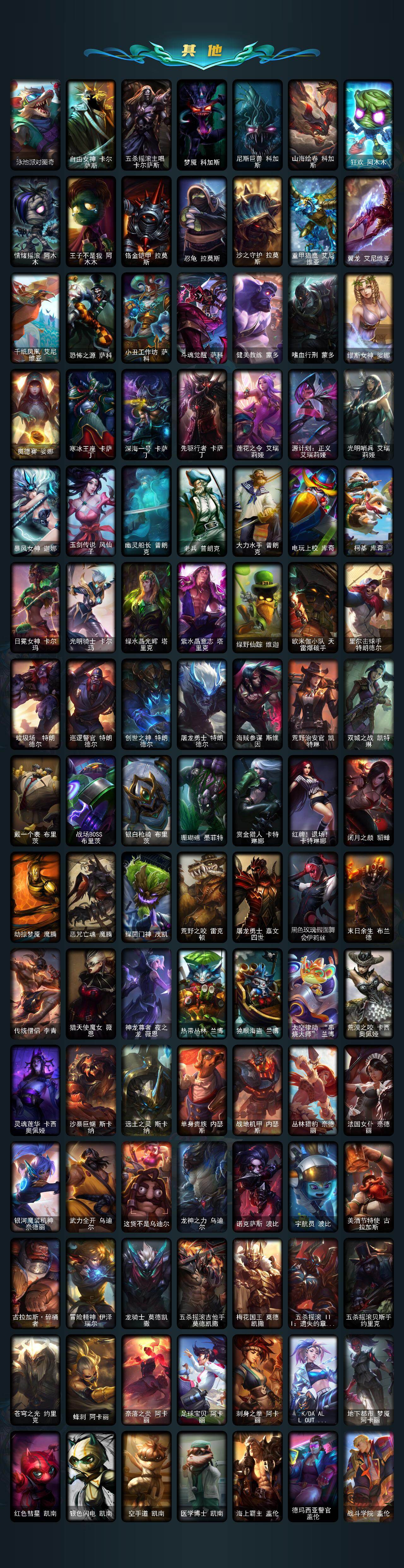 【冰雪限定】:幸福女神乐芙兰,冰雪风暴希维尔,圣诞开心鬼提莫,圣诞精灵崔丝塔娜,圣诞狂欢努努和威朗普,圣诞狂欢基兰,胡桃夹子萨科,平安夜女神娑娜,冬季仙境卡尔玛,邪恶圣诞老人维迦,喜庆之树茂凯,圣诞玩偶波比,圣诞老人古拉加斯,圣诞驯鹿克格莫,雪球也能爆炸吉格斯,圣诞老人德莱文,冰雪女神辛德拉,北极星神黛安娜