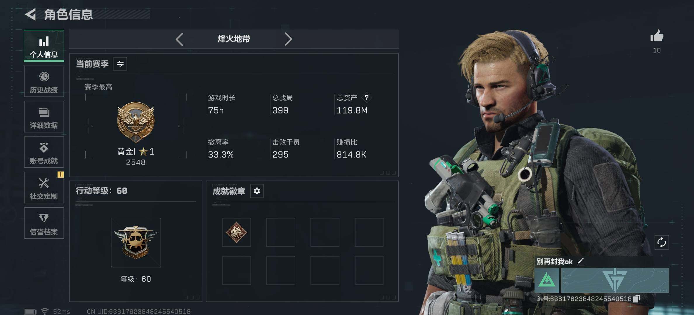 [14744632]【店主推荐捡漏好!可直接换绑】119m总资产-8414k哈伏币-60烽火等级-黄金-7战场等级-列兵