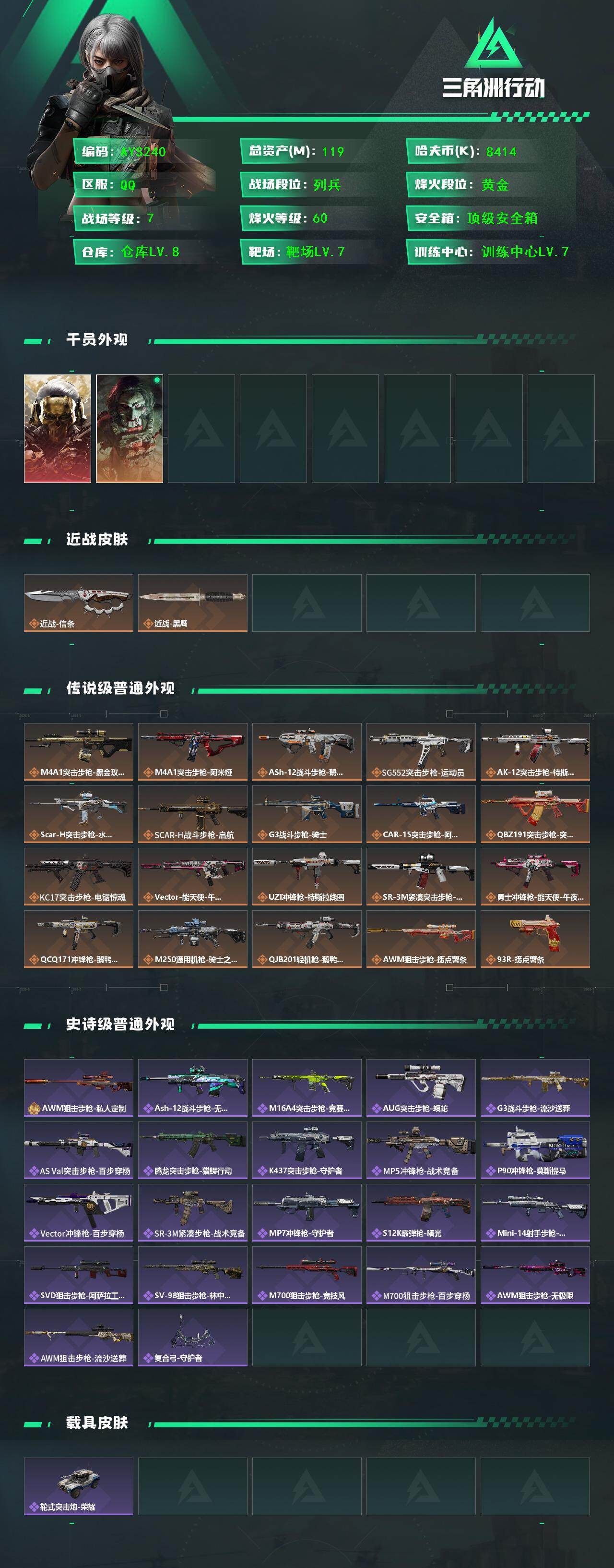 [14744632]【店主推荐捡漏好!可直接换绑】119m总资产-8414k哈伏币-60烽火等级-黄金-7战场等级-列兵 【干员外观】:红狼-蚀金玫瑰,红狼-电锯惊魂 【近战皮肤】:近战-信条,近战-黑鹰 【传说外观】:M4A1突击步枪-蚀金玫瑰,M4A1突击步枪-阿米娅,ASh-12战斗步枪-鹅鸭杀,SG552突击步枪-运动员,AK-12突击步枪-特斯拉线圈,SCAR-H战斗步枪-水墨云图,SCAR-H战斗步枪-启航,G3战斗步枪-骑士,CAR-15突击步枪-阿米娅,腾龙突击步枪-捞点薯条,KC17突击步枪-电锯惊魂,Vector冲锋枪-能天使-午夜邮差,UZI冲锋枪-特斯拉线圈,SR-3M紧凑突击步枪-特斯拉线圈,勇士冲锋枪-能天使-午夜邮差,QCQ171冲锋枪-鹅鸭杀,M250通用机枪-骑士之心,QJB201轻机枪-鹅鸭杀,AWM狙击步枪-捞点薯条,93R-捞点薯条 【史诗外观】:AWM狙击步枪-私人定制,ASh-12战斗步枪-无极限,M16A4突击步枪-竞赛选手,AUG突击步枪-蝮蛇,G3战斗步枪-流沙送葬,AS Val突击步枪-百步穿杨,腾龙突击步枪-猎鳄行动,K437突击步枪-守护者,MP5冲锋枪-战术竞备,P90冲锋枪-莫斯提马,Vector冲锋枪-百步穿杨,SR-3M紧凑突击步枪-战术竞备,MP7冲锋枪-守护者,S12K霰弹枪-曙光,Mini-14射手步枪-守护者,SVD狙击步枪-阿萨拉工艺,SV-98狙击步枪-林中猎手,M700狙击步枪-竞技风,M700狙击步枪-百步穿杨,AWM狙击步枪-无极限,AWM狙击步枪-流沙送葬,复合弓-守护者 【稀有外观】:M1014霰弹枪-花岗岩,M4A1突击步枪-零点,M4A1突击步枪-繁盛,AKM突击步枪-战术演练,AKM突击步枪-肃杀,QBZ95-1突击步枪-公平竞技,ASh-12战斗步枪-繁盛,K416突击步枪-碳纤维,AUG突击步枪-前沿科技,M7战斗步枪-捣蛋鬼,AK-12突击步枪-零点,SCAR-H战斗步枪-荣耀列队,SCAR-H战斗步枪-黄昏,G3战斗步枪-战术演练,G3战斗步枪-主宰,腾龙突击步枪-冰天雪地,MP5冲锋枪-弄臣,MP5冲锋枪-虎啸,MP5冲锋枪-哈夫克卫队,P90冲锋枪-黄昏,P90冲锋枪-捣蛋鬼,Vector冲锋枪-先锋,UZI冲锋枪-亚特兰蒂斯,SMG-45-行动开启,SMG-45冲锋枪-幻影结构,
