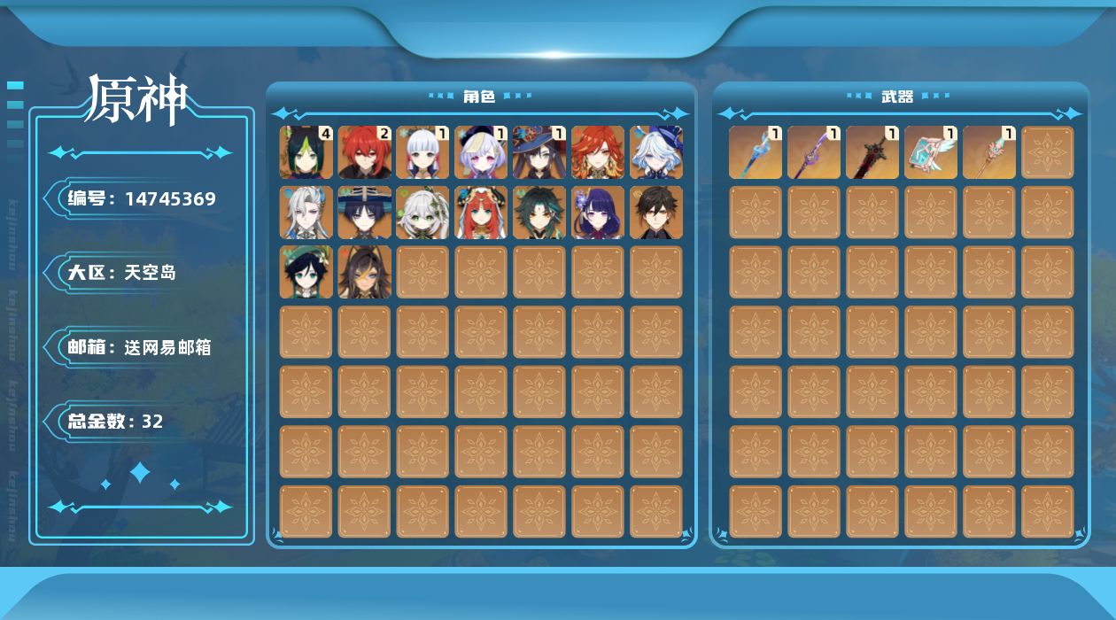 [14745369]59级/32黄/女主/17个五星角色/6个五星武器 0命芙宁娜,0命那维莱特,0命迪希雅,0命流浪者,0命纳西妲,0命妮露,4命提纳里,0命雷电将军,1命神里绫华,0命钟离,0命魈,0命温迪,1命七七,1命莫娜,2命迪卢克,0命玛薇卡,0命奈芙尔,精1静水流涌之辉,精1薙草之稻光,精1天空之脊,精1天空之卷,精1狼的末路,精1真语秘匣