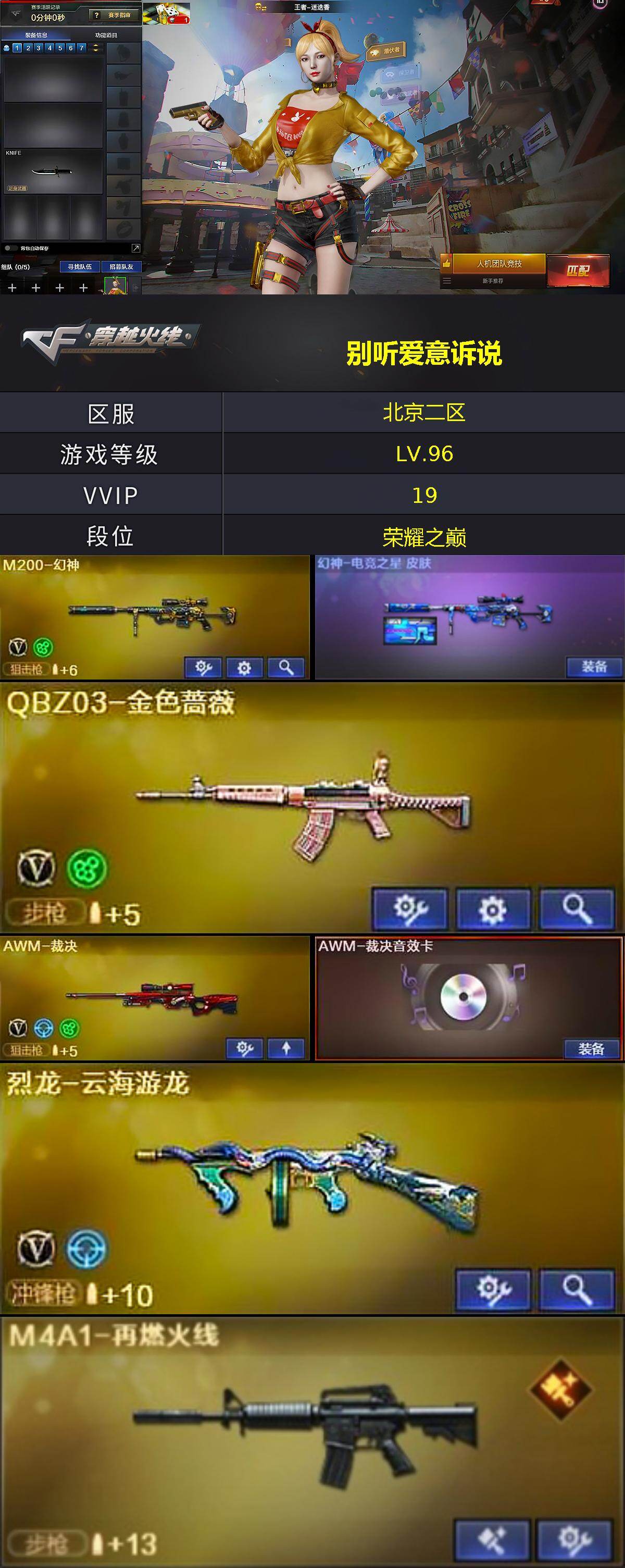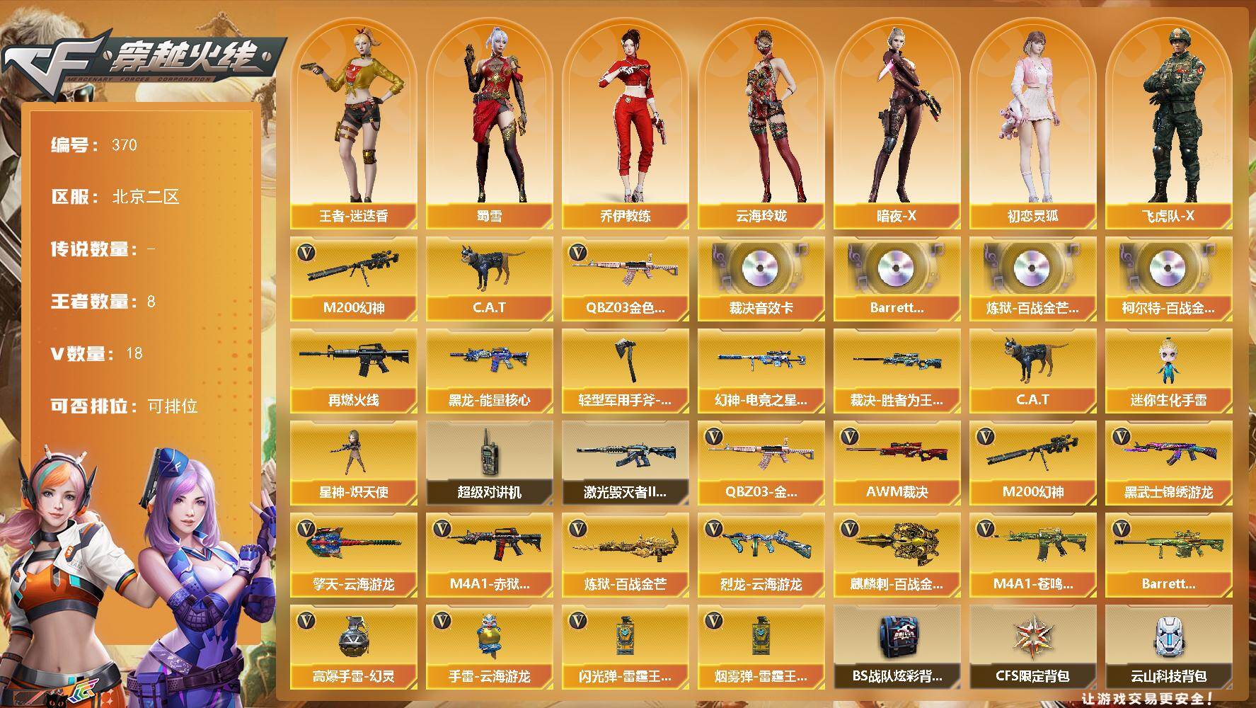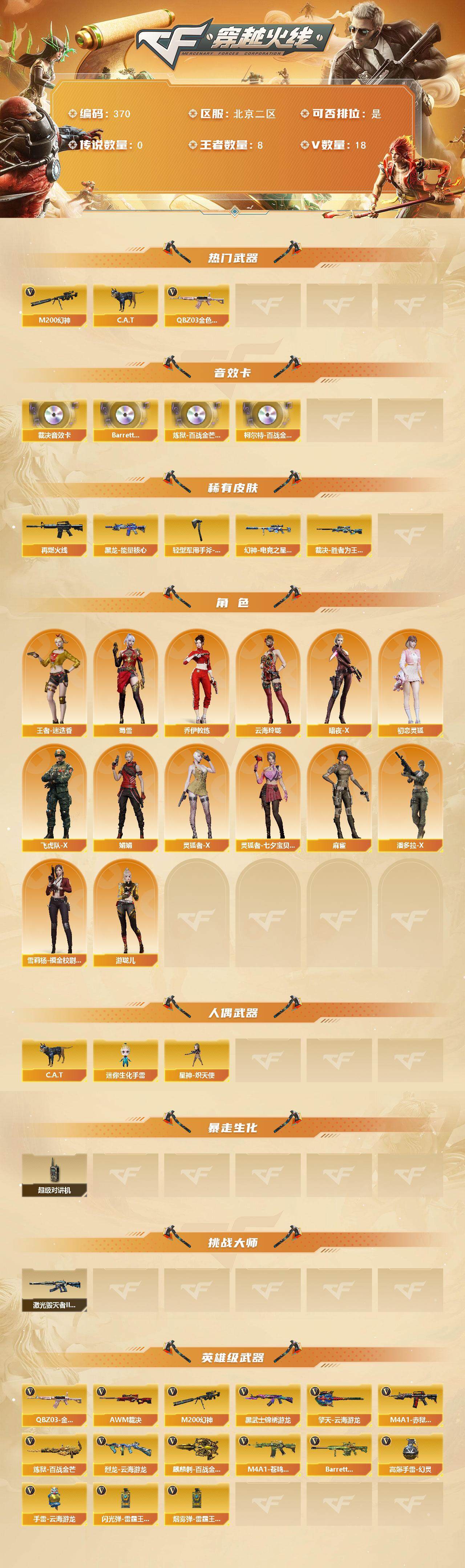 [14729214]北京二区-18V-8王者-0炫金 【热门武器】:QBZ03-金色蔷薇,M200-幻神,C.A.T 【音效卡】:AWM-裁决音效卡,Barrett-碧霄极光音效卡,炼狱-百战金芒-庆典舞曲音效卡,柯尔特-百战金芒-庆典舞曲音效卡 【皮肤】:幻神-电竞之星 皮肤,裁决-胜者为王 皮肤,M4A1-再燃火线,黑龙-能量核心,轻型军用手斧-再燃火线 【角色】:王者-迷迭香,乔伊教练,云海玲珑,暗夜-X,初恋灵狐,飞虎队-X,娟娟,灵狐者-X,灵狐者-七夕宝贝,麻雀,潘多拉-X,蜀雪,雪莉杨-摸金校尉,游珑儿 【人偶武器】:星神-炽天使,C.A.T,迷你生化手雷 【暴走生化】:超级对讲机 【挑战大师】:激光毁灭者III-白马银枪 【英雄级武器】:黑武士-锦绣游龙,QBZ03-金色蔷薇,AWM-裁决,M200-幻神,炼狱-百战金芒,烈龙-云海游龙,擎天-云海游龙,麒麟刺-百战金芒,高爆手雷-幻灵,手雷-云海游龙,闪光弹-雷霆王者-觉醒版*5,烟雾弹-雷霆王者-觉醒版,M4A1-赤狱骑士,M4A1-苍鸣雷神,Barrett-碧霄极光 【道具】:BS战队炫彩背包,CFS限定背包,云山科技背包,云海游龙炫彩背包,百战金芒炫彩背包,超级背包,女皇终结者-魔龙之吻,救世主-黑桃战神,绿色巨人,灵魂忍者,迷雾幽灵,生化弹匣,夺命之镰,防化服*3,金色流光-枪王排位,星辰流光-枪王排位,流光-鎏金之域,枪王排位28赛季金色流光,枪王排位29赛季金色流光,语音特效-盛典烟火,萌萌小葵表情,云海游龙表情,C4-沙漠,防弹头盔*3,防弹衣*3,C4工具钳*3,手雷包*3 【特殊枪械】: