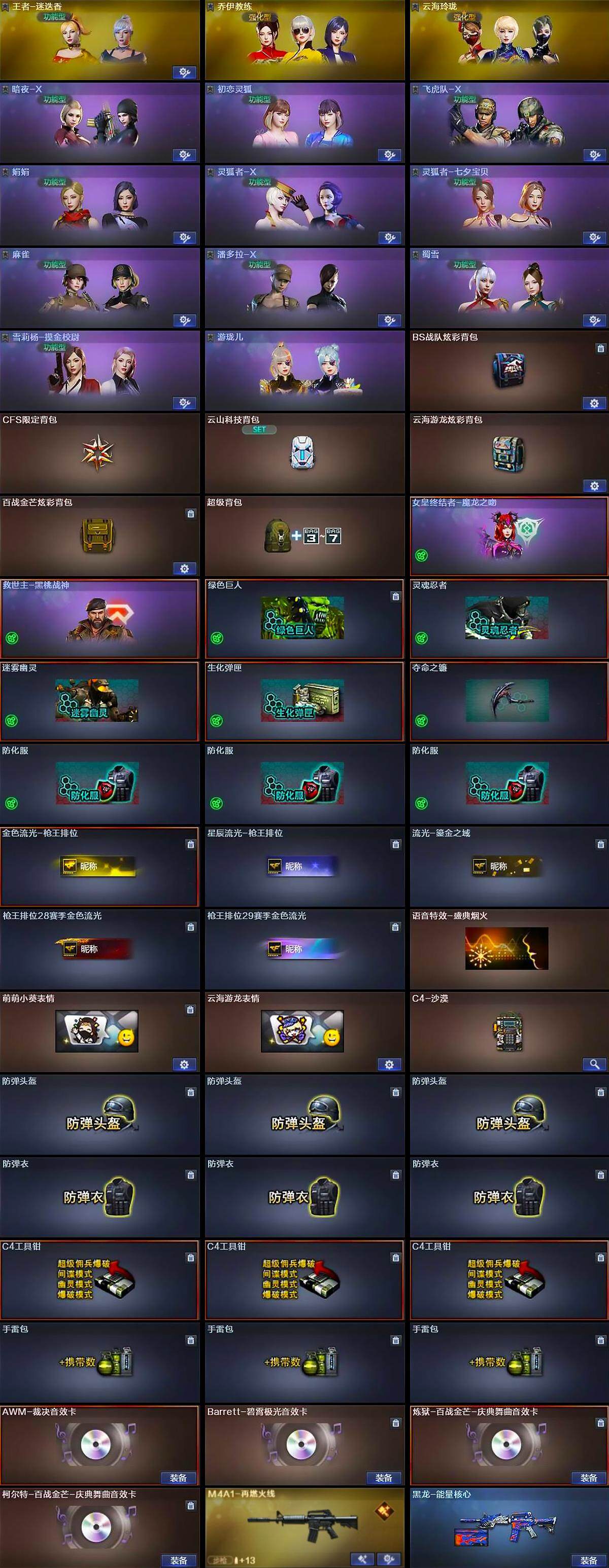 【道具】:BS战队炫彩背包,CFS限定背包,云山科技背包,云海游龙炫彩背包,百战金芒炫彩背包,超级背包,女皇终结者-魔龙之吻,救世主-黑桃战神,绿色巨人,灵魂忍者,迷雾幽灵,生化弹匣,夺命之镰,防化服*3,金色流光-枪王排位,星辰流光-枪王排位,流光-鎏金之域,枪王排位28赛季金色流光,枪王排位29赛季金色流光,语音特效-盛典烟火,萌萌小葵表情,云海游龙表情,C4-沙漠,防弹头盔*3,防弹衣*3,C4工具钳*3,手雷包*3