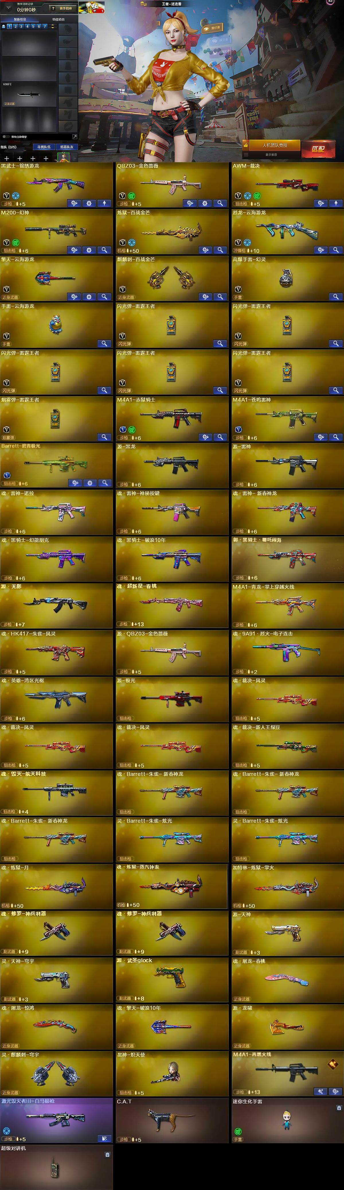 【英雄级武器】:黑武士-锦绣游龙,QBZ03-金色蔷薇,AWM-裁决,M200-幻神,炼狱-百战金芒,烈龙-云海游龙,擎天-云海游龙,麒麟刺-百战金芒,高爆手雷-幻灵,手雷-云海游龙,闪光弹-雷霆王者-觉醒版*5,烟雾弹-雷霆王者-觉醒版,M4A1-赤狱骑士,M4A1-苍鸣雷神,Barrett-碧霄极光