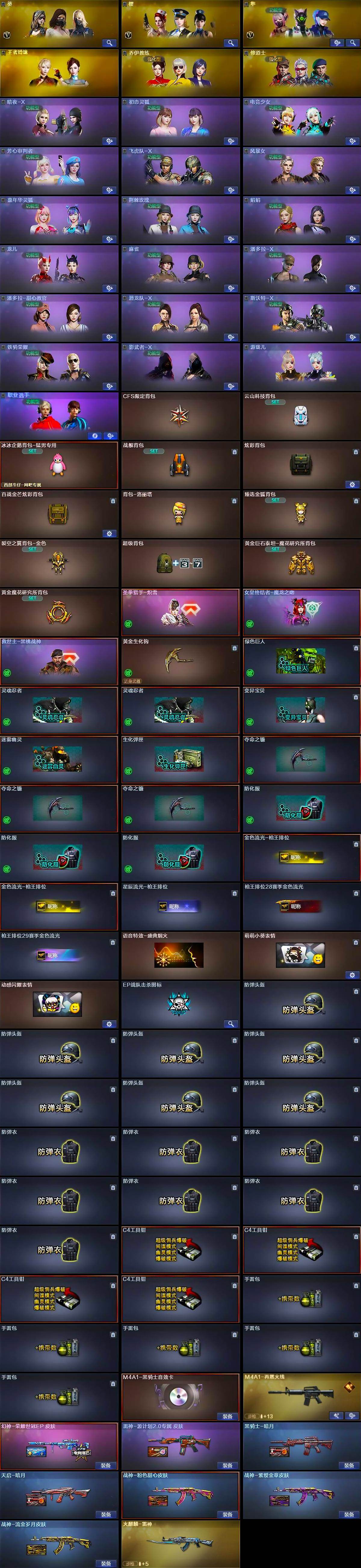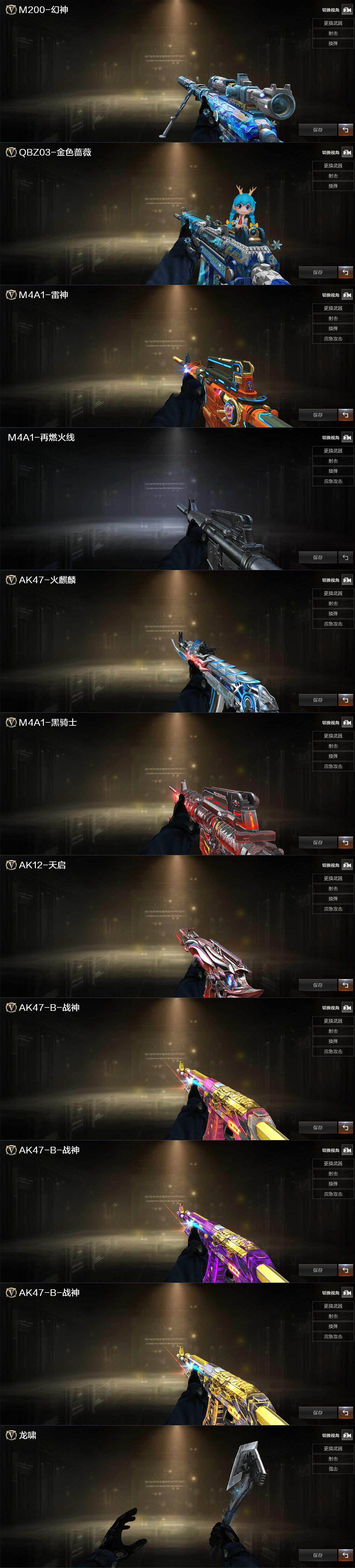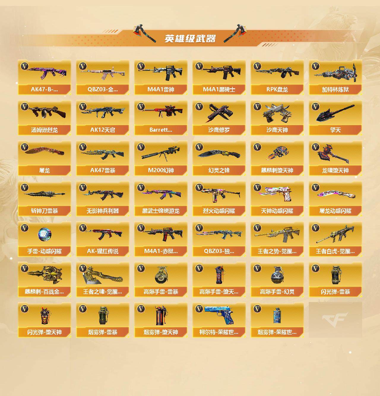 【英雄级武器】:M4A1-雷神,M4A1-黑骑士*5,AK12-天启,AK47-雷暴,无影-神兵利器,黑武士-锦绣游龙,QBZ03-独角-V,QBZ03-金色蔷薇,烈火-动感闪耀,王者之势-觉醒版,AK-47-猩红传说,AK47-B-常胜将军,王者白虎-觉醒版,Barrett-极光,M200-幻神,RPK-盘龙*5,加特林-炼狱,汤姆逊-烈龙*6,沙鹰-修罗,沙鹰-天神,柯尔特-荣耀世冠EP,天神-动感闪耀,屠龙,麒麟刺-堕天神,擎天,幻灵之锋,屠龙-动感闪耀,龙啸-堕天神,斩神刀-雷暴,麒麟刺-百战金芒,王者之啸-觉醒版,高爆手雷-雷暴*3,高爆手雷-堕天神*2,高爆手雷-幻灵,