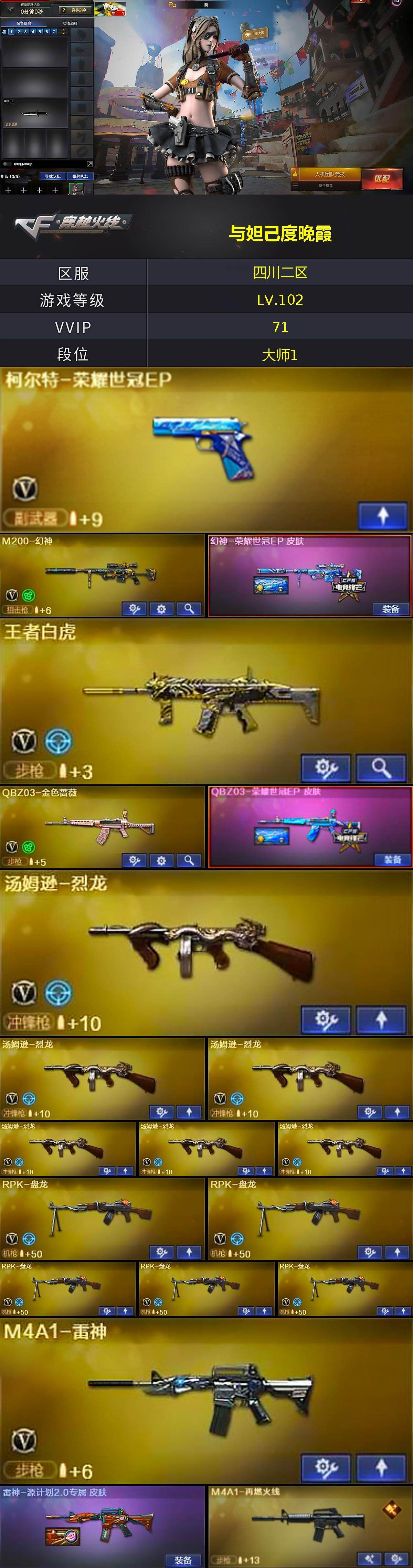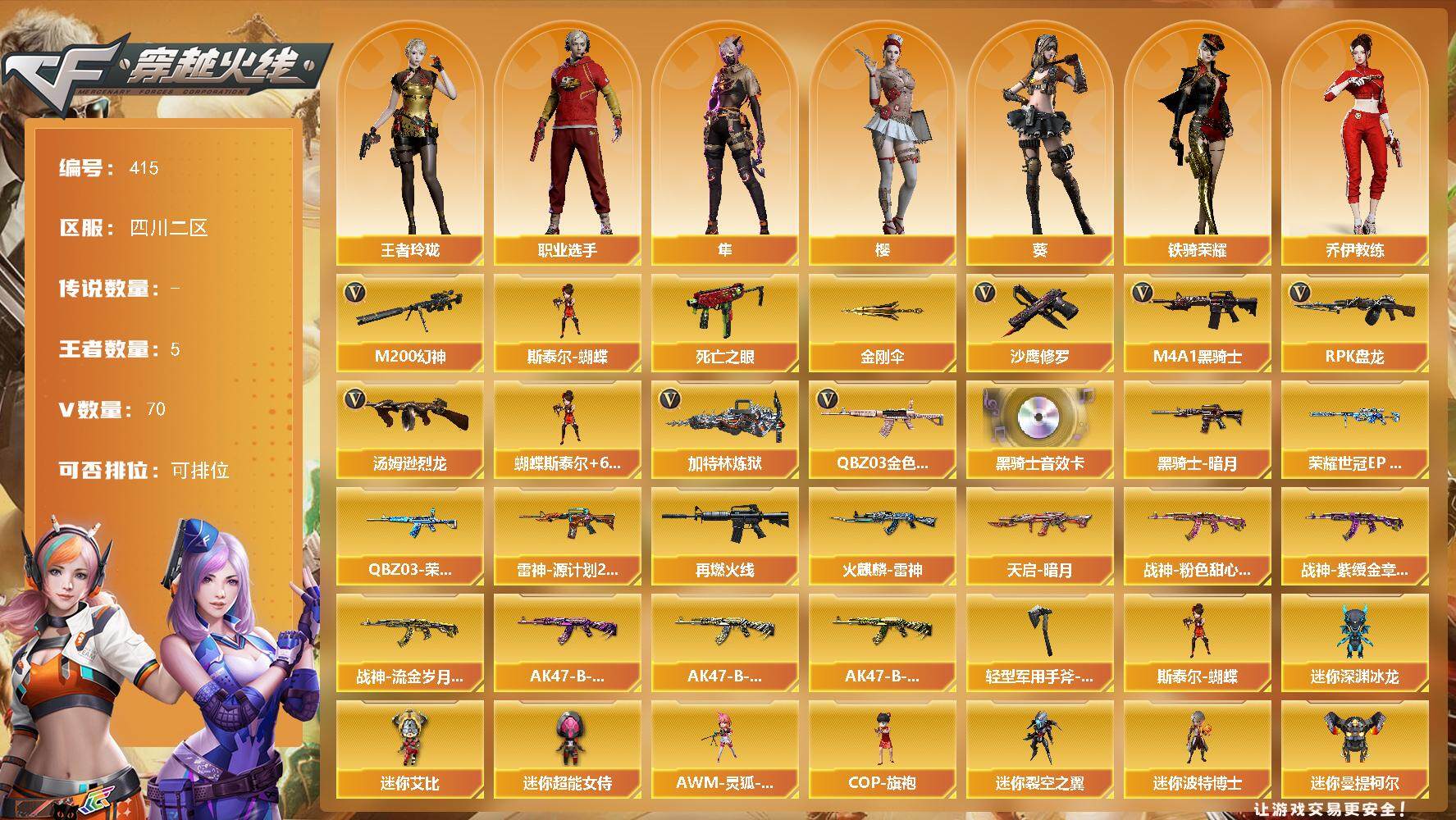 [14609586]四川二区-70V-5王者-0炫金 【热门武器】:QBZ03-金色蔷薇,M200-幻神,死亡之眼,M4A1-黑骑士*5,汤姆逊-烈龙*6,RPK-盘龙*5,加特林-炼狱,斯泰尔-蝴蝶,沙鹰-修罗,金刚伞 【音效卡】:M4A1-黑骑士音效卡 【皮肤】:幻神-荣耀世冠EP 皮肤,QBZ03-荣耀世冠EP 皮肤,雷神-源计划2.0专属 皮肤,M4A1-再燃火线,火麒麟-雷神,黑骑士-暗月,天启-暗月,战神-粉色甜心皮肤,战神-紫绶金章皮肤,战神-流金岁月皮肤,AK47-B-常胜将军-曹操,AK47-B-常胜将军-刘备,AK47-B-常胜将军-孙权,轻型军用手斧-再燃火线 【角色】:葵,樱,隼,王者玲珑,乔伊教练,修道士,暗夜-X,初恋灵狐,电竞少女,芳心审判者,飞虎队-X,风暴女,嘉年华灵狐,荆棘玫瑰,娟娟,0号玩家,龙儿,麻雀,潘多拉-X,潘多拉-甜心教官,潜龙队-X,邱刚敖,斯沃特-X,铁骑荣耀,影武者-X,游珑儿,职业选手 【人偶武器】:斯泰尔-蝴蝶,加特林-机械猎手,AWM-灵狐-15周年嘉年华,COP-旗袍,迷你深渊冰龙,迷你裂空之翼*3,迷你波特博士*3,迷你曼提柯尔,迷你牛牛,迷你火种,迷你生化手雷*3,生化手雷-机甲核心,闪光弹-貂蝉,巴雷特-赏金猎人,迷你艾比,迷你超能女侍 【暴走生化】:黑龙吞噬者,死亡之眼,超级对讲机 【挑战大师】:暴君乱世-超越Max,神圣爆裂者III*2,冰龙粉碎者-白马银枪*2,激光毁灭者III-白马银枪,激光毁灭者III,机甲撕裂者III*2,试炼破坏者III,KAC-圣炎切割者III,神圣爆裂者-末日III,阐释者III*2,VEPR-12-紫魔 【英雄级武器】:M4A1-雷神,M4A1-黑骑士*5,AK12-天启,AK47-雷暴,无影-神兵利器,黑武士-锦绣游龙,QBZ03-独角-V,QBZ03-金色蔷薇,烈火-动感闪耀,王者之势-觉醒版,AK-47-猩红传说,AK47-B-常胜将军,王者白虎-觉醒版,Barrett-极光,M200-幻神,RPK-盘龙*5,加特林-炼狱,汤姆逊-烈龙*6,沙鹰-修罗,沙鹰-天神,柯尔特-荣耀世冠EP,天神-动感闪耀,屠龙,麒麟刺-堕天神,擎天,幻灵之锋,屠龙-动感闪耀,龙啸-堕天神,斩神刀-雷暴,麒麟刺-百战金芒,王者之啸-觉醒版,高爆手雷-雷暴*3,高爆手雷-堕天神*2,高爆手雷-幻灵,