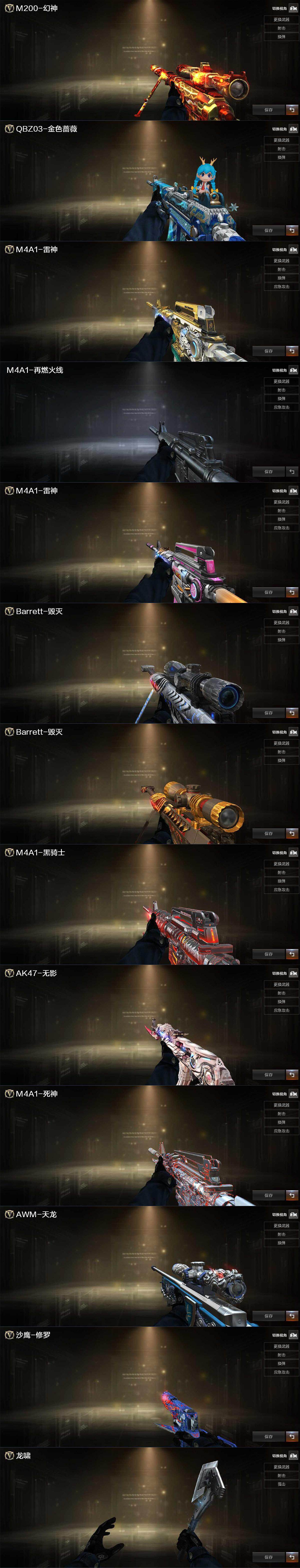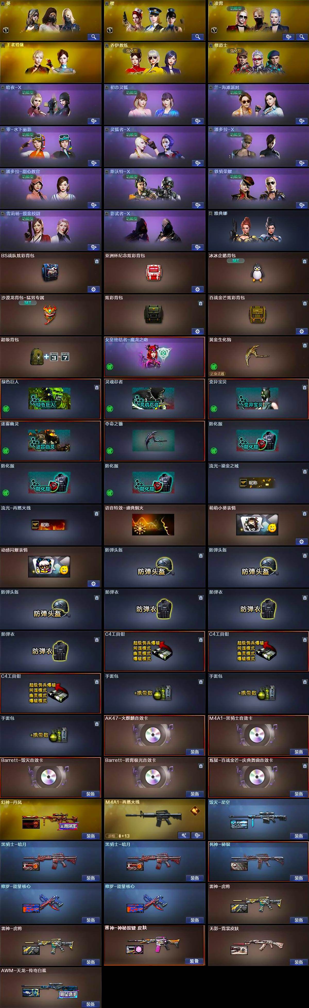 【英雄级武器】:M4A1-千变*4,AK47-火麒麟*6,M4A1-黑龙,M4A1-雷神*2,M4A1-黑骑士*3,AK47-黑武士*4,AK12-天启*6,AK47-黑鲨*2,M4A1-龙血*5,M4A1-夜魔*2,QBZ03-金色蔷薇,王者之魄-觉醒版,白虎-电玩蓝兔,黑武士-CF网剧冠军,AWM-天龙*6,Barrett-毁灭*2,Barrett-极光,AWM-裁决*2,Barrett-金色蔷薇,王者之力-觉醒版,王者幻神-觉醒版,加特林-炼狱*4,炼狱-百战金芒,汤姆逊-烈龙*11,AA-12-雷霆,沙鹰-修罗*3,沙鹰-天神*7,COP-堕天神,破空枪刃-夜魔,柯尔特-荣耀世冠EP,天神-CF网剧冠军,屠龙,龙啸*2,马来剑-夜魔,擎天*3,麒麟刺*4,擎天-CF网剧冠军,麒麟刺-百战金芒,王者之啸-觉醒版,高爆手雷-夜魔*7,闪光弹-夜魔*7,烟雾弹-夜