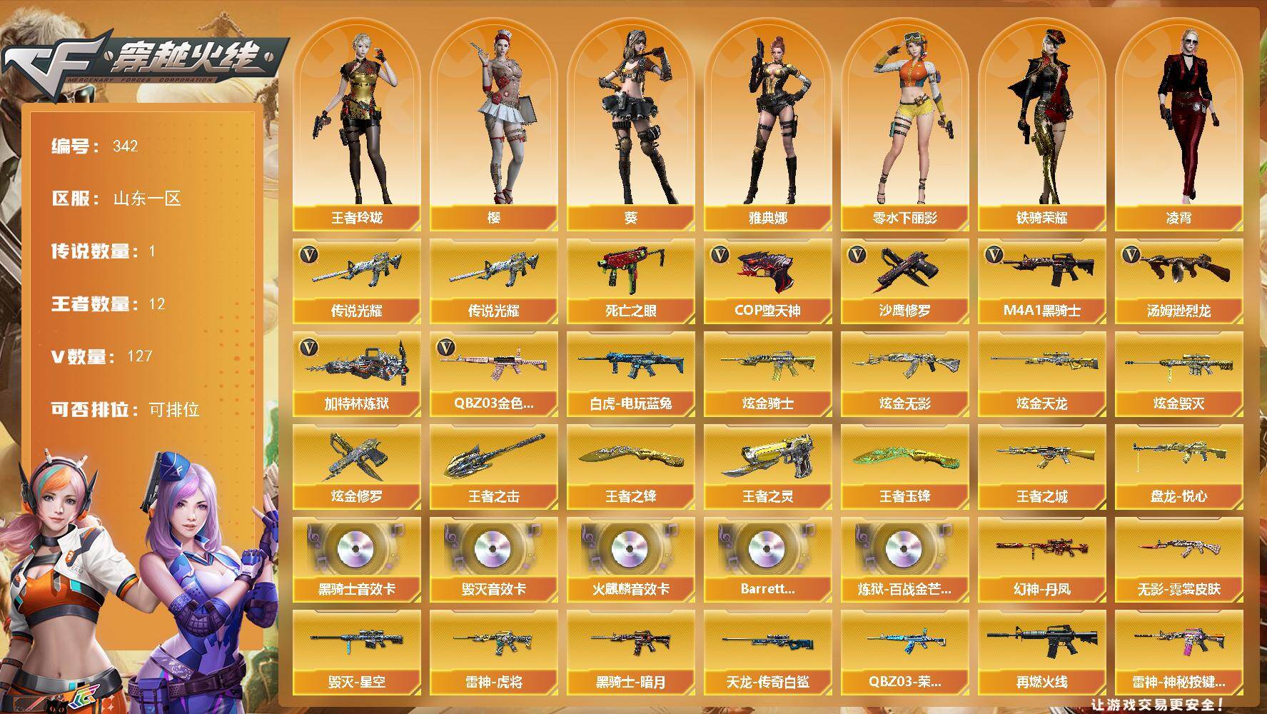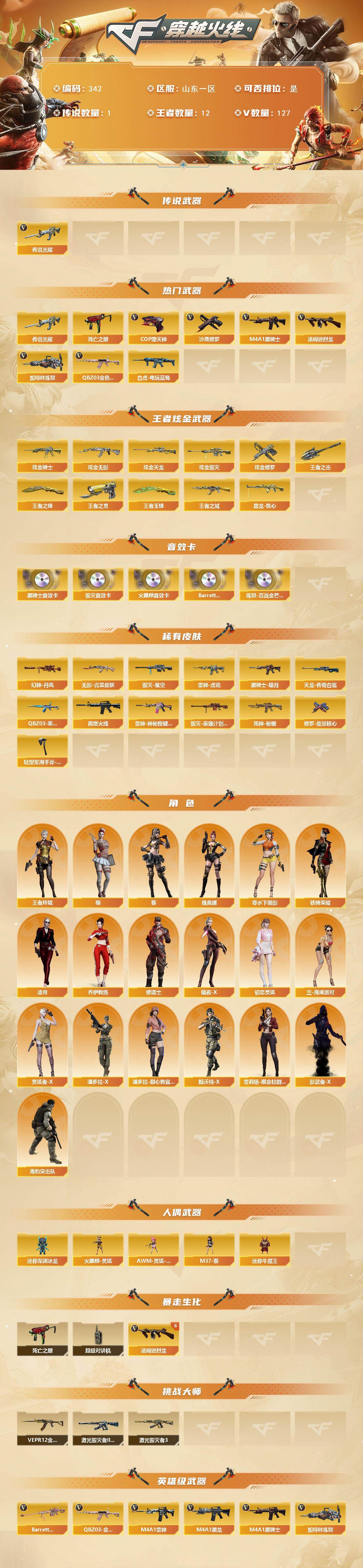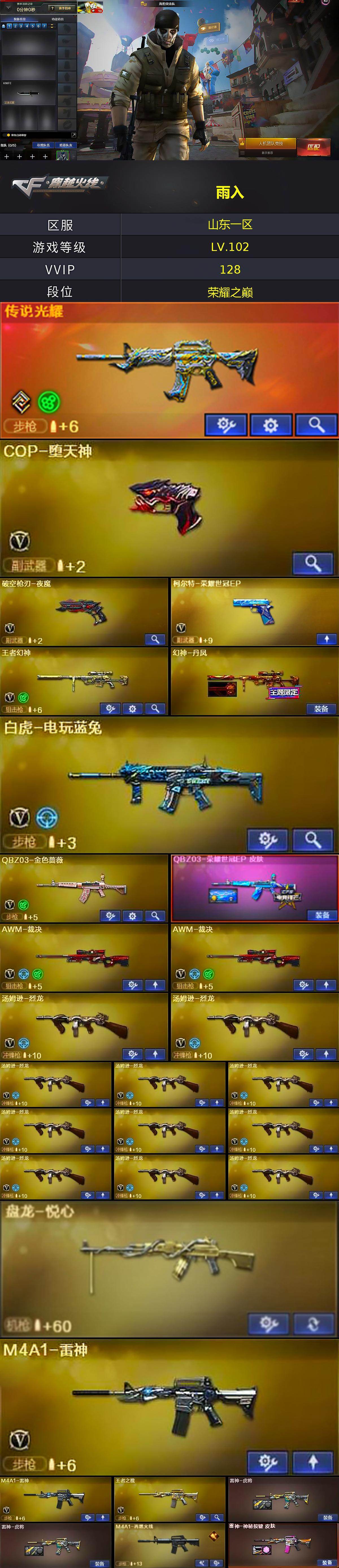[14732801]山东一区-127V-12王者-11炫金 【传说武器】:传说光耀 【热门武器】:传说光耀,QBZ03-金色蔷薇,死亡之眼*4,白虎-电玩蓝兔,M4A1-黑骑士*3,汤姆逊-烈龙*11,加特林-炼狱*4,COP-堕天神,沙鹰-修罗*3 【王者炫金武器】:王者之城,盘龙-悦心,王者之灵,王者之击,王者之锋,王者玉锋,炫金骑士*2,炫金无影,炫金毁灭*2,炫金天龙*5,炫金修罗 【音效卡】:AK47-火麒麟音效卡,M4A1-黑骑士音效卡,Barrett-毁灭音效卡,Barrett-碧霄极光音效卡,炼狱-百战金芒-庆典舞曲音效卡 【皮肤】:幻神-丹凤,QBZ03-荣耀世冠EP 皮肤,雷神-虎将*2,M4A1-再燃火线,雷神-神秘按键 皮肤,毁灭-星空,毁灭-英雄计划 皮肤,黑骑士-暗月*2,无影-霓裳皮肤,死神-秘银,AWM-天龙-传奇白鲨,修罗-能量核心*2,轻型军用手斧-再燃火线 【角色】:葵,樱,凌霄,王者玲珑,乔伊教练,修道士,暗夜-X,初恋灵狐,兰-海滩派对,零-水下丽影,灵狐者-X,潘多拉-X,潘多拉-甜心教官,斯沃特-X,铁骑荣耀,雪莉杨-摸金校尉,影武者-X,雅典娜,海豹突击队 【人偶武器】:火麒麟-灵狐,AWM-灵狐-15周年嘉年华,M37-葵,迷你深渊冰龙,迷你牛魔王 【暴走生化】:死亡之眼*4,超级对讲机 【挑战大师】:激光毁灭者III-白马银枪,VEPR-12-金魔*2,激光毁灭者III 【英雄级武器】:M4A1-千变*4,AK47-火麒麟*6,M4A1-黑龙,M4A1-雷神*2,M4A1-黑骑士*3,AK47-黑武士*4,AK12-天启*6,AK47-黑鲨*2,M4A1-龙血*5,M4A1-夜魔*2,QBZ03-金色蔷薇,王者之魄-觉醒版,白虎-电玩蓝兔,黑武士-CF网剧冠军,AWM-天龙*6,Barrett-毁灭*2,Barrett-极光,AWM-裁决*2,Barrett-金色蔷薇,王者之力-觉醒版,王者幻神-觉醒版,加特林-炼狱*4,炼狱-百战金芒,汤姆逊-烈龙*11,AA-12-雷霆,沙鹰-修罗*3,沙鹰-天神*7,COP-堕天神,破空枪刃-夜魔,柯尔特-荣耀世冠EP,天神-CF网剧冠军,屠龙,龙啸*2,马来剑-夜魔,擎天*3,麒麟刺*4,擎天-CF网剧冠军,麒麟刺-百战金芒,王者之啸-觉醒版,高爆手雷-夜魔*7,闪光弹-夜魔*7,烟雾弹-夜