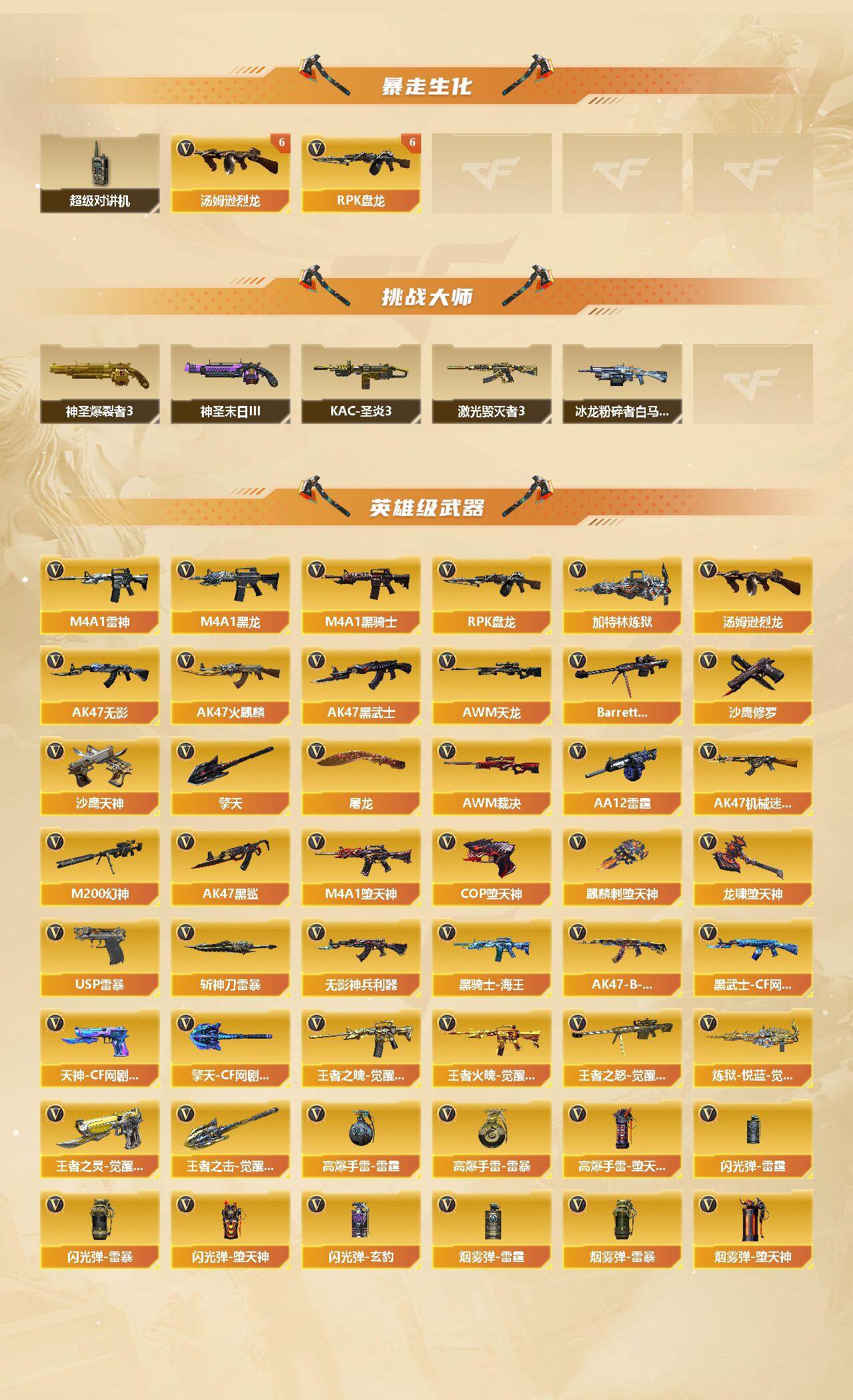 【英雄级武器】:AK47-火麒麟*3,M4A1-黑龙*2,M4A1-雷神*2,M4A1-黑骑士*2,AK47-无影*3,AK47-黑武士*4,AK47-机械迷城,AK47-黑鲨*2,M4A1-堕天神,无影-神兵利器,王者之魄-觉醒版,AK47-B-战神,王者火魄-觉醒版,黑骑士-海王,黑武士-CF网剧冠军,AWM-天龙*2,Barrett-毁灭*5,AWM-裁决*2,M200-