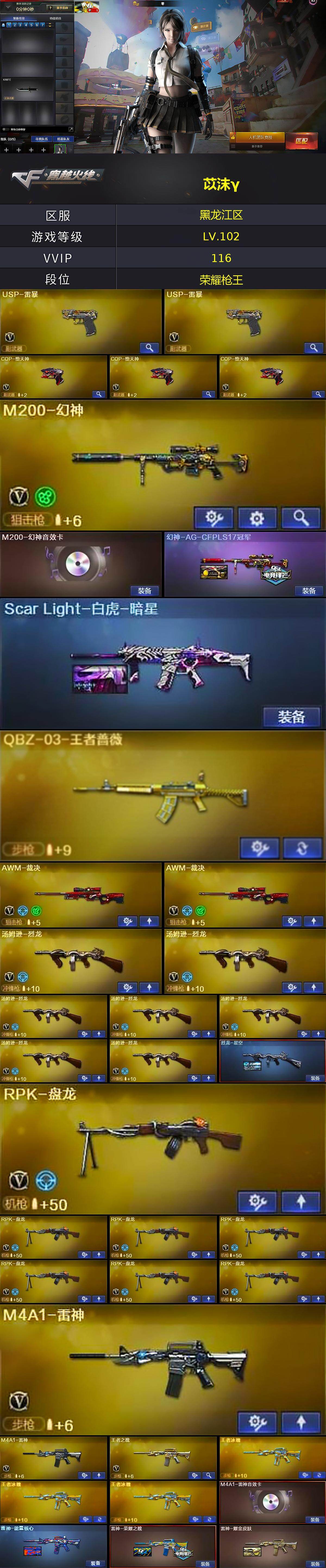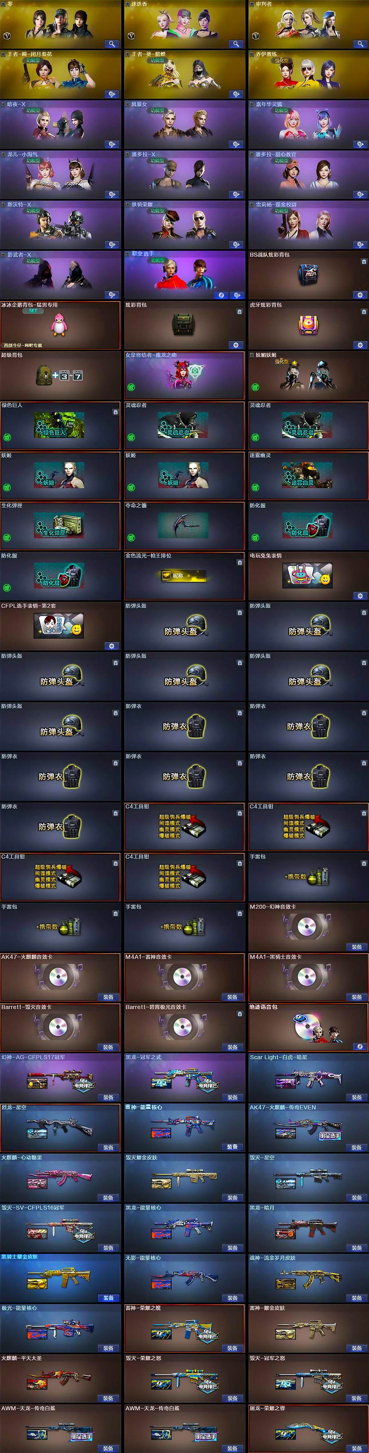 【皮肤】:幻神-AG-CFPLS17冠军,Scar Light-白虎-暗星,烈龙-星空,雷神-能量核心,雷神-荣耀之魄,雷神-耀金皮肤,AK47-火麒麟-传奇EVEN,火麒麟-平天大圣,火麒麟-心动糖果,毁灭-荣耀之怒,毁灭耀金皮肤,毁灭-星空,毁灭-冠军之怒,毁灭-SV-CFPLS16冠军,毁灭-英雄计划 皮肤,黑龙-能量核心,黑龙-暗月,黑龙-冠军之武,黑骑士耀金皮肤,无影-能量核心,战神-流金岁月皮肤,AWM-天龙-传奇白鲨*2,极光-能量核心,屠龙-荣耀之锋