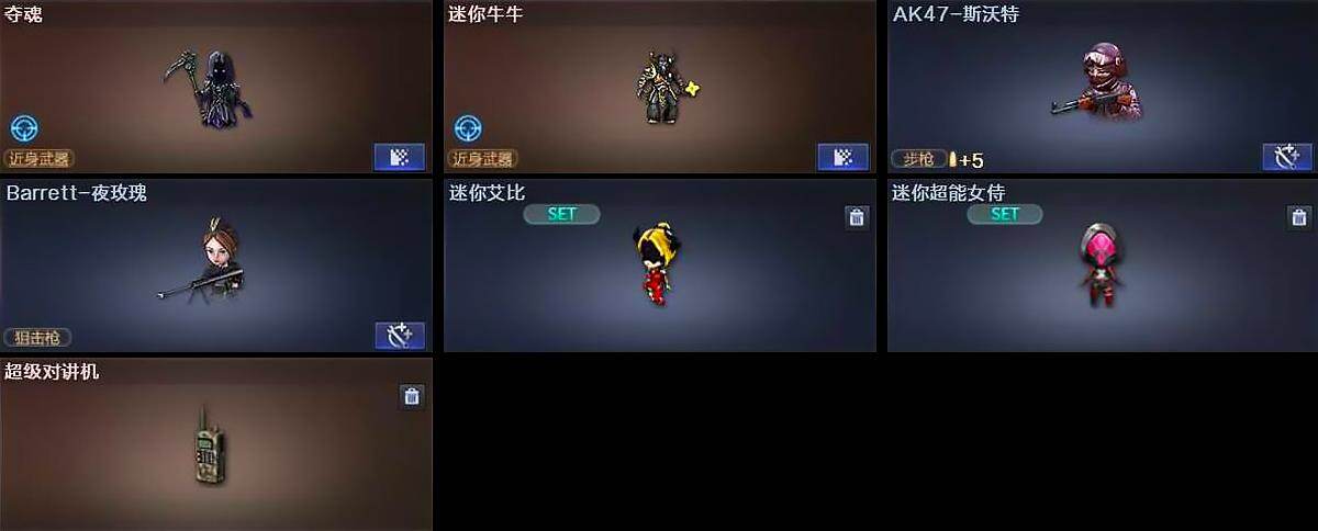 【人偶武器】:火麒麟-绝迹,火麒麟-灵狐,斯泰尔-蝴蝶,巴雷特-零-水下丽影,AWM-灵狐-15周年嘉年华*2,迷你深渊冰龙*2,迷你裂空之翼,夺魂,迷你牛牛,AK47-斯沃特,Barrett-夜玫瑰,迷你艾比,迷你超能女侍