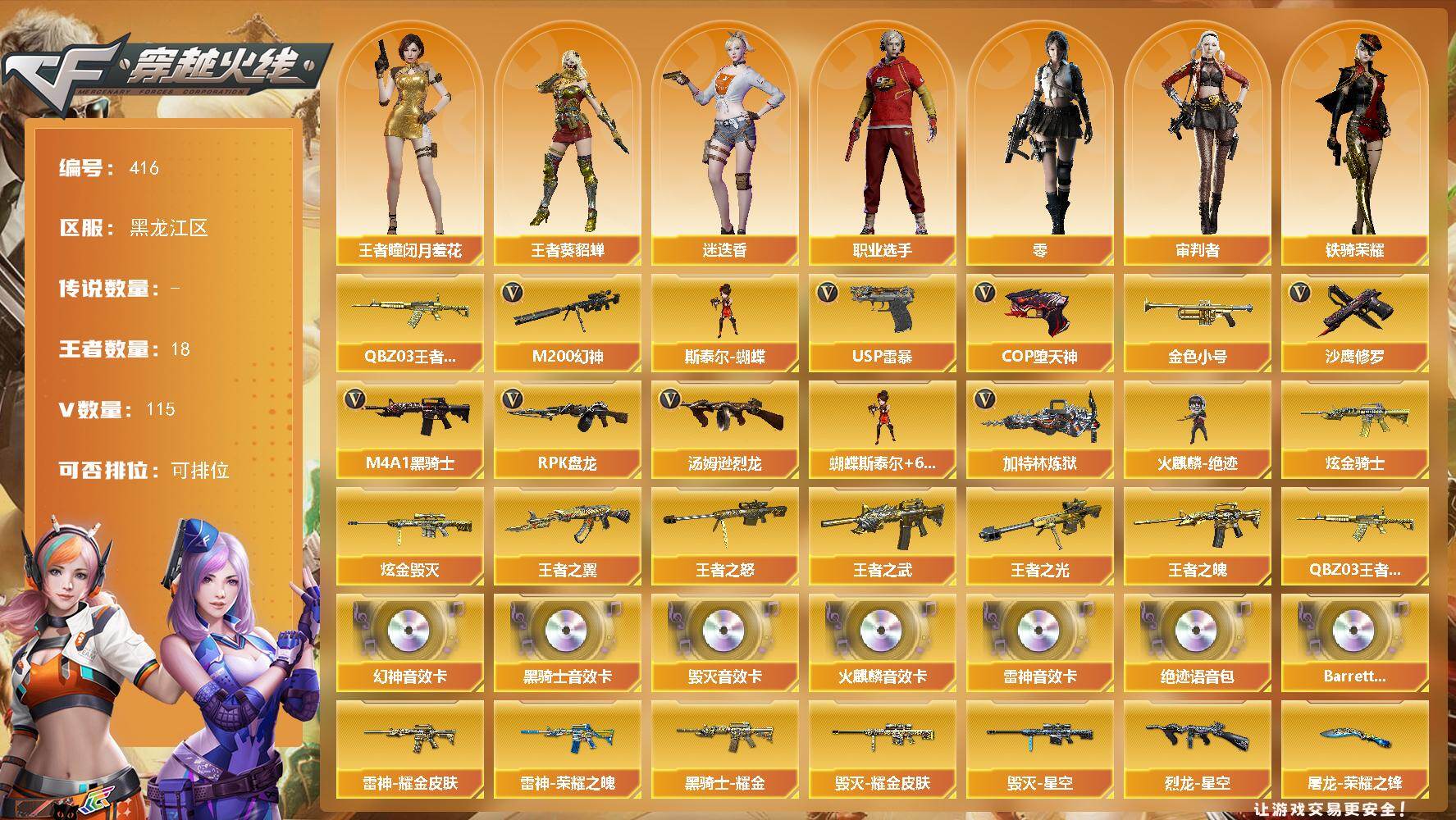 [14639397]黑龙江区-115V-18王者-2炫金 【热门武器】:M200-幻神,QBZ-03-王者蔷薇,金色小号,M4A1-黑骑士*2,汤姆逊-烈龙*7,RPK-盘龙*7,加特林-炼狱,斯泰尔-蝴蝶,火麒麟-绝迹,USP-雷暴*2,COP-堕天神*3,沙鹰-修罗*3 【王者炫金武器】:王者之翼,王者之武,王者之魄*3,QBZ-03-王者蔷薇,王者之光,王者之怒*2,炫金骑士,炫金毁灭 【音效卡】:M200-幻神音效卡,AK47-火麒麟音效卡,M4A1-雷神音效卡,M4A1-黑骑士音效卡,Barrett-毁灭音效卡,绝迹语音包,Barrett-碧霄极光音效卡 【皮肤】:幻神-AG-CFPLS17冠军,Scar Light-白虎-暗星,烈龙-星空,雷神-能量核心,雷神-荣耀之魄,雷神-耀金皮肤,AK47-火麒麟-传奇EVEN,火麒麟-平天大圣,火麒麟-心动糖果,毁灭-荣耀之怒,毁灭耀金皮肤,毁灭-星空,毁灭-冠军之怒,毁灭-SV-CFPLS16冠军,毁灭-英雄计划 皮肤,黑龙-能量核心,黑龙-暗月,黑龙-冠军之武,黑骑士耀金皮肤,无影-能量核心,战神-流金岁月皮肤,AWM-天龙-传奇白鲨*2,极光-能量核心,屠龙-荣耀之锋 【角色】:零,迷迭香,审判者,王者-瞳-闭月羞花,王者-葵-貂蝉,乔伊教练,暗夜-X,风暴女,嘉年华灵狐,龙儿-小淘气,潘多拉-X,潘多拉-甜心教官,斯沃特-X,铁骑荣耀,雪莉杨-摸金校尉,影武者-X,职业选手 【人偶武器】:火麒麟-绝迹,火麒麟-灵狐,斯泰尔-蝴蝶,巴雷特-零-水下丽影,AWM-灵狐-15周年嘉年华*2,迷你深渊冰龙*2,迷你裂空之翼,夺魂,迷你牛牛,AK47-斯沃特,Barrett-夜玫瑰,迷你艾比,迷你超能女侍 【暴走生化】:超级对讲机 【挑战大师】:神圣爆裂者III,冰龙粉碎者-白马银枪*2,激光毁灭者III,KAC-圣炎切割者III,神圣爆裂者-末日III*2 【英雄级武器】:AK47-火麒麟*3,M4A1-黑龙*2,M4A1-雷神*2,M4A1-黑骑士*2,AK47-无影*3,AK47-黑武士*4,AK47-机械迷城,AK47-黑鲨*2,M4A1-堕天神,无影-神兵利器,王者之魄-觉醒版,AK47-B-战神,王者火魄-觉醒版,黑骑士-海王,黑武士-CF网剧冠军,AWM-天龙*2,Barrett-毁灭*5,AWM-裁决*2,M200-