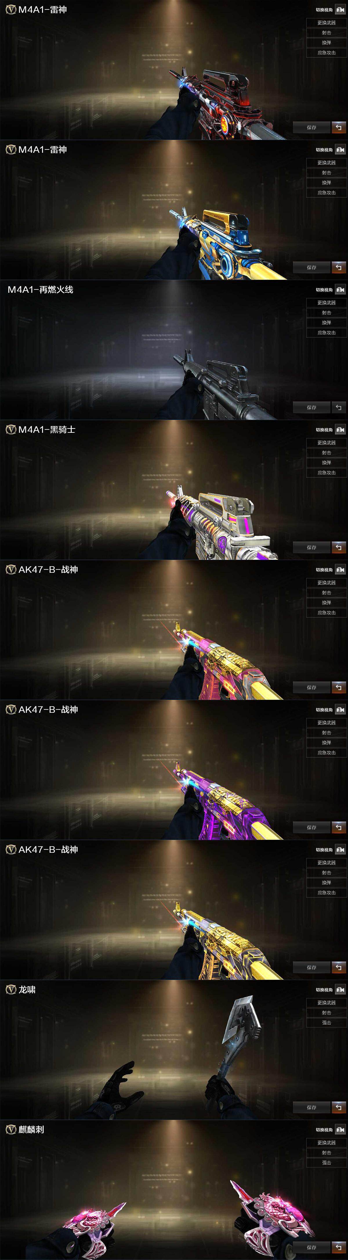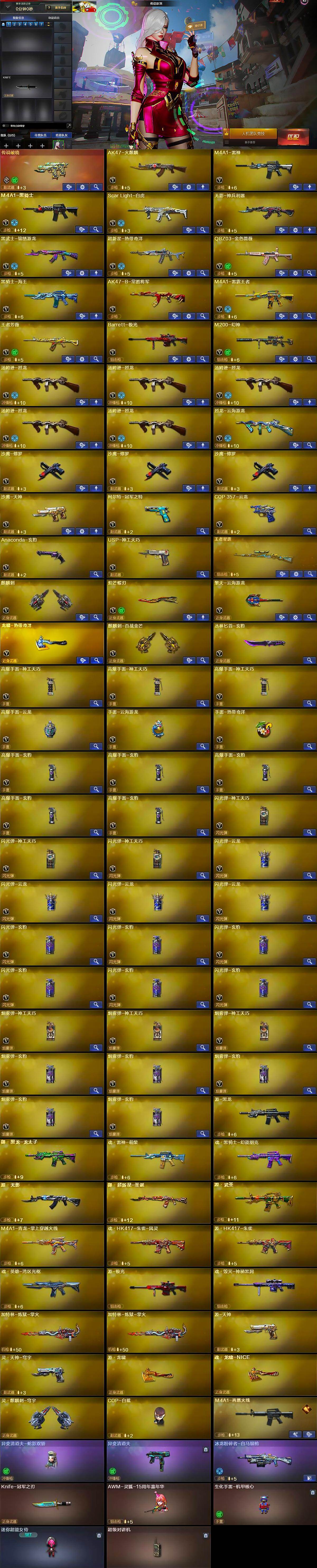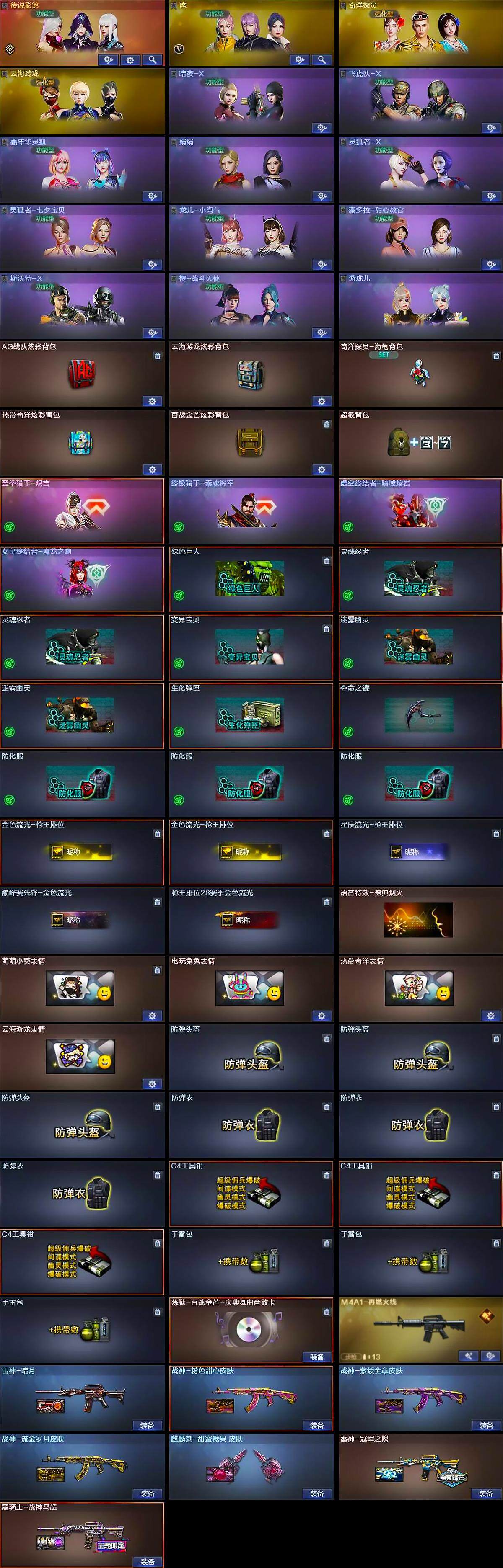 【英雄级武器】:AK47-火麒麟,M4A1-雷神,M4A1-黑骑士,Scar Light-白虎,无影-神兵利器,黑武士-锦绣游龙,超新星-热带奇洋,QBZ03-金色蔷薇,黑骑士-海王,AK47-B-常胜将军,M4A1-雷霆王者-觉醒版,王者芳薇-觉醒版,Barrett-极光,M200-幻神,汤姆逊-烈龙*5,烈龙-云海游龙,沙鹰-修罗*3,沙鹰-天神,柯尔特-冠军之特,COP 357-云龙,Anaconda-玄豹,USP-神工天巧,麒麟刺,炽芒蝶刃,擎天-云海游龙,龙啸-热带奇洋,麒麟刺-百战金芒,丛林匕首-玄豹,高爆手雷-神工天巧*3,高爆手雷-云龙,手雷-云海游龙,手雷-热带奇洋,高爆手雷-玄豹*5,闪光弹-神工天巧*3,闪光弹-云龙*4,闪光弹-玄豹*6,烟雾弹-神工天巧*3,烟雾弹-玄豹*5