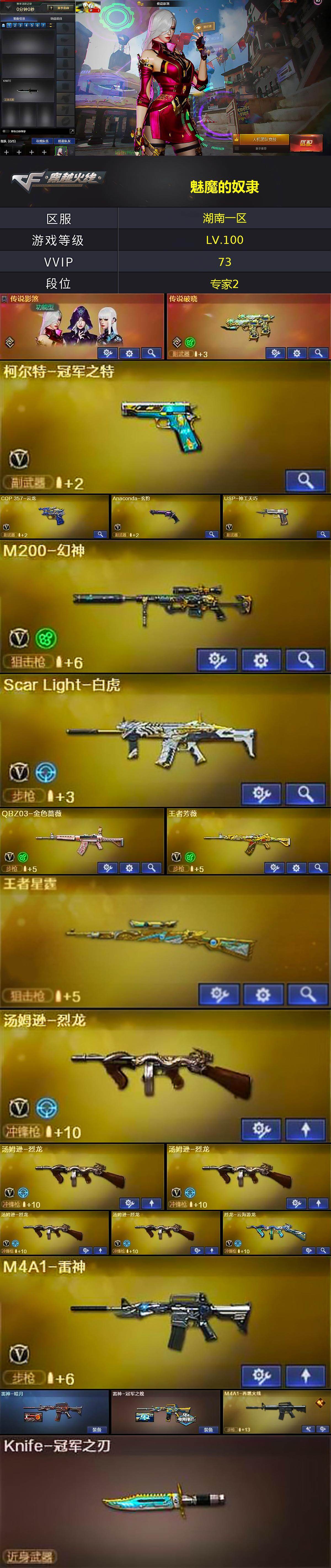【热门武器】:传说破晓,QBZ03-金色蔷薇,Scar Light-白虎,M200-幻神,柯尔特-冠军之特,M4A1-黑骑士,汤姆逊-烈龙*5,COP-白鲨,沙鹰-修罗*3,Knife-冠军之刃,炽芒蝶刃
