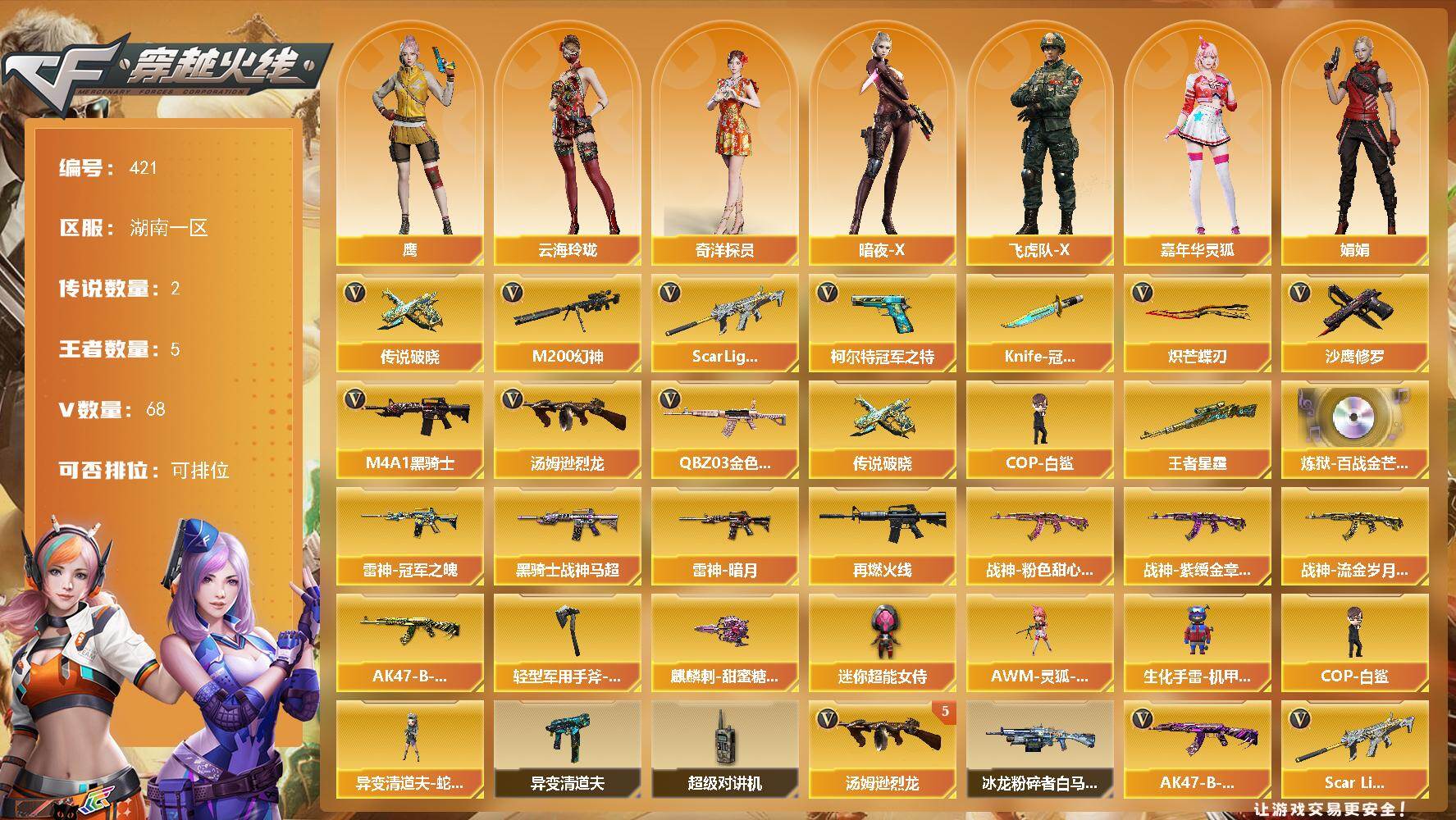 [14611405]湖南一区-68V-5王者-0炫金 【传说武器】:传说破晓 【传说角色】:传说影煞 【热门武器】:传说破晓,QBZ03-金色蔷薇,Scar Light-白虎,M200-幻神,柯尔特-冠军之特,M4A1-黑骑士,汤姆逊-烈龙*5,COP-白鲨,沙鹰-修罗*3,Knife-冠军之刃,炽芒蝶刃 【王者炫金武器】:王者星霆 【音效卡】:炼狱-百战金芒-庆典舞曲音效卡 【皮肤】:雷神-暗月,雷神-冠军之魄,M4A1-再燃火线,黑骑士-战神马超,战神-粉色甜心皮肤,战神-紫绶金章皮肤,战神-流金岁月皮肤,AK47-B-常胜将军-孙权,轻型军用手斧-再燃火线,麒麟刺-甜蜜糖果 皮肤 【角色】:鹰,奇洋探员,云海玲珑,暗夜-X,飞虎队-X,嘉年华灵狐,娟娟,灵狐者-X,灵狐者-七夕宝贝,龙儿-小淘气,潘多拉-甜心教官,斯沃特-X,兔囡囡,樱-战斗天使,游珑儿 【人偶武器】:COP-白鲨,异变清道夫-蛇影双骄,AWM-灵狐-15周年嘉年华,生化手雷-机甲核心,迷你超能女侍 【暴走生化】:异变清道夫,超级对讲机 【挑战大师】:冰龙粉碎者-白马银枪 【英雄级武器】:AK47-火麒麟,M4A1-雷神,M4A1-黑骑士,Scar Light-白虎,无影-神兵利器,黑武士-锦绣游龙,超新星-热带奇洋,QBZ03-金色蔷薇,黑骑士-海王,AK47-B-常胜将军,M4A1-雷霆王者-觉醒版,王者芳薇-觉醒版,Barrett-极光,M200-幻神,汤姆逊-烈龙*5,烈龙-云海游龙,沙鹰-修罗*3,沙鹰-天神,柯尔特-冠军之特,COP 357-云龙,Anaconda-玄豹,USP-神工天巧,麒麟刺,炽芒蝶刃,擎天-云海游龙,龙啸-热带奇洋,麒麟刺-百战金芒,丛林匕首-玄豹,高爆手雷-神工天巧*3,高爆手雷-云龙,手雷-云海游龙,手雷-热带奇洋,高爆手雷-玄豹*5,闪光弹-神工天巧*3,闪光弹-云龙*4,闪光弹-玄豹*6,烟雾弹-神工天巧*3,烟雾弹-玄豹*5 【道具】:AG战队炫彩背包,云海游龙炫彩背包,奇洋探员-海龟背包,热带奇洋炫彩背包,百战金芒炫彩背包,超级背包,圣拳猎手-炽雪,终极猎手-秦魂将军,虚空终结者-暗域熔岩,女皇终结者-魔龙之吻,绿色巨人,灵魂忍者*2,变异宝贝,迷雾幽灵*2,生化弹匣,夺命之镰,防化服*3,金色流光-枪王排位*2,星辰流光-枪王排位,巅峰赛先锋-金色流光,枪王排位2