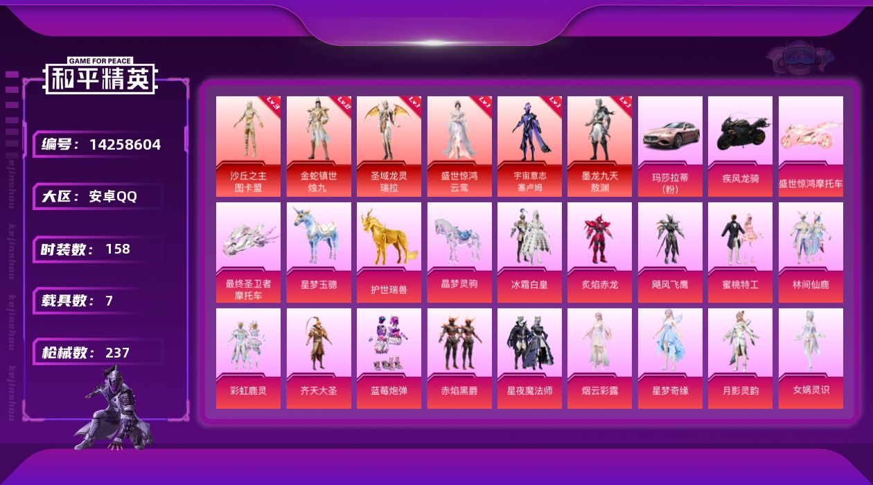 [14258604]安卓 手Q-6神装-20粉装-19特效枪-7载具-16粉色飞行器-98718热力值-5王牌印记-158套装-237枪皮